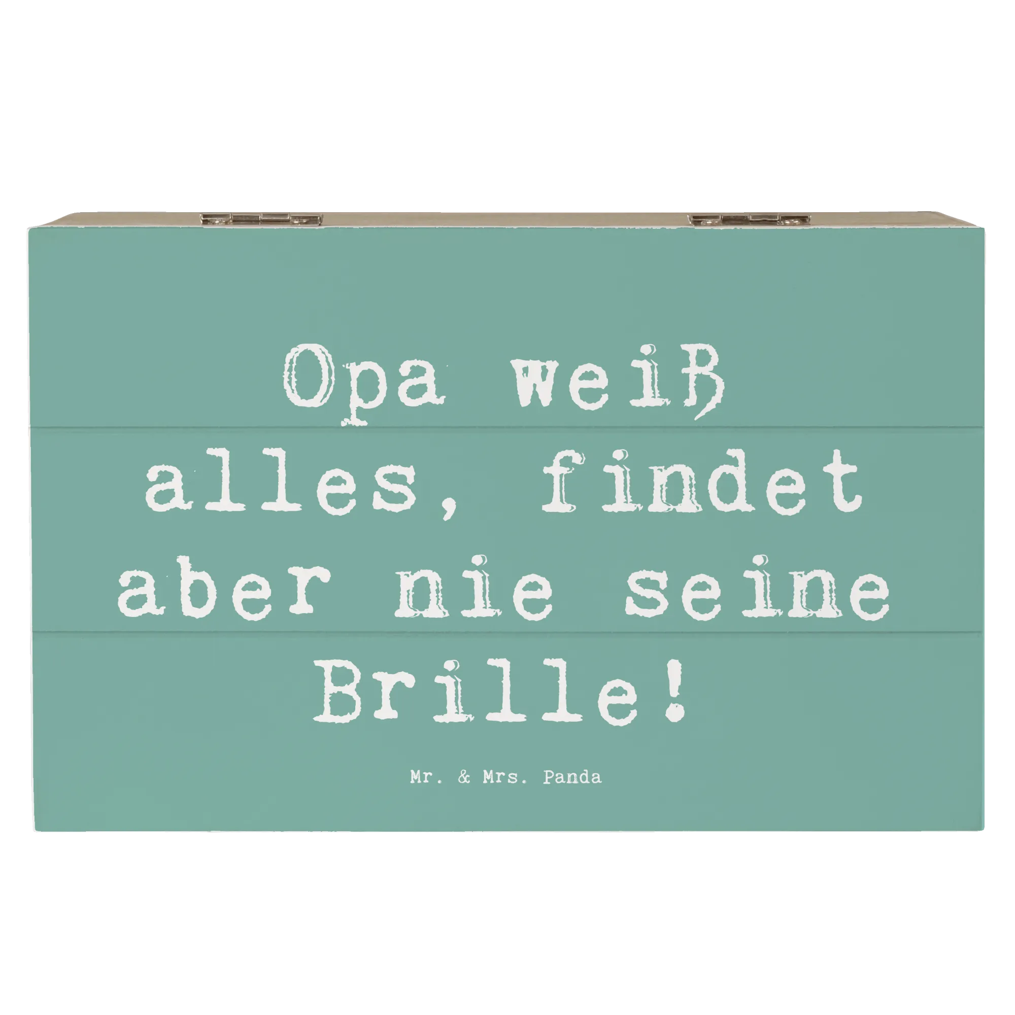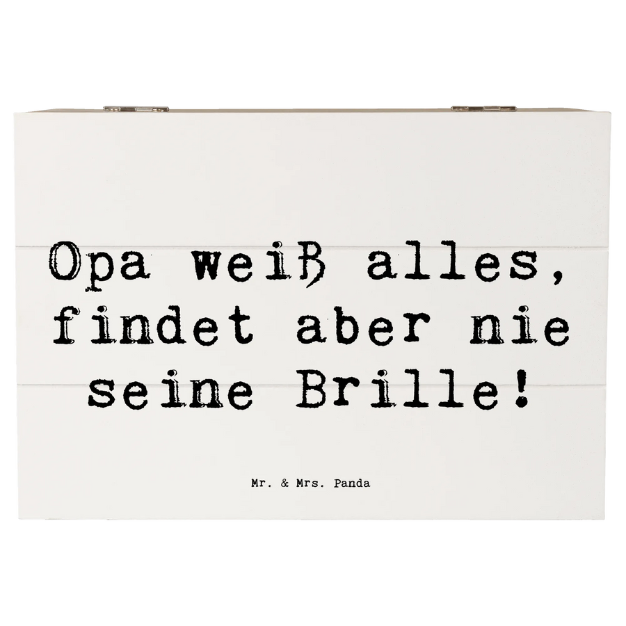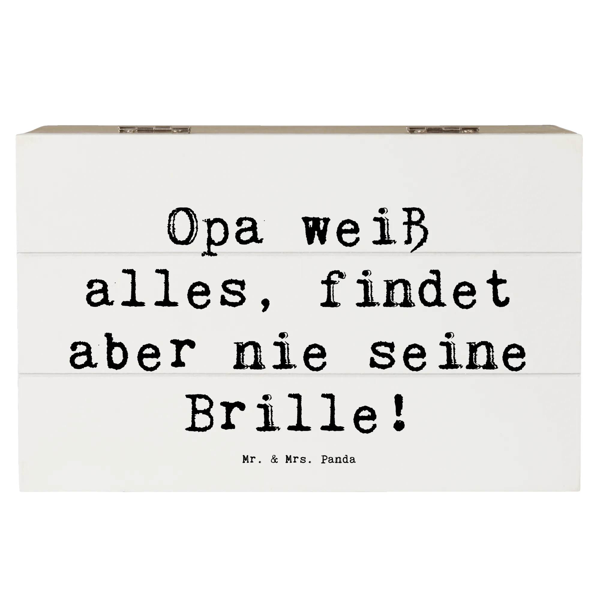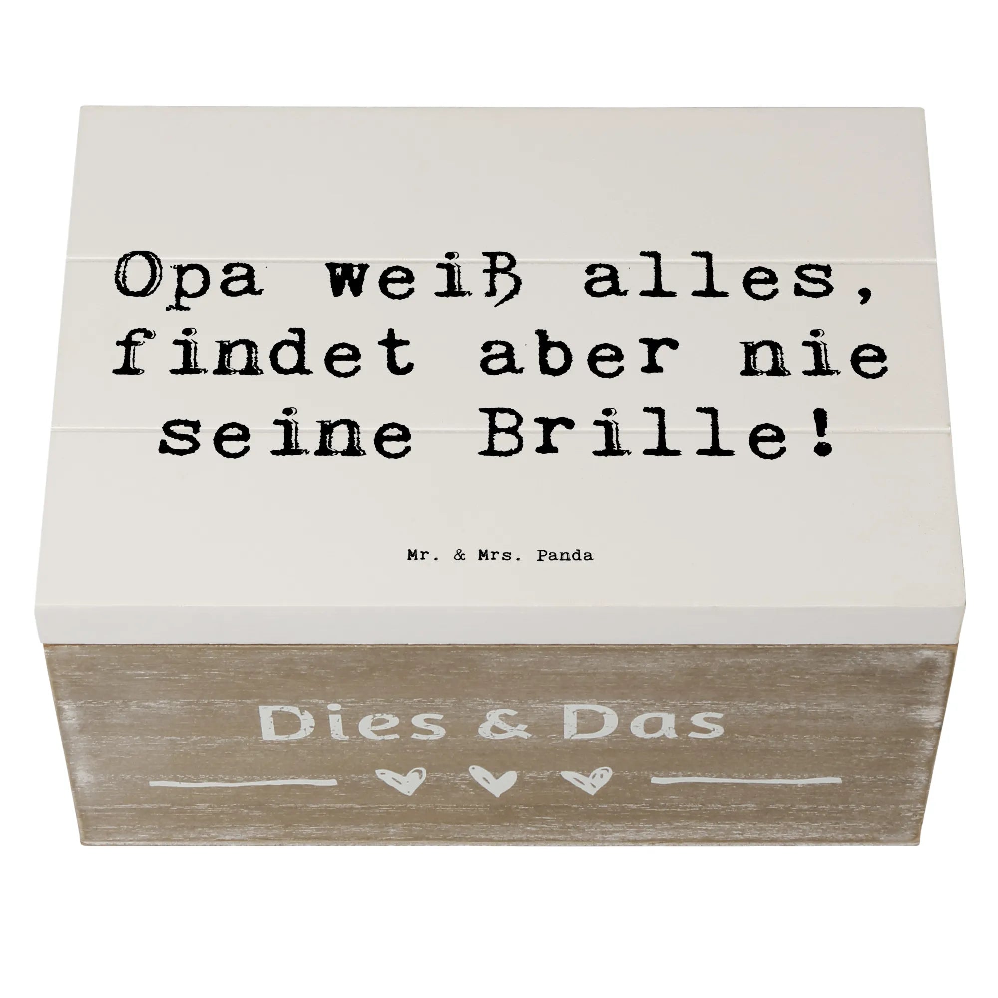 Suchst Du das perfekte Geschenk für Deinen Opa? Dann ist die wunderschöne Holzkiste von Mr. & Mrs. Panda genau das Richtige! Mit dem süßen Spruch "Opa weiß alles, findet aber nie seine Brille!" wird diese Kiste nicht nur zum Aufbewahrungsort für die kostbarsten Erinnerungen, sondern auch zum echten Hingucker, der ein Lächeln auf die Lippen zaubert.