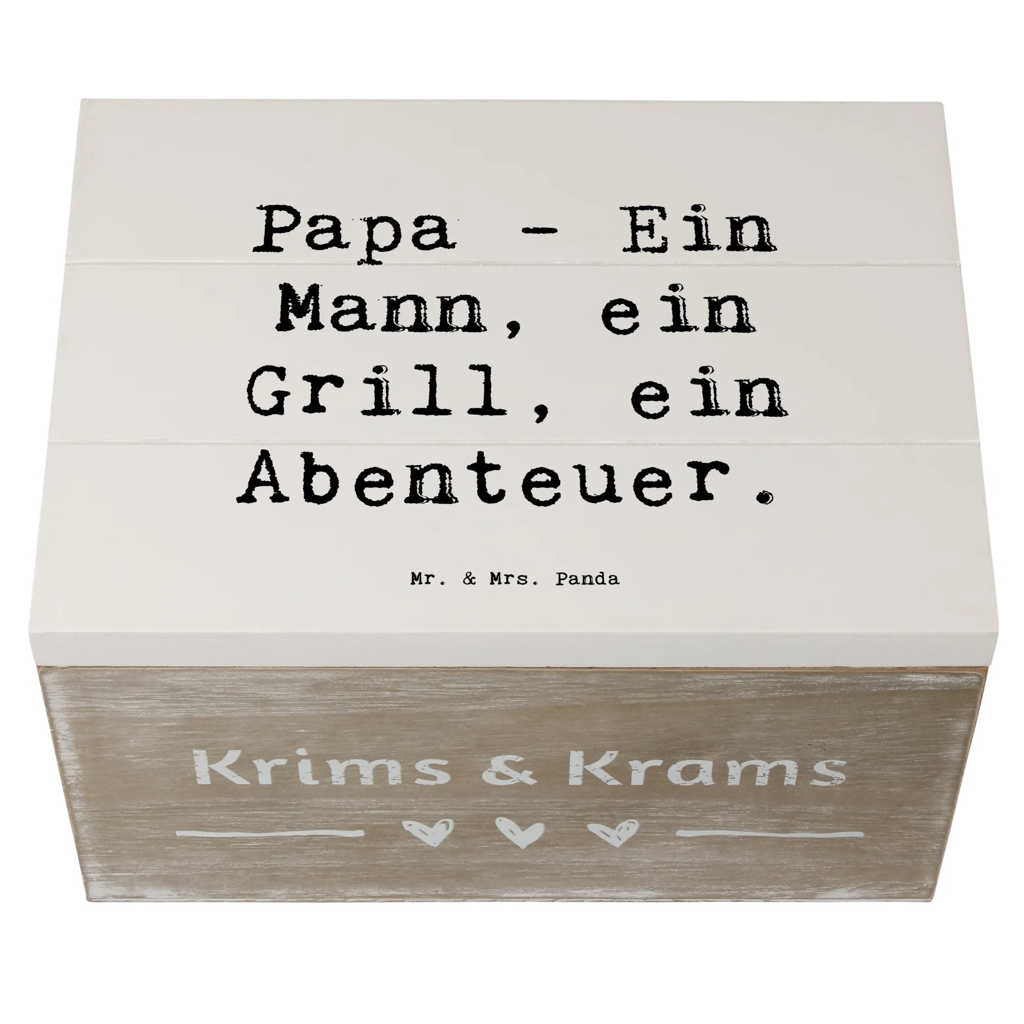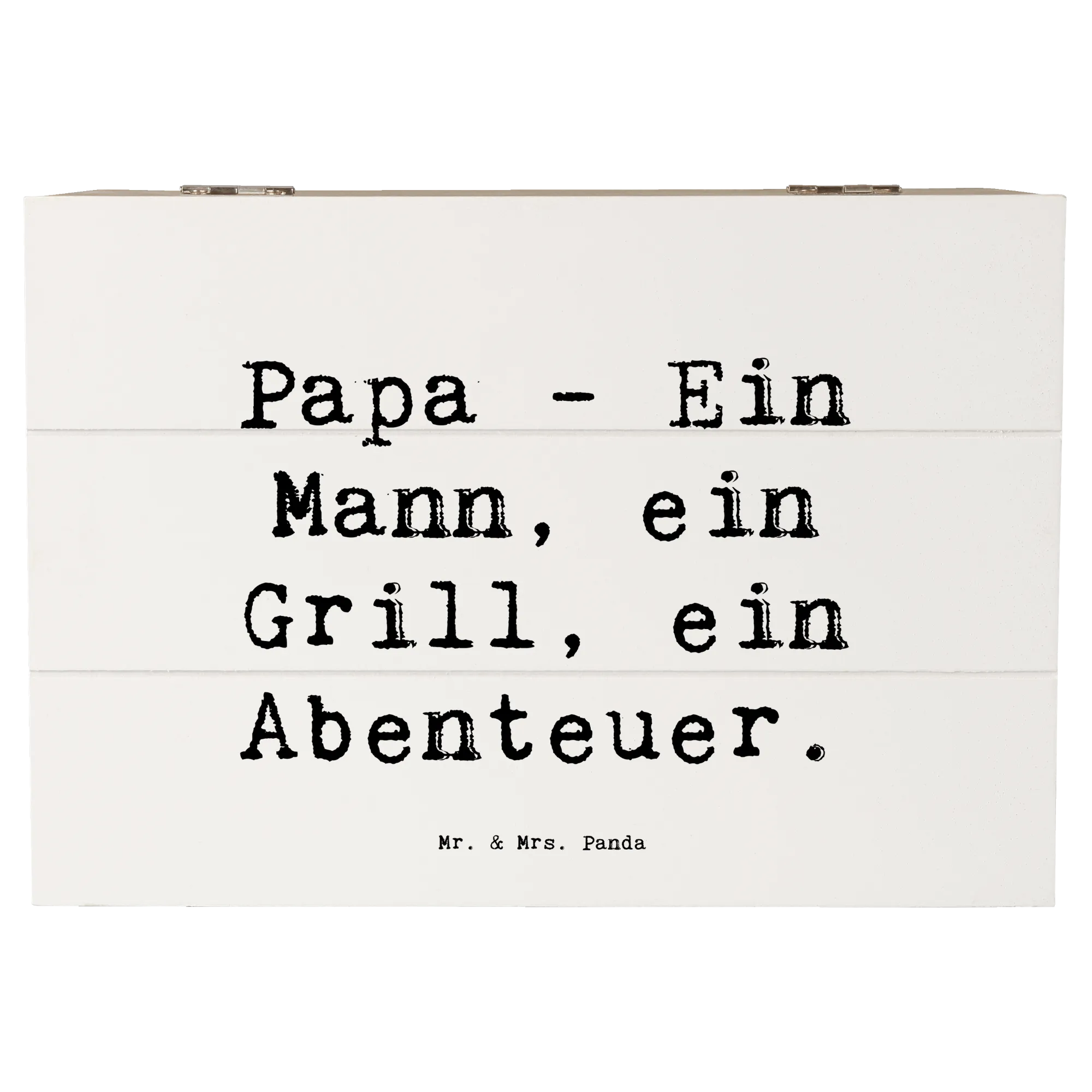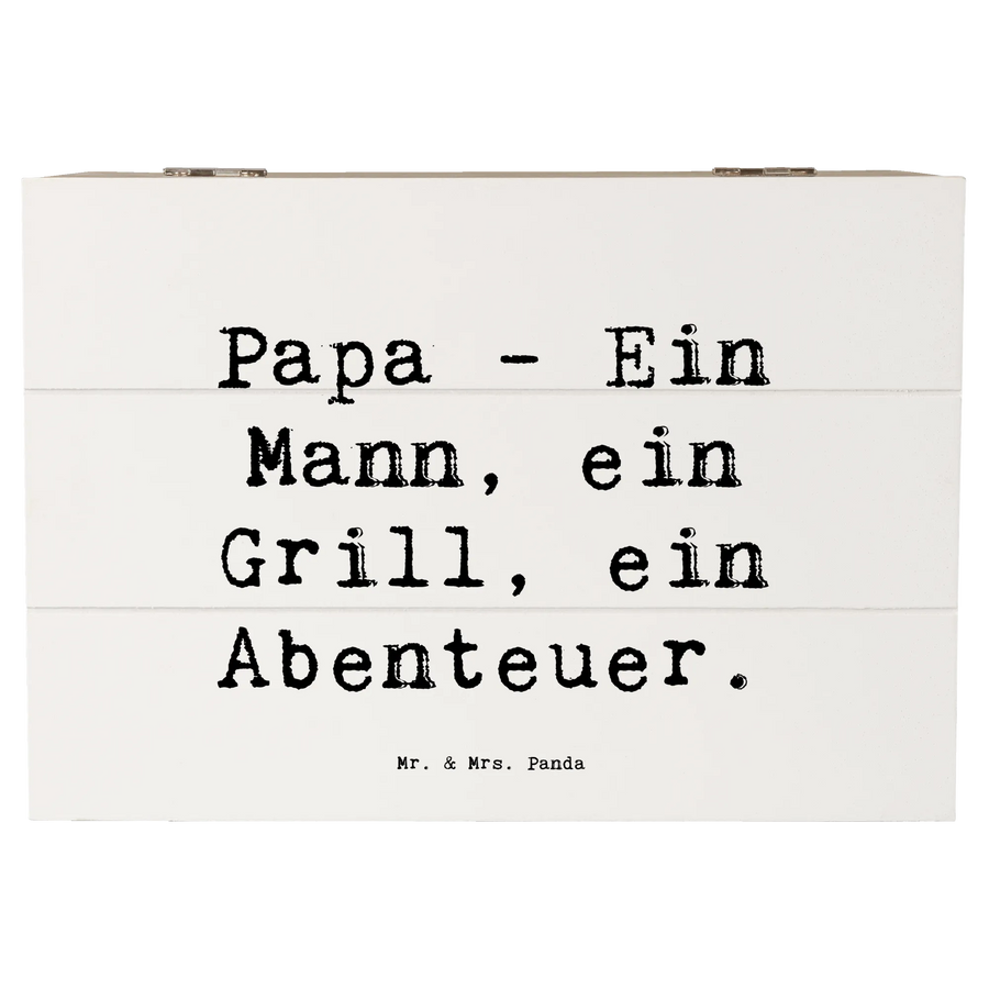 Eine wunderschöne Holzkiste von Mr. & Mrs. Panda mit dem liebevollen Motiv 'Papa - Ein Mann, ein Grill, ein Abenteuer' ist das perfekte Geschenk für jeden Vater. Diese schlichte, aber stilvolle Kiste ist nicht nur ein idealer Aufbewahrungsort für alle kostbaren Erinnerungen, sondern auch ein wunderbares Dekorationsstück, das das Herz eines jeden Papas höher schlagen lässt.