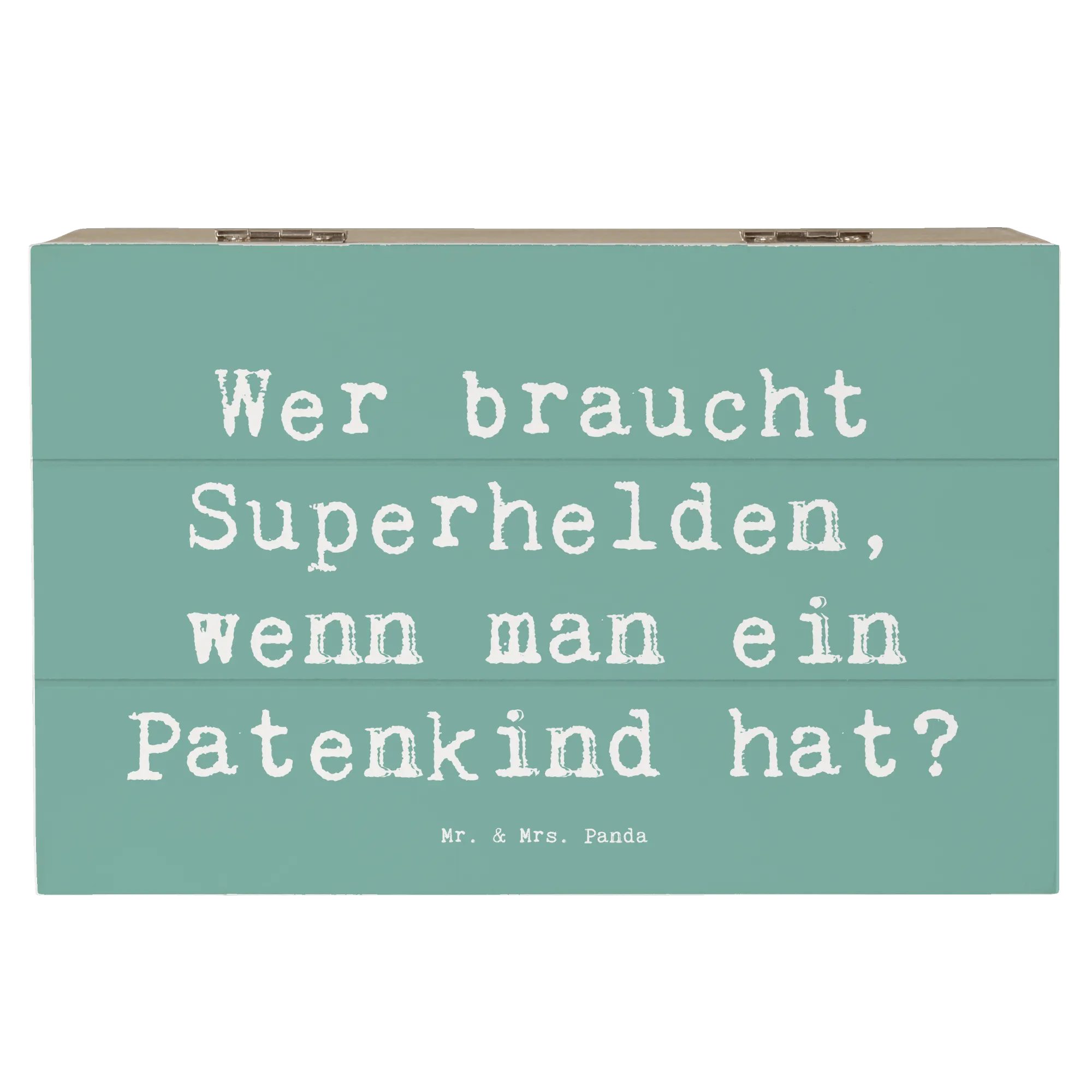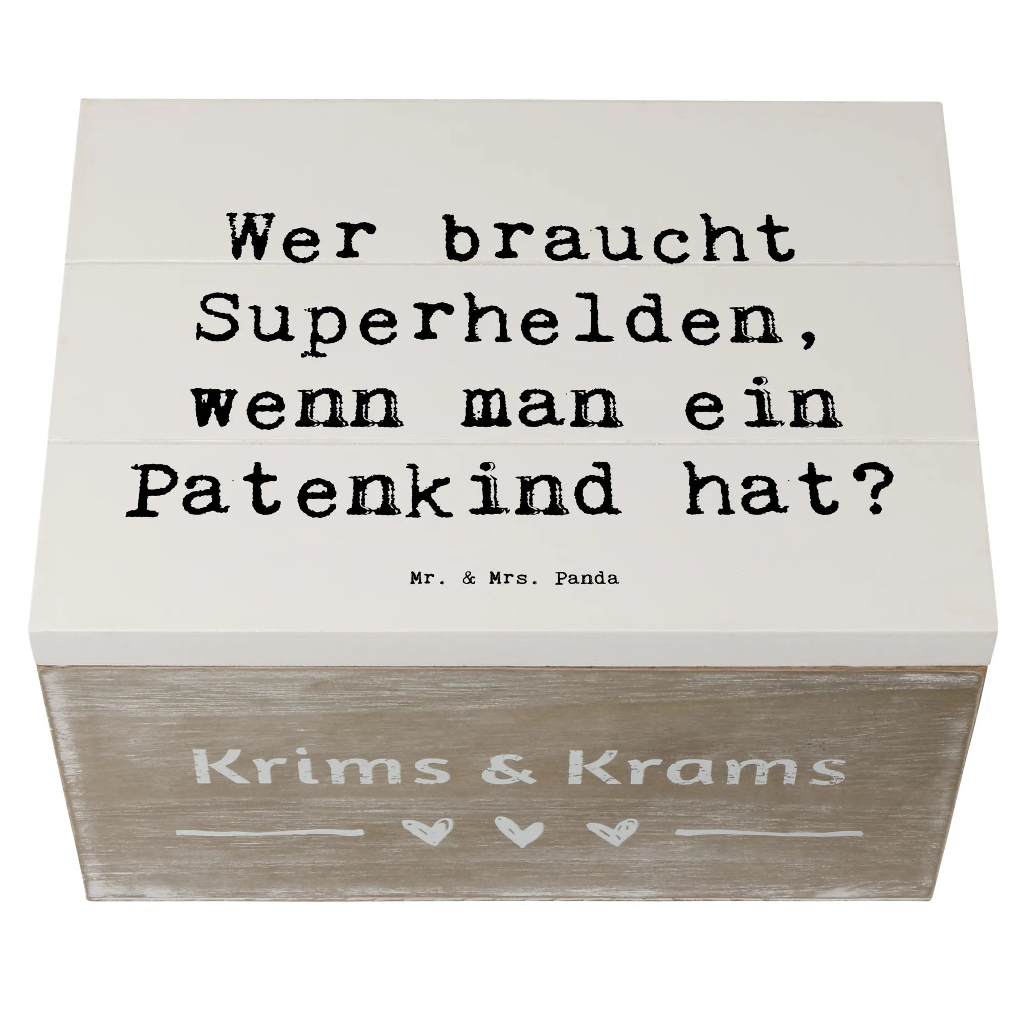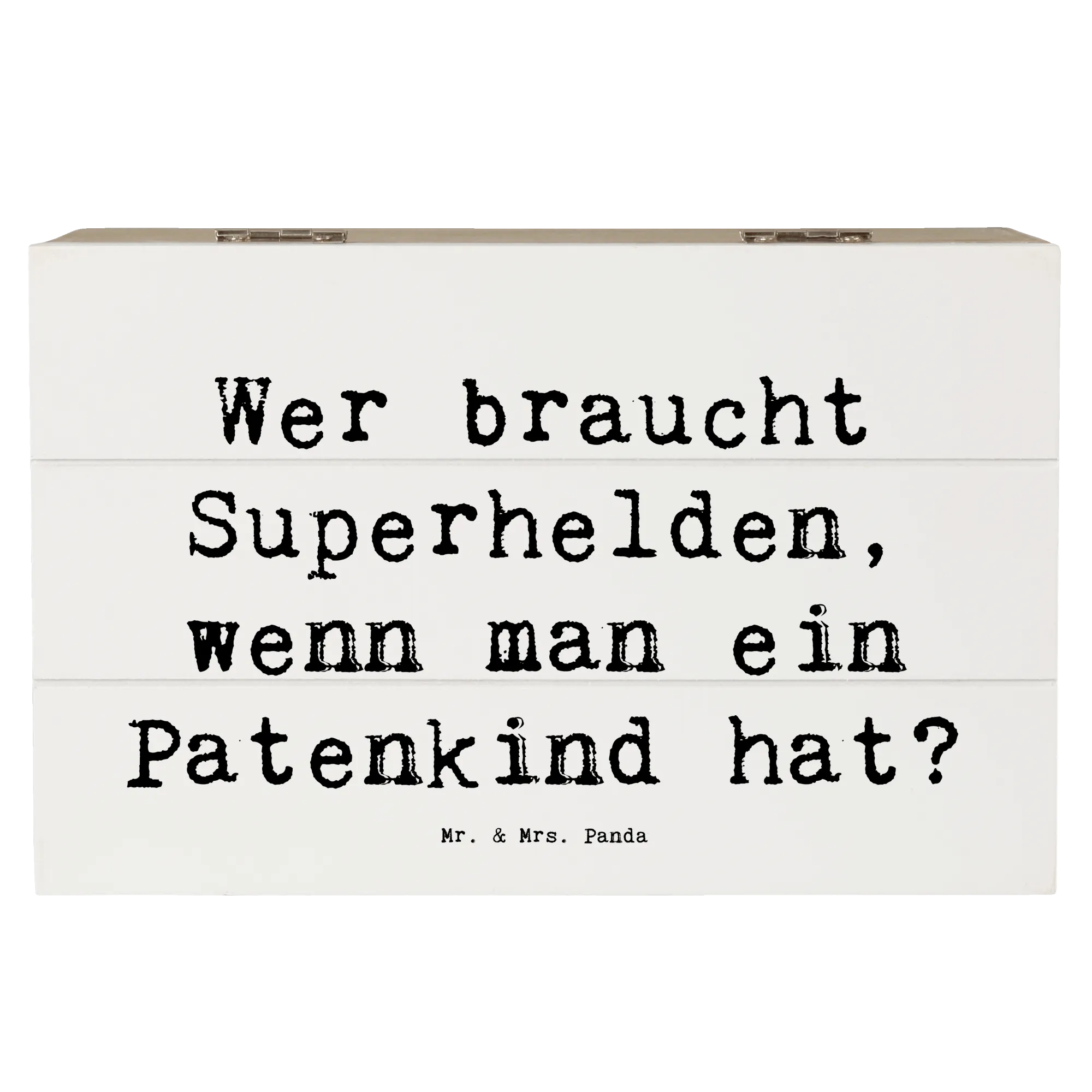 Die Botschaft 'Wer braucht Superhelden, wenn man ein Patenkind hat?' bringt die außergewöhnliche Beziehung zwischen einem Paten und seinem Patenkind perfekt auf den Punkt und macht die Kiste zu einem liebevollen Geschenk.