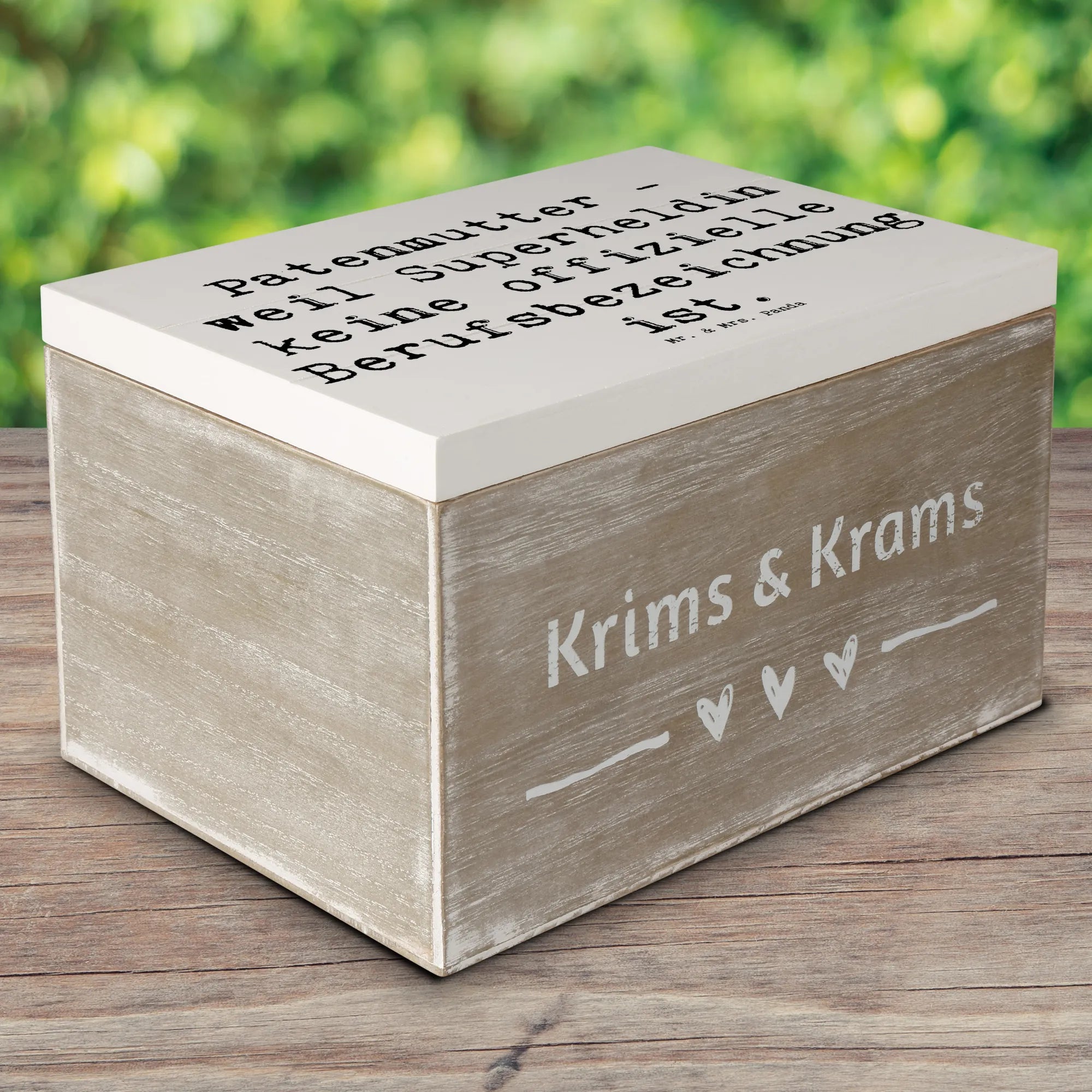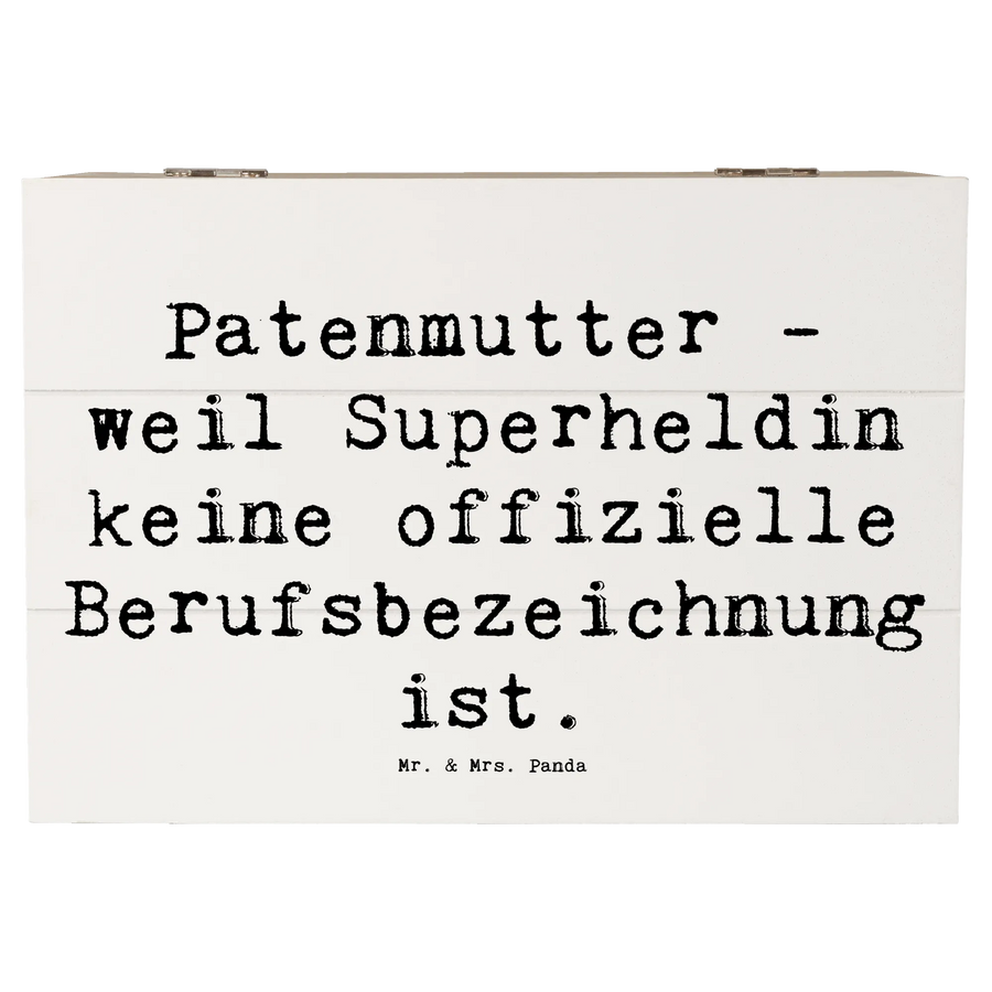 Die Holzkiste "Patenmutter - weil Superheldin keine offizielle Berufsbezeichnung ist" von Mr. & Mrs. Panda ist nicht nur eine Aufbewahrungsbox, sondern ein ganz besonderes Geschenk für alle Patenmütter. Diese wunderschöne Schatzkiste ist der perfekte Ort, um wertvolle Erinnerungen, Fotos und kleine Geschenke aufzubewahren. Mit ihren robusten Materialien und der stabilen Bauweise sorgt sie dafür, dass alle Schätze sicher verstaut sind und gleichzeitig als ansprechende Deko dient.