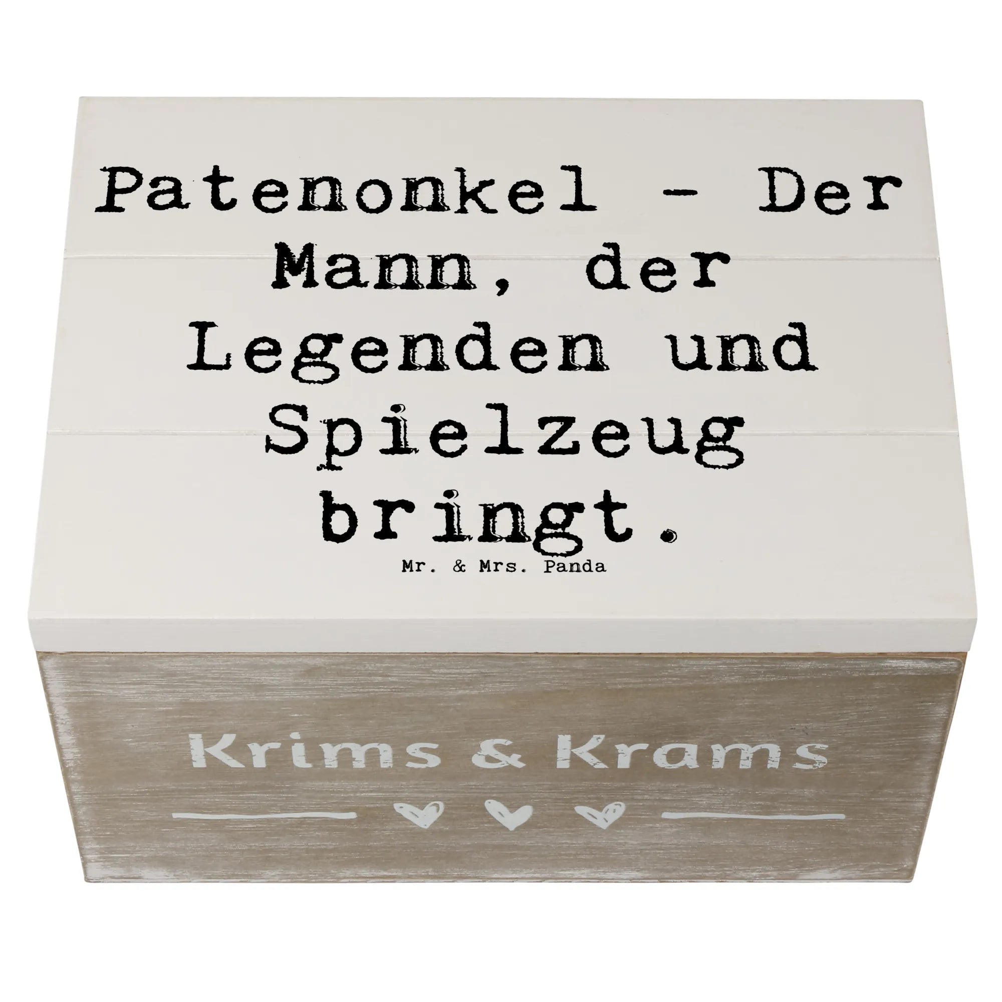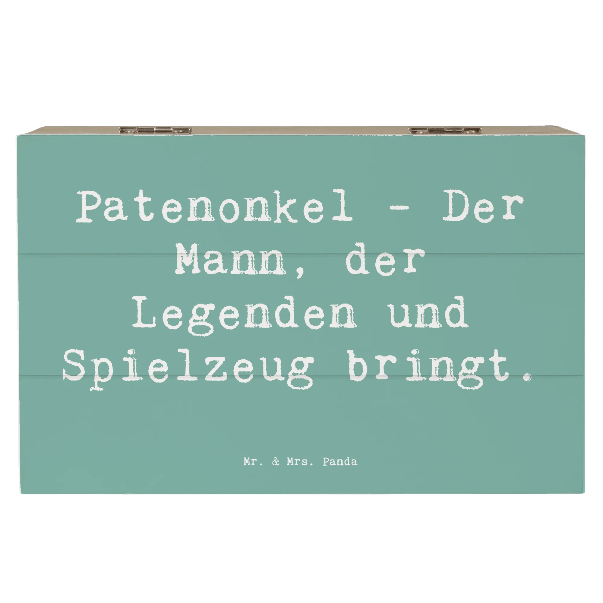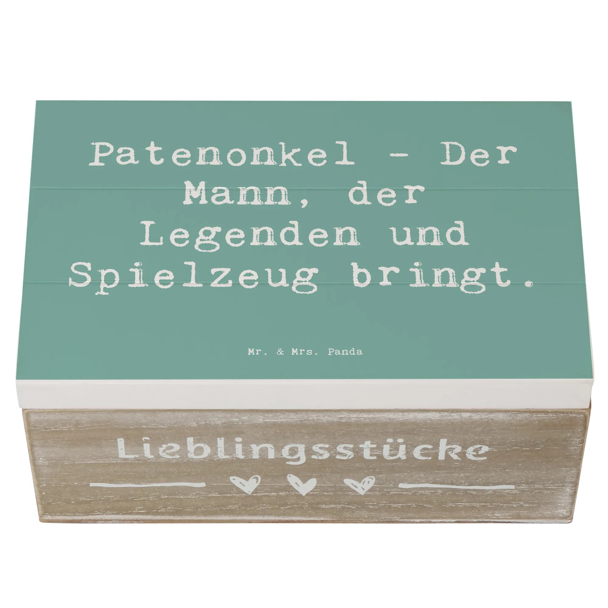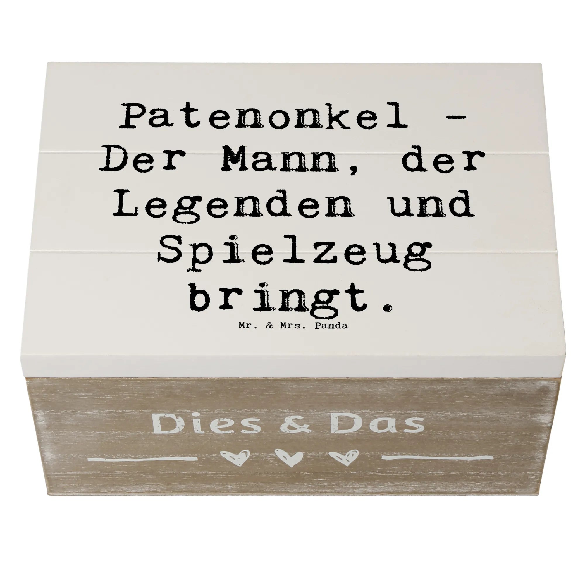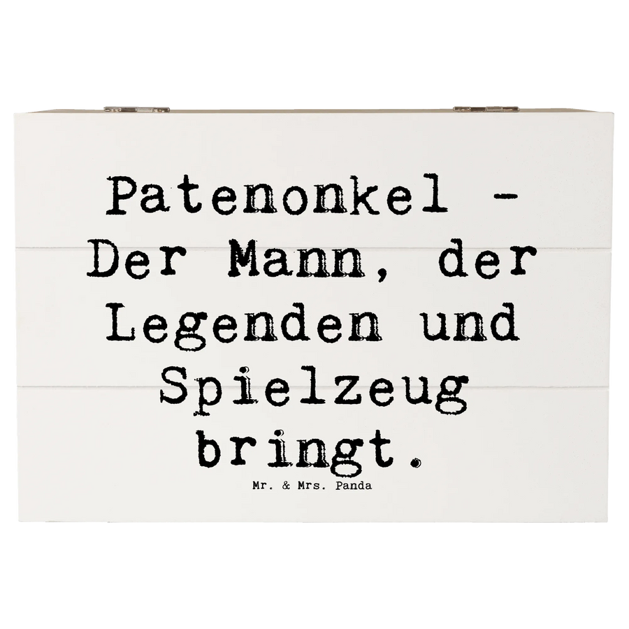 Entdecke die bezaubernde Holzkiste von Mr. & Mrs. Panda, die perfekt geeignet ist, um die wunderbare Beziehung zwischen Patenonkel und Patenkind zu würdigen. Diese wunderschöne Holzkiste hat ein fantastisches Design mit dem Spruch "Patenonkel - Der Mann, der Legenden und Spielzeug bringt." und ist in der Kollektion Familie & Verwandte ein absolutes Must-have.