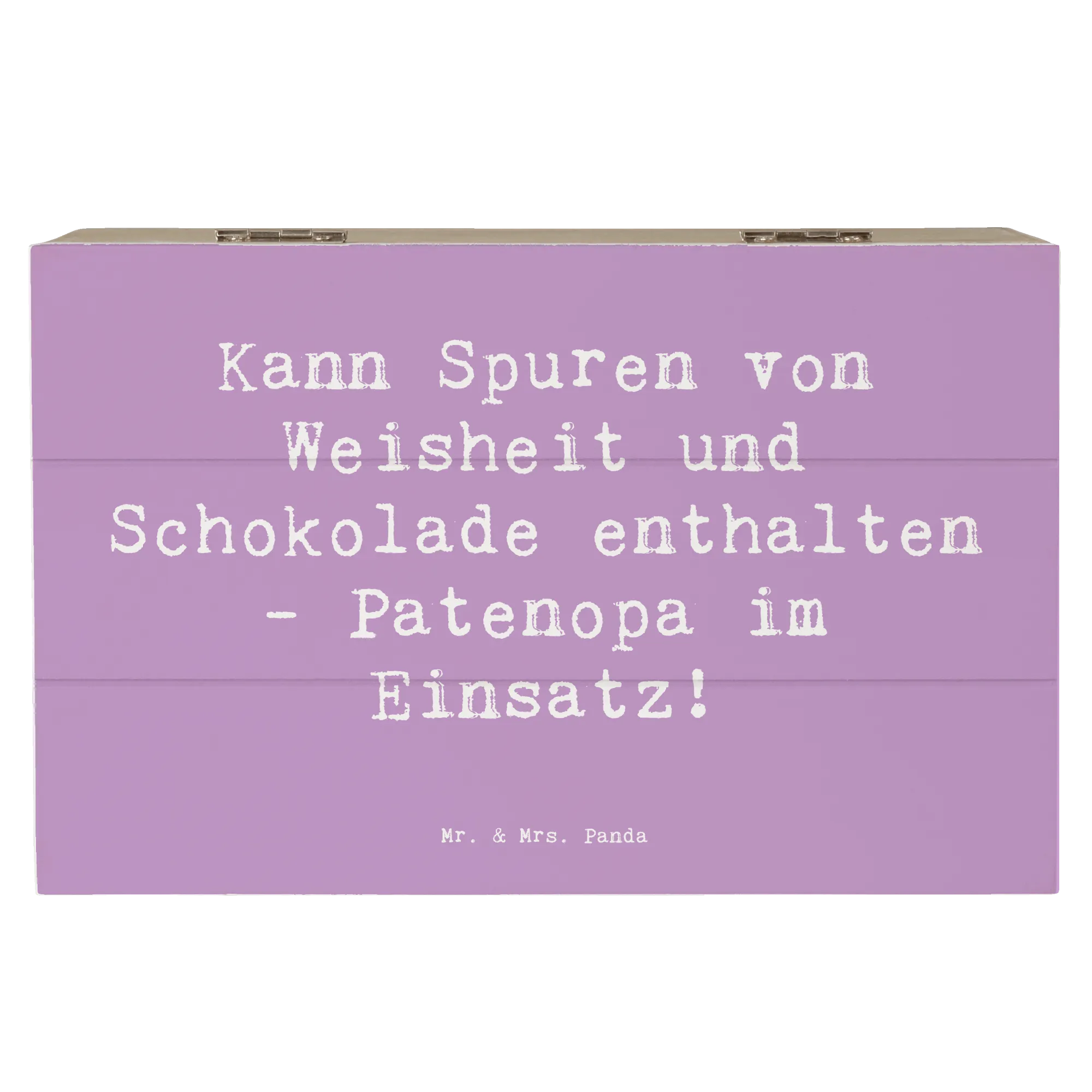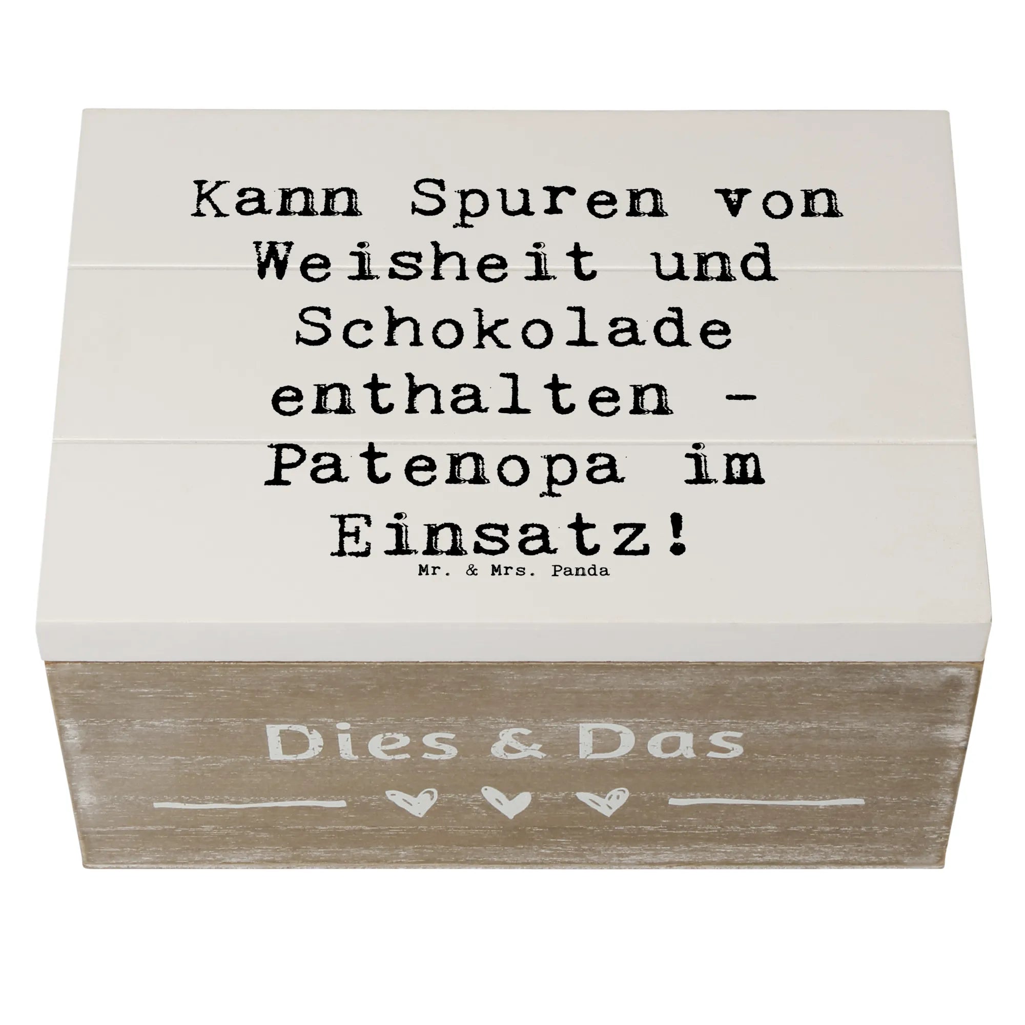 Entdecke die zauberhafte Holzkiste von Mr. & Mrs. Panda, perfekt gestaltet für jeden Patenopa! Diese wunderschöne Holzkiste ist nicht nur ein fantastischer Aufbewahrungsort für all die kleinen Schätze, die Du im Laufe deines Lebens sammelst, sondern sie trägt auch die liebevolle Botschaft "Kann Spuren von Weisheit und Schokolade enthalten - Patenopa im Einsatz!"