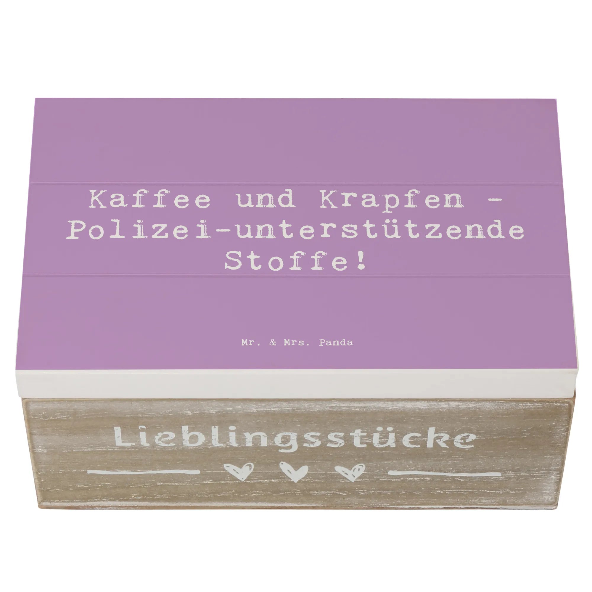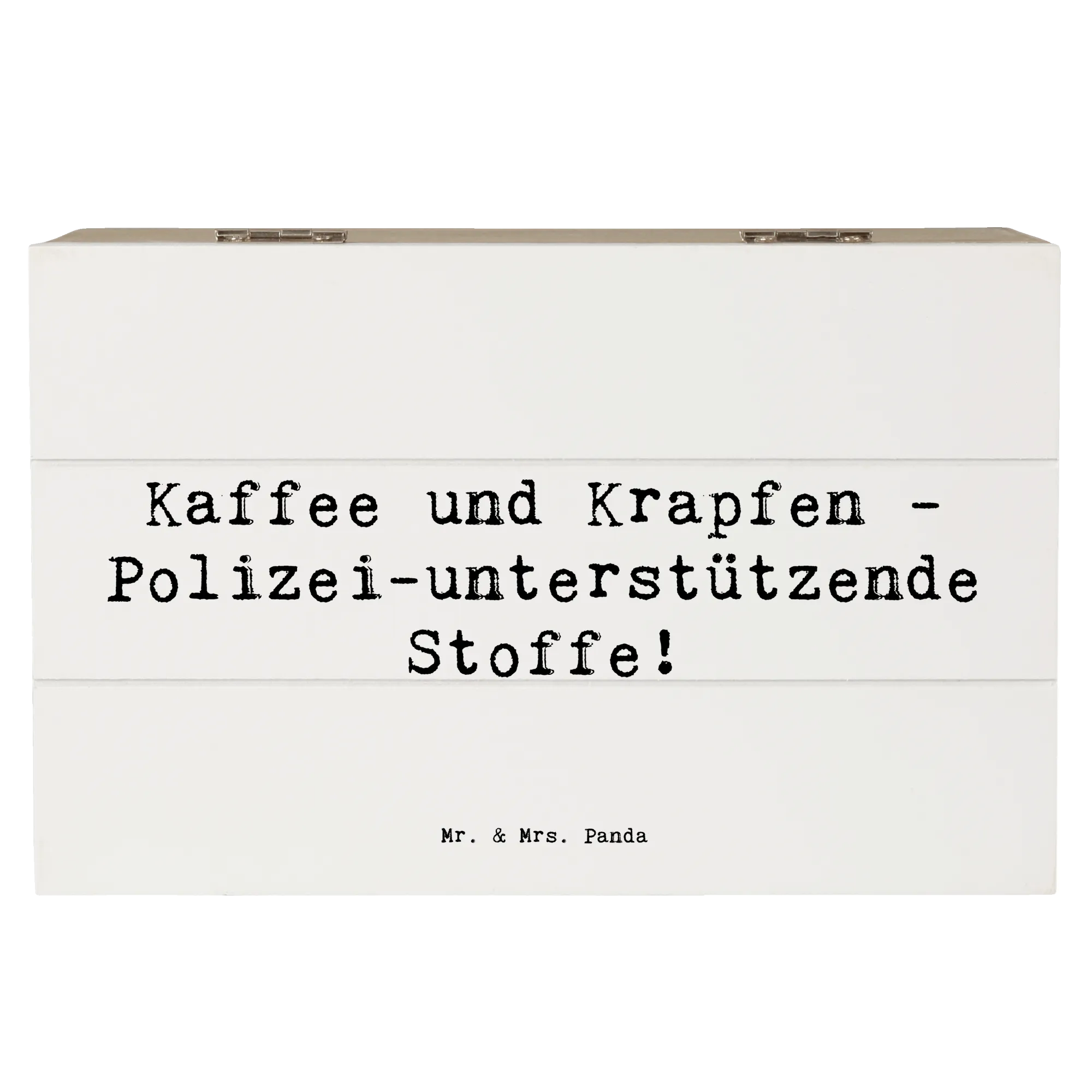 Wusstest Du, dass diese Kiste auch perfekt als nachhaltige Geschenkbox dient? Verschenke sie gefüllt mit kleinen Überraschungen oder Erinnerungen und zaubere so ein Lächeln auf das Gesicht des Beschenkten. Durch das elegante Design und den einzigartigen Spruch "Kaffee und Krapfen - Polizei-unterstützende Stoffe!" wird die Kiste immer wieder gerne in die Hand genommen und sorgt für Freude.