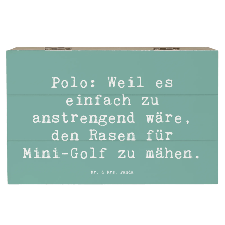 Mit dem Spruch "Polo: Weil es einfach zu anstrengend wäre, den Rasen für Mini-Golf zu mähen", strahlt diese Kiste nicht nur Charme aus, sondern spricht auch die sportliche Seite in jedem an. Du kannst sie wunderbar zu festlichen Anlässen wie Kommunion oder Konfirmation verschenken oder sie einfach als dekorative Geschenkdose für Sportbegeisterte nutzen.