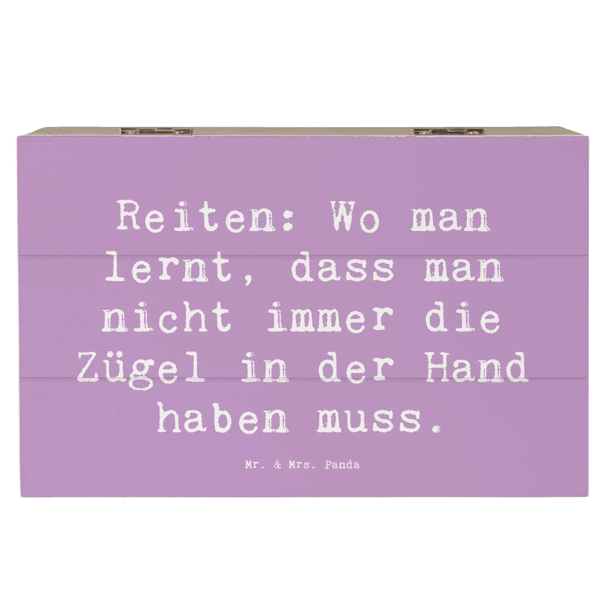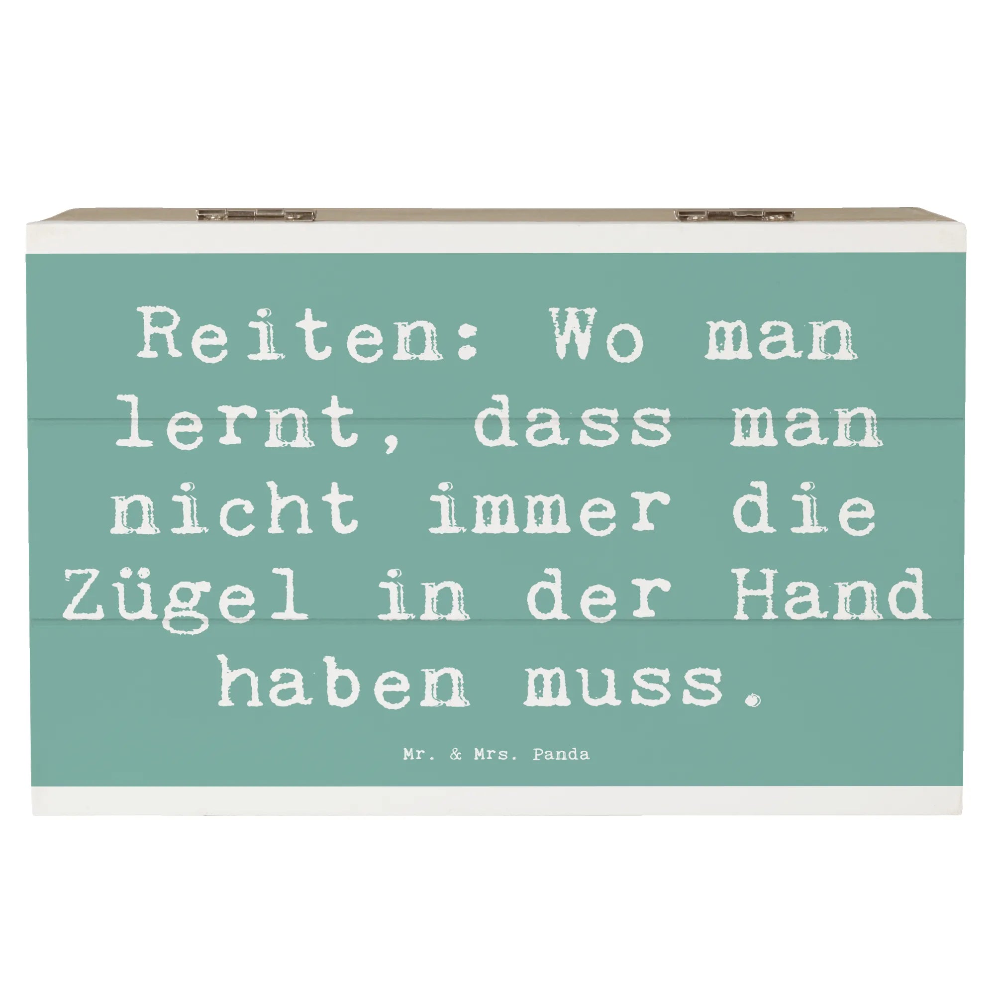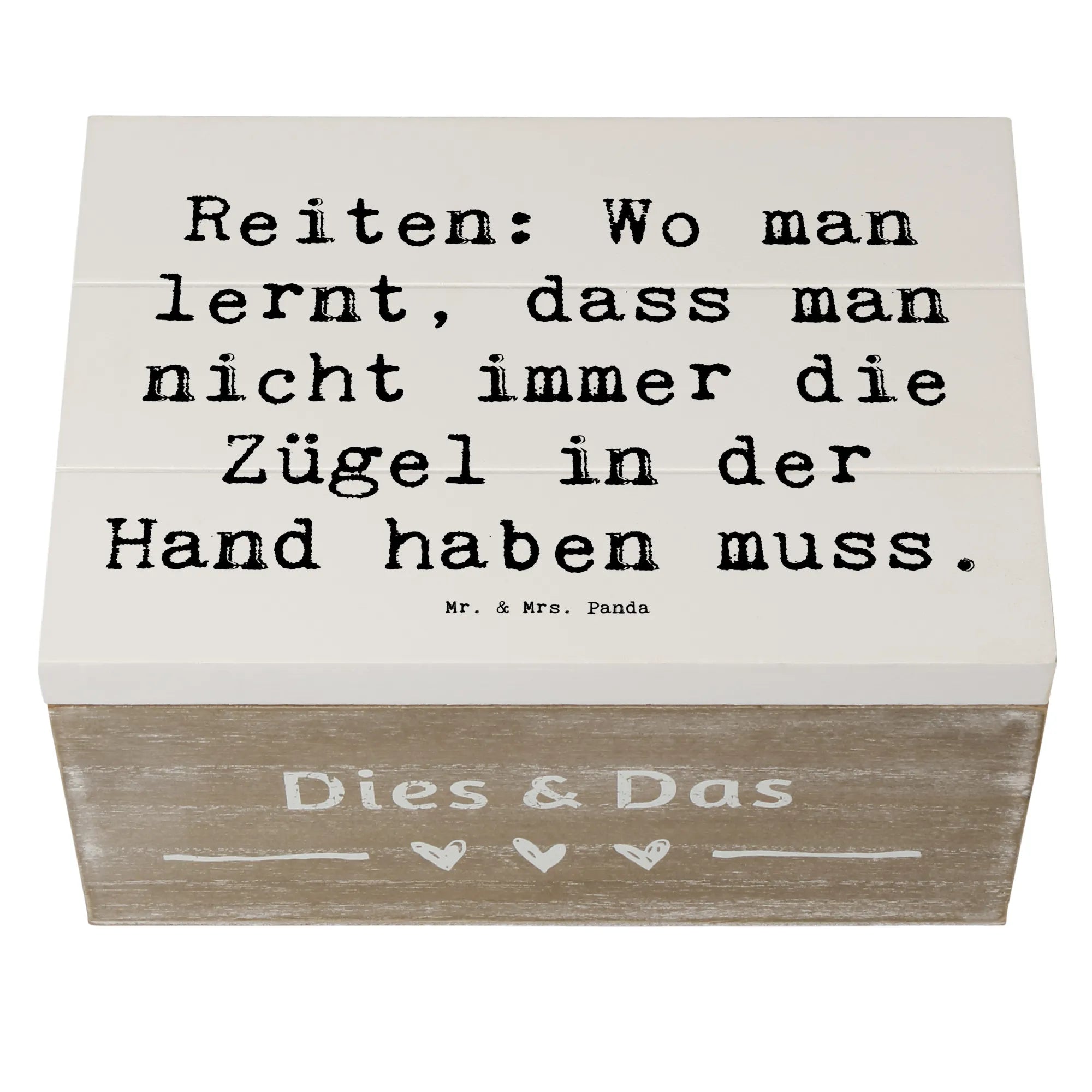 Die Holzkiste mit dem Motiv "Reiten: Wo man lernt, dass man nicht immer die Zügel in der Hand haben muss" von Mr. & Mrs. Panda ist das perfekte Geschenk für alle Pferdeliebhaber und Sportbegeisterte!
