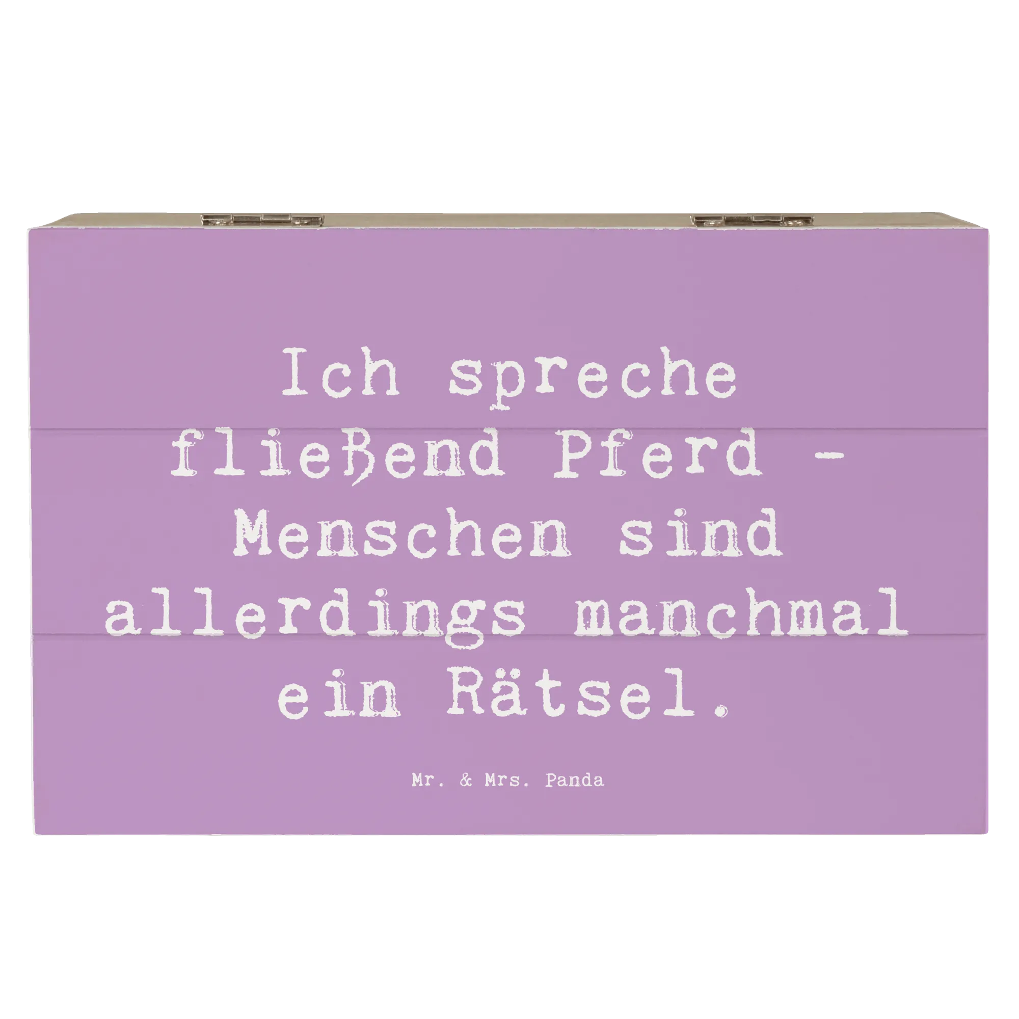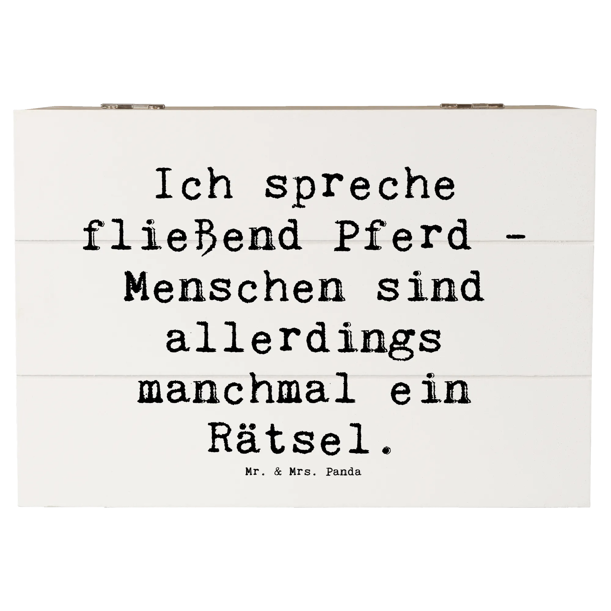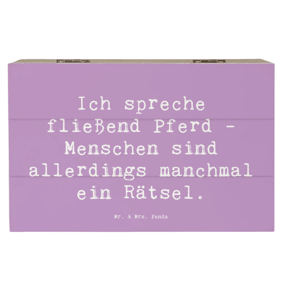 Die wunderschöne Holzkiste von Mr. & Mrs. Panda ist nicht nur ein einfaches Aufbewahrungsobjekt, sondern ein echtes Liebhaberstück für alle Pferdefans! Mit dem liebevollen Spruch "Ich spreche fließend Pferd - Menschen sind allerdings manchmal ein Rätsel." wird diese Kiste schnell zum besonderen Highlight in deinem Zuhause.