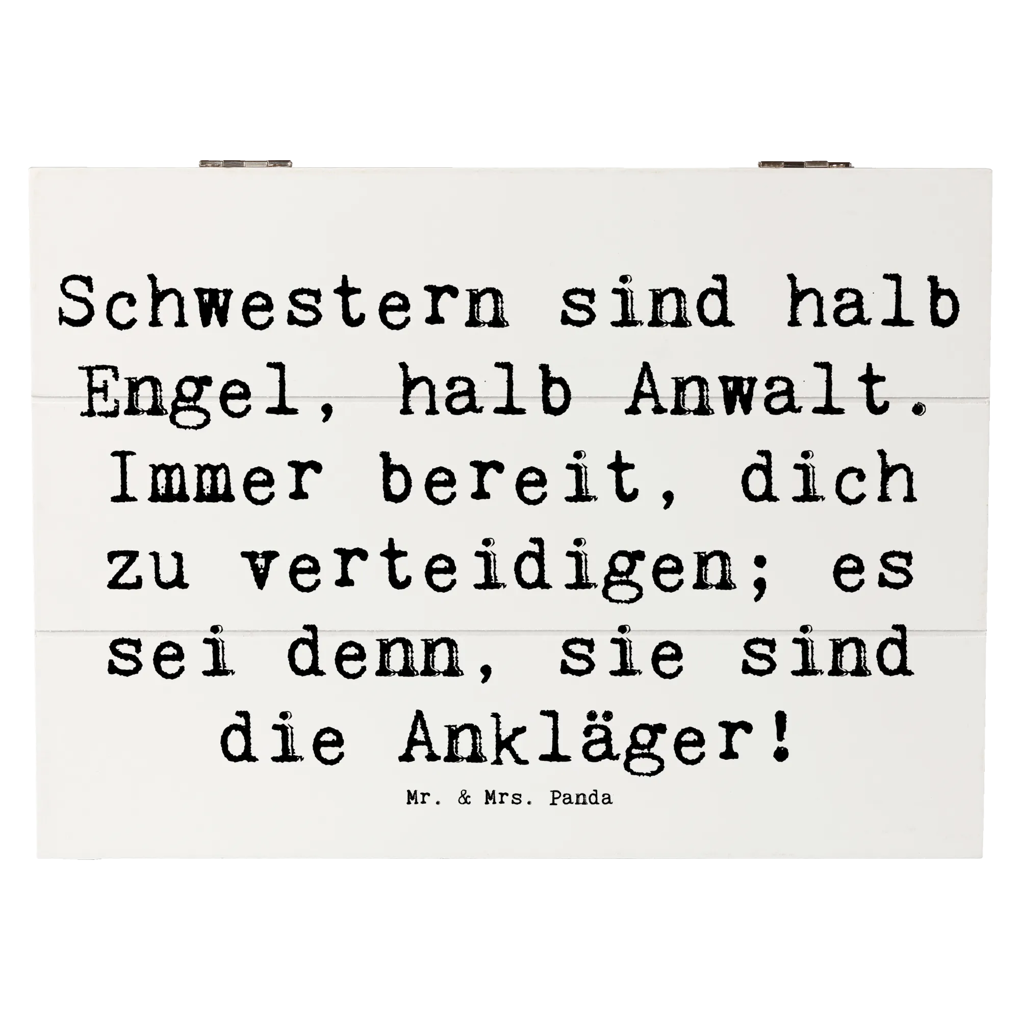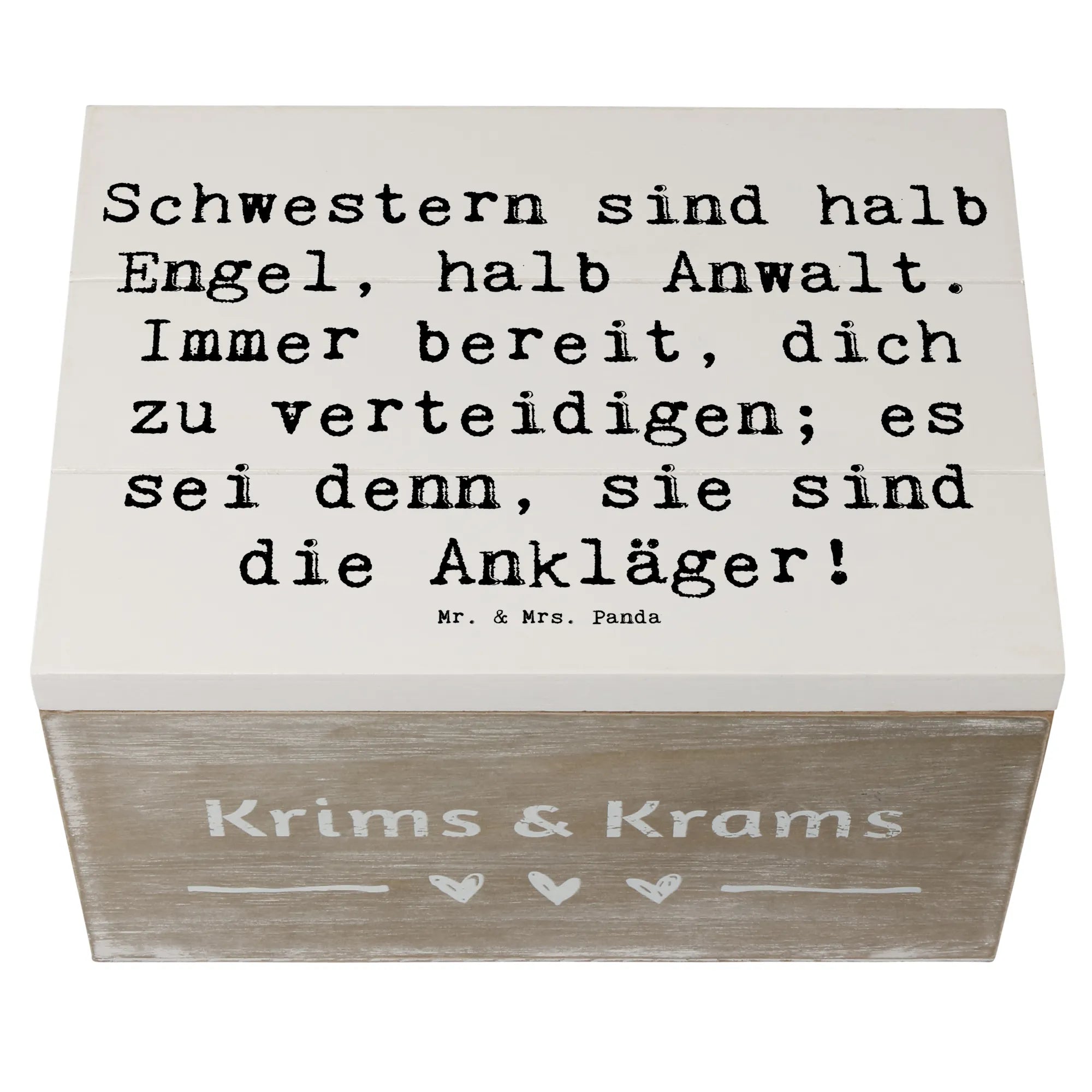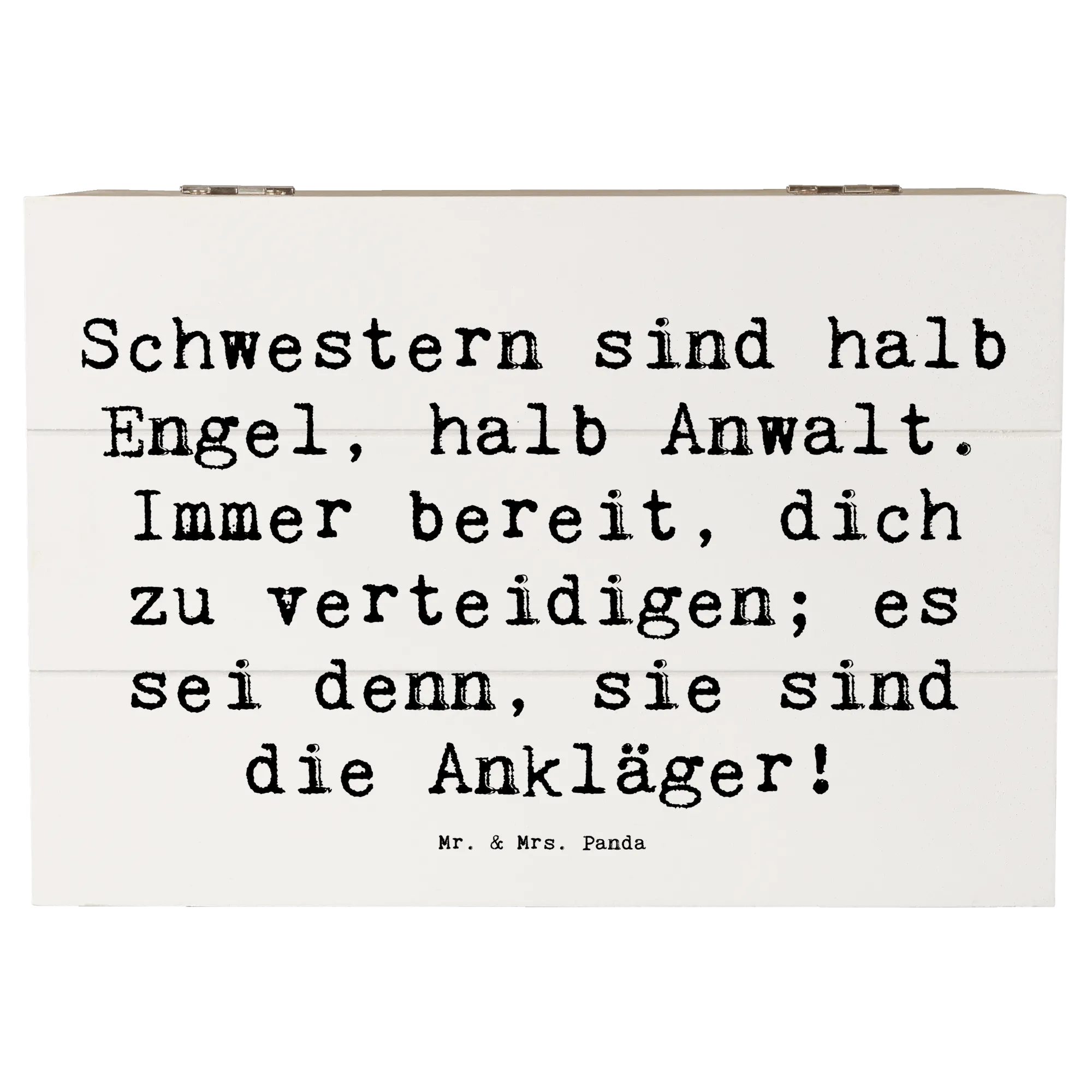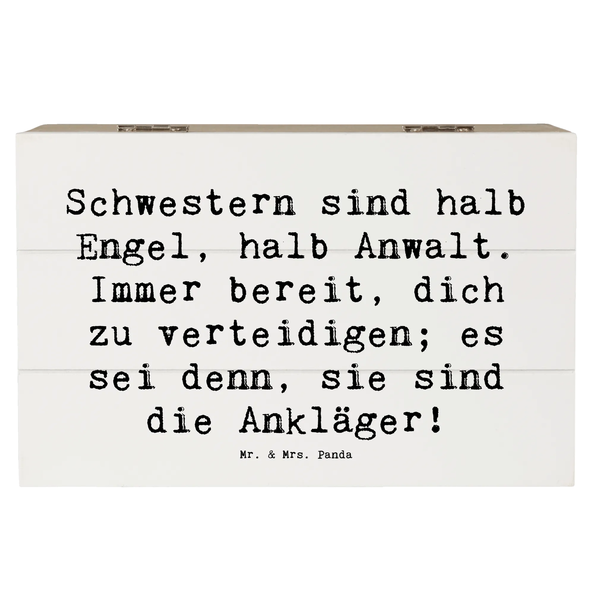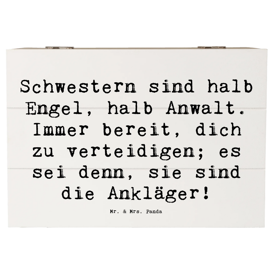 Ob für die große Schwester, die kleine Schwester oder sogar als Überraschung für Zwillingsschwestern - jede Kiste ist mit dem herzlichen Spruch „Schwestern sind halb Engel, halb Anwalt. Immer bereit, dich zu verteidigen; es sei denn, sie sind die Ankläger!“ versehen. Diese Holzkiste hat die Maße von 190 mm x 120 mm x 100 mm und ist aus robuster Holzfaser gefertigt, was sie besonders stabil und langlebig macht.