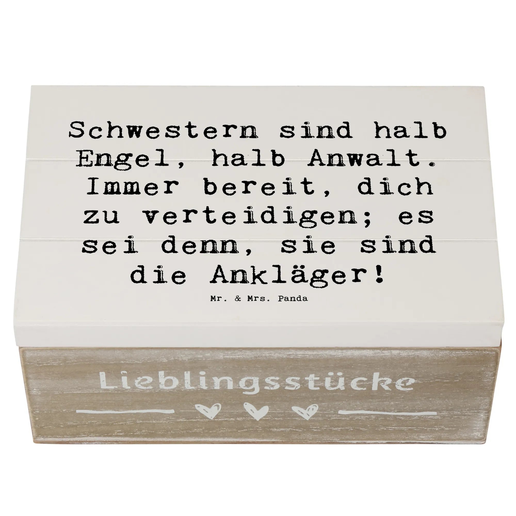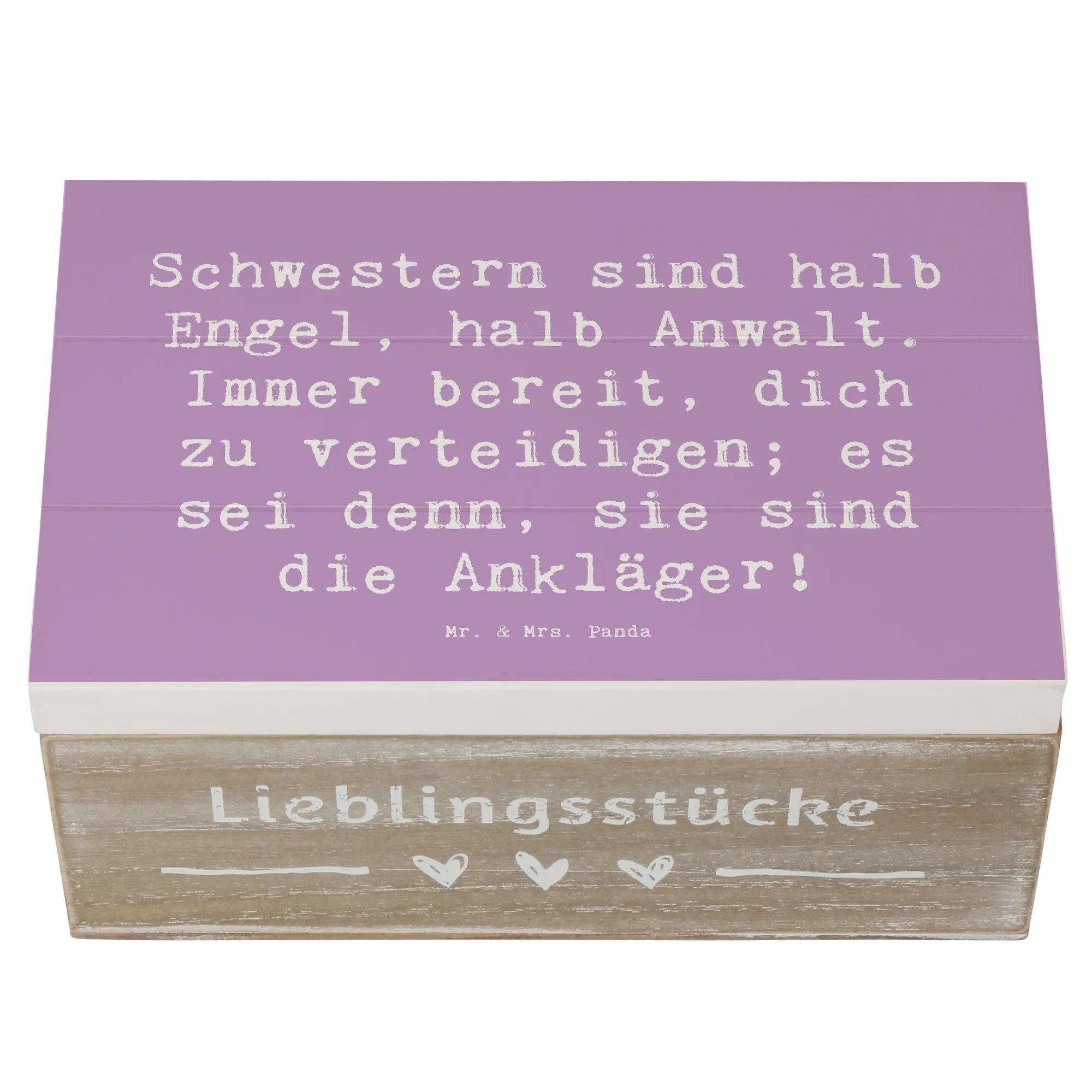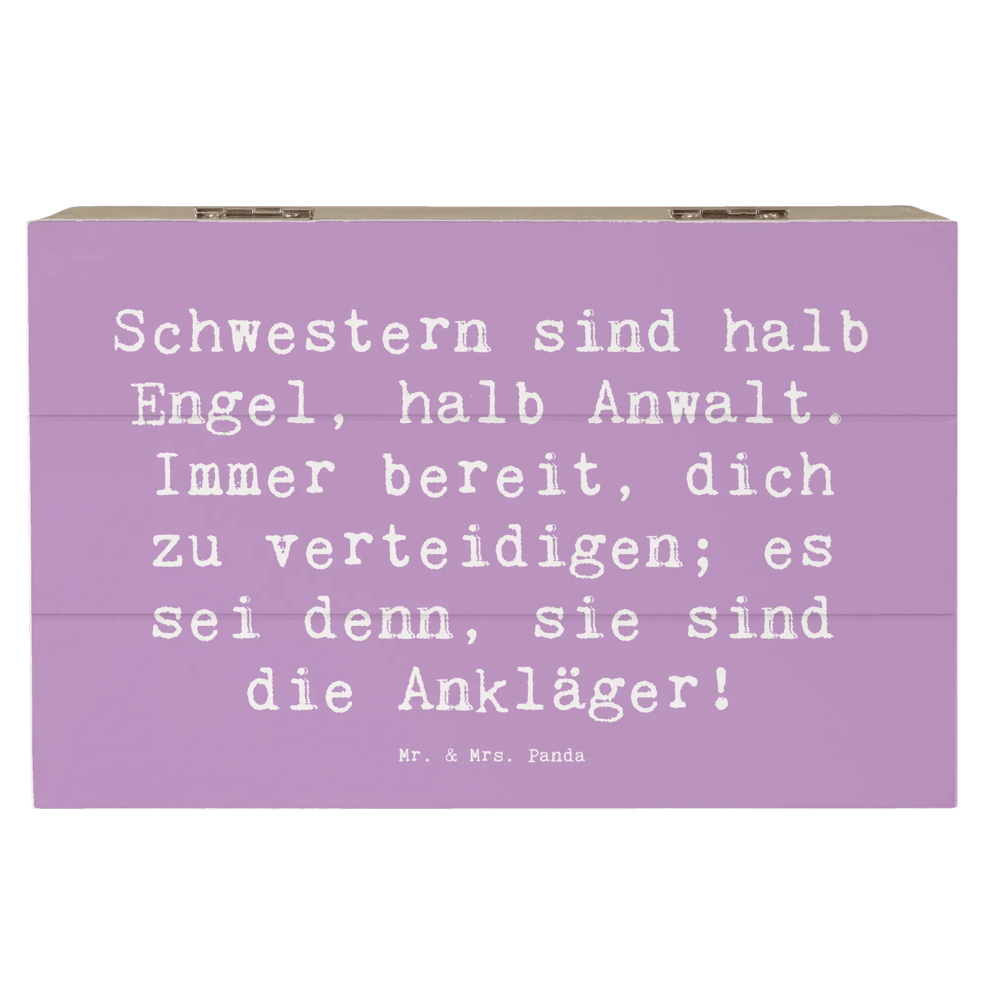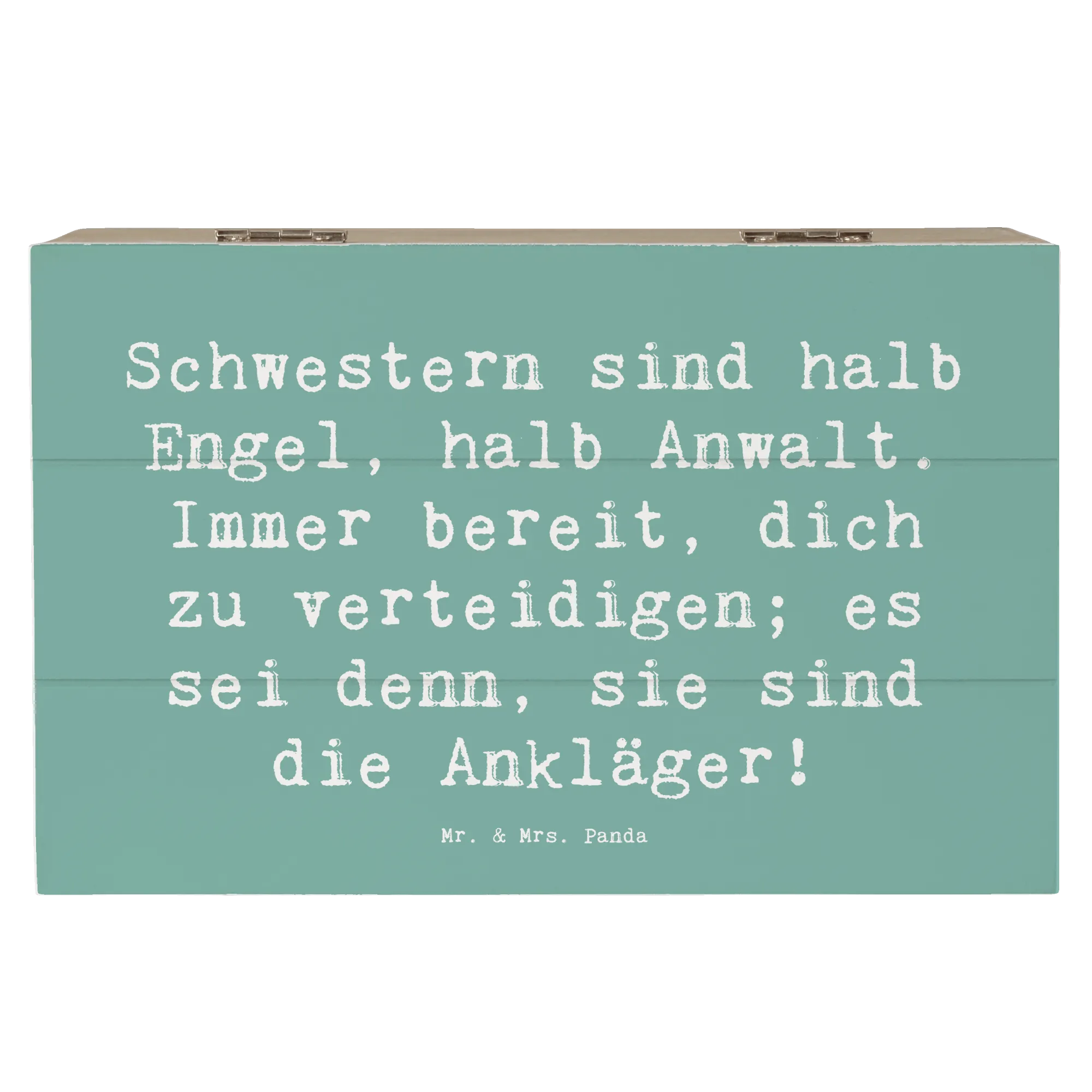 Ob für die große Schwester, die kleine Schwester oder sogar als Überraschung für Zwillingsschwestern - jede Kiste ist mit dem herzlichen Spruch „Schwestern sind halb Engel, halb Anwalt. Immer bereit, dich zu verteidigen; es sei denn, sie sind die Ankläger!“ versehen. Diese Holzkiste hat die Maße von 190 mm x 120 mm x 100 mm und ist aus robuster Holzfaser gefertigt, was sie besonders stabil und langlebig macht.