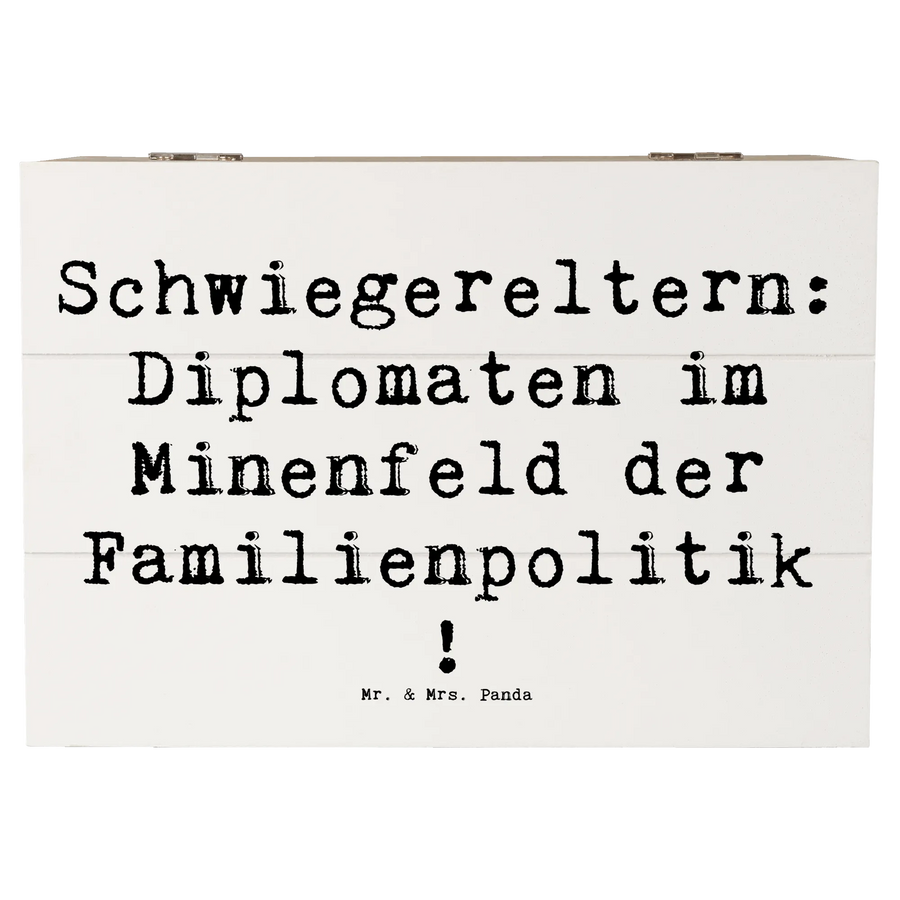 Du suchst das perfekte Geschenk für deine Schwiegereltern? Dann ist diese wunderschöne Holzkiste von Mr. & Mrs. Panda genau das Richtige! Mit dem liebevollen Spruch "Schwiegereltern: Diplomaten im Minenfeld der Familienpolitik!" ist sie nicht nur ein echter Hingucker, sondern auch eine ganz besondere Wertschätzung an die Eltern deines Partners oder deiner Partnerin.