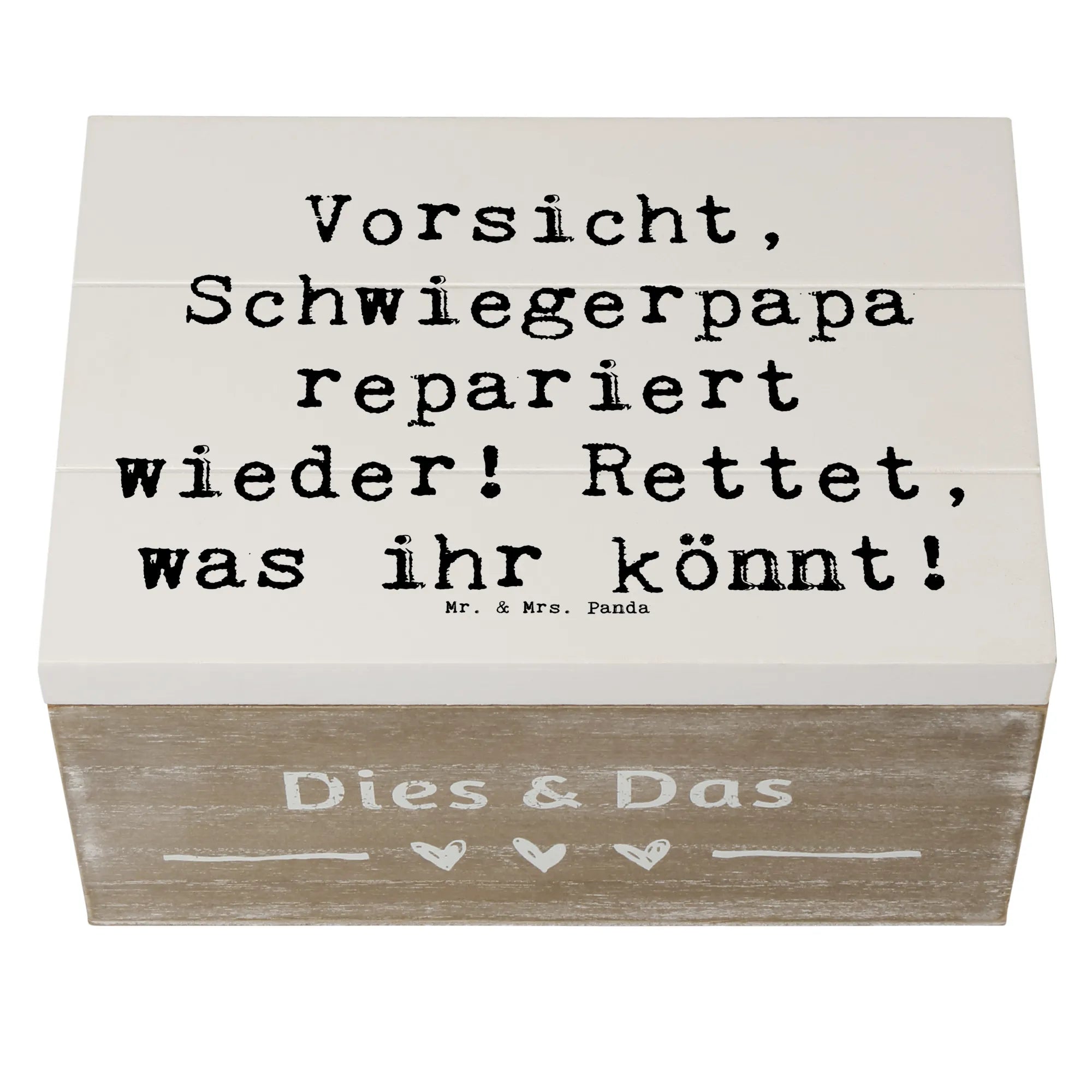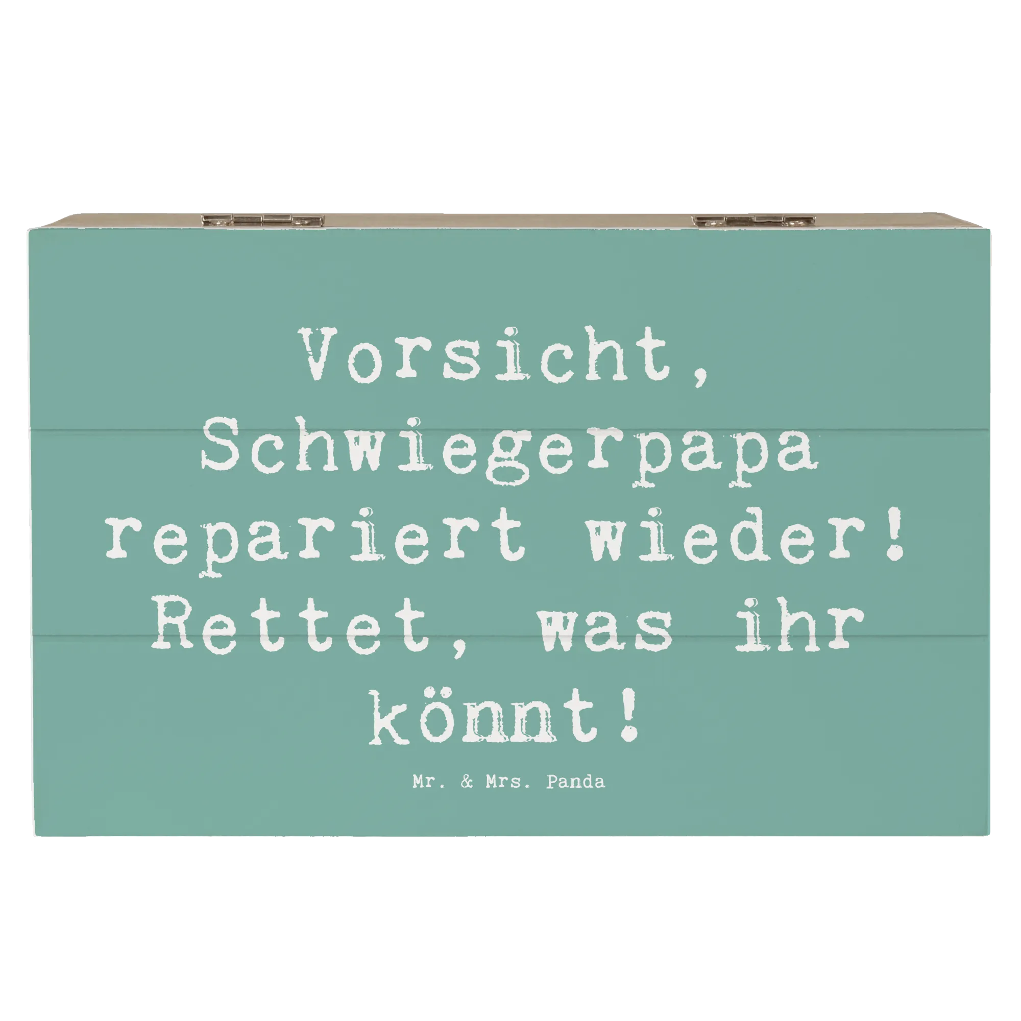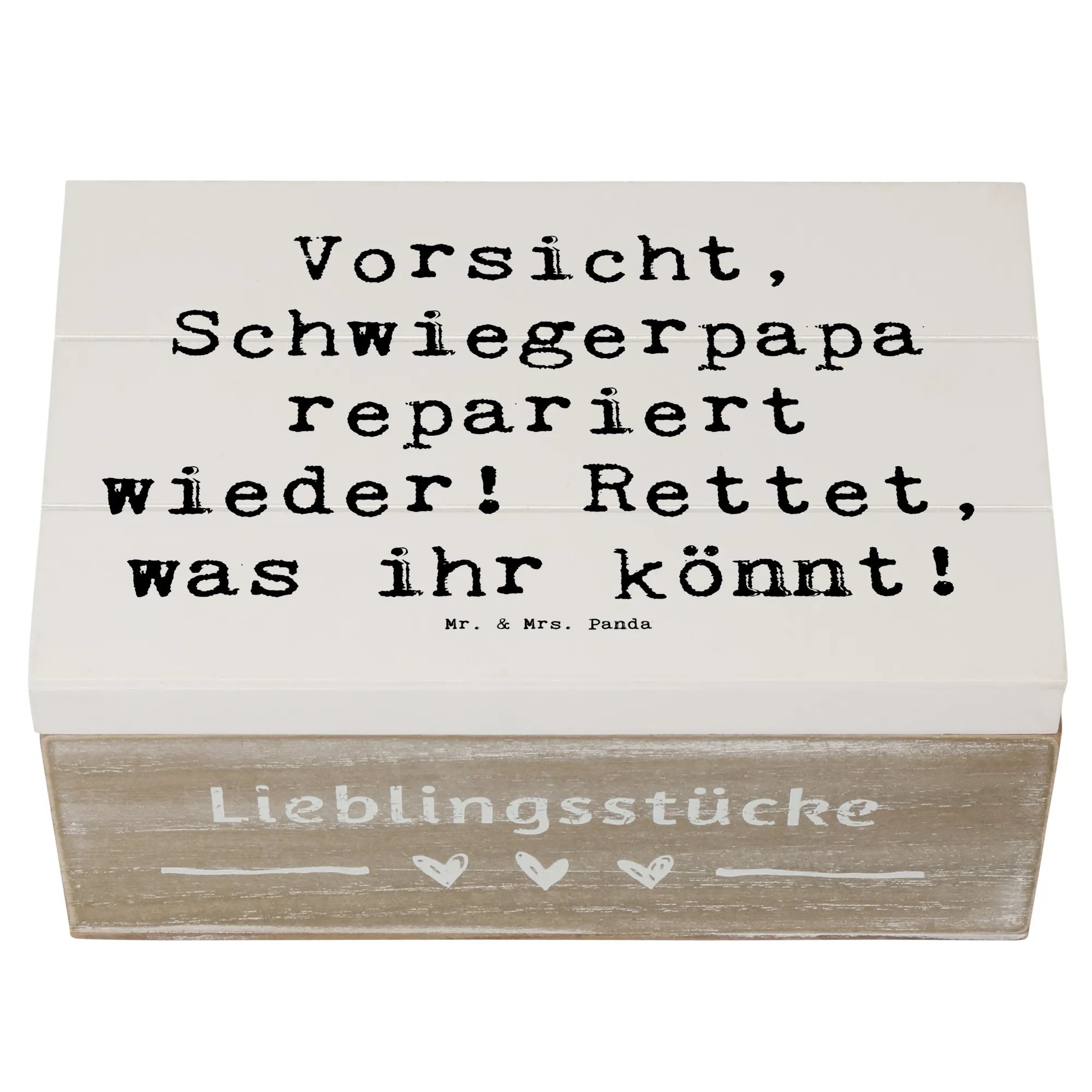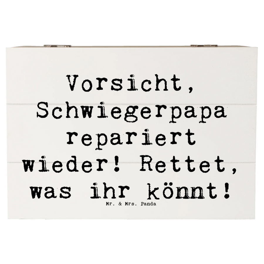 Die wunderschöne Holzkiste "Vorsicht, Schwiegerpapa repariert wieder! Rettet, was ihr könnt!" von Mr. & Mrs. Panda ist das perfekte Geschenk für all die großartigen Schwiegerpapas da draußen!