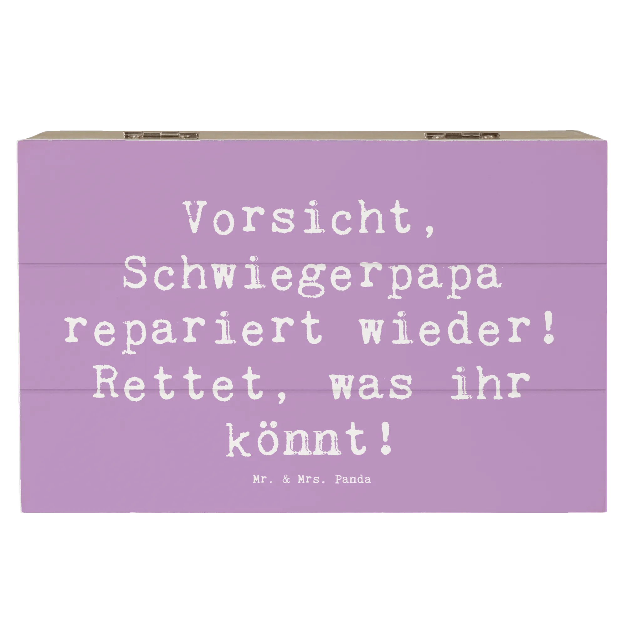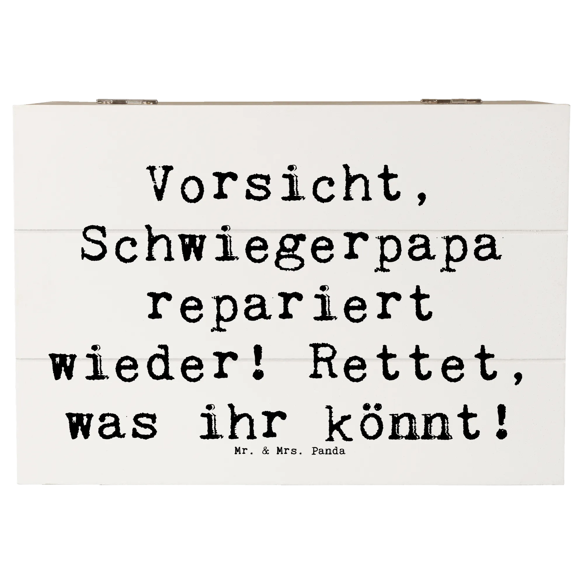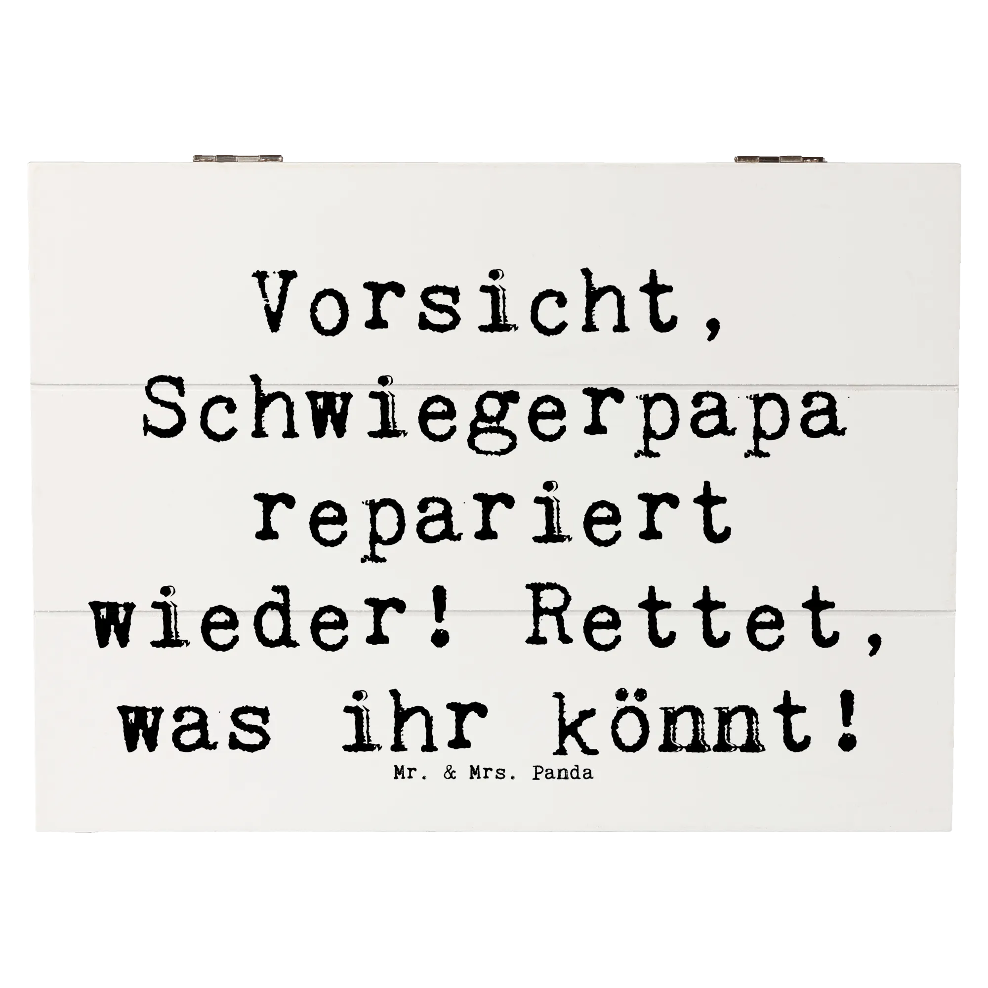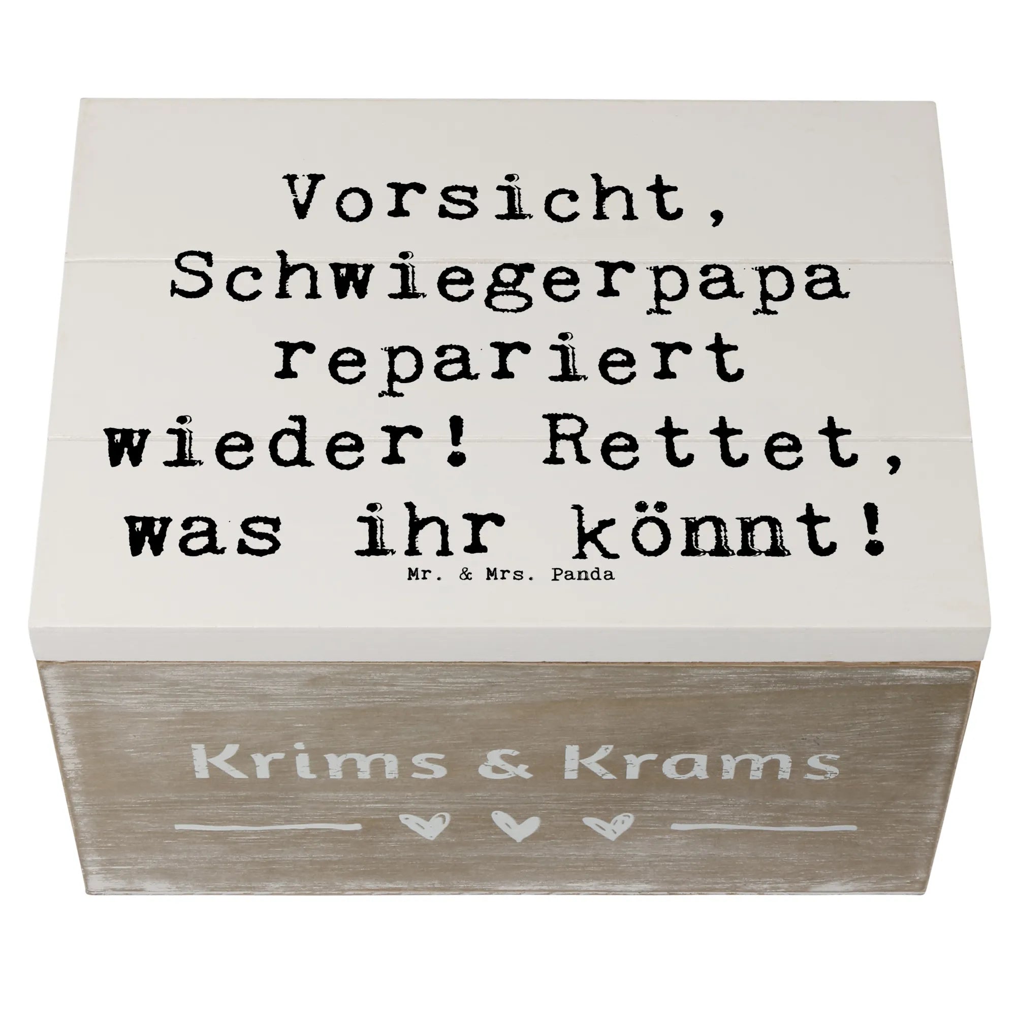 Die wunderschöne Holzkiste "Vorsicht, Schwiegerpapa repariert wieder! Rettet, was ihr könnt!" von Mr. & Mrs. Panda ist das perfekte Geschenk für all die großartigen Schwiegerpapas da draußen!