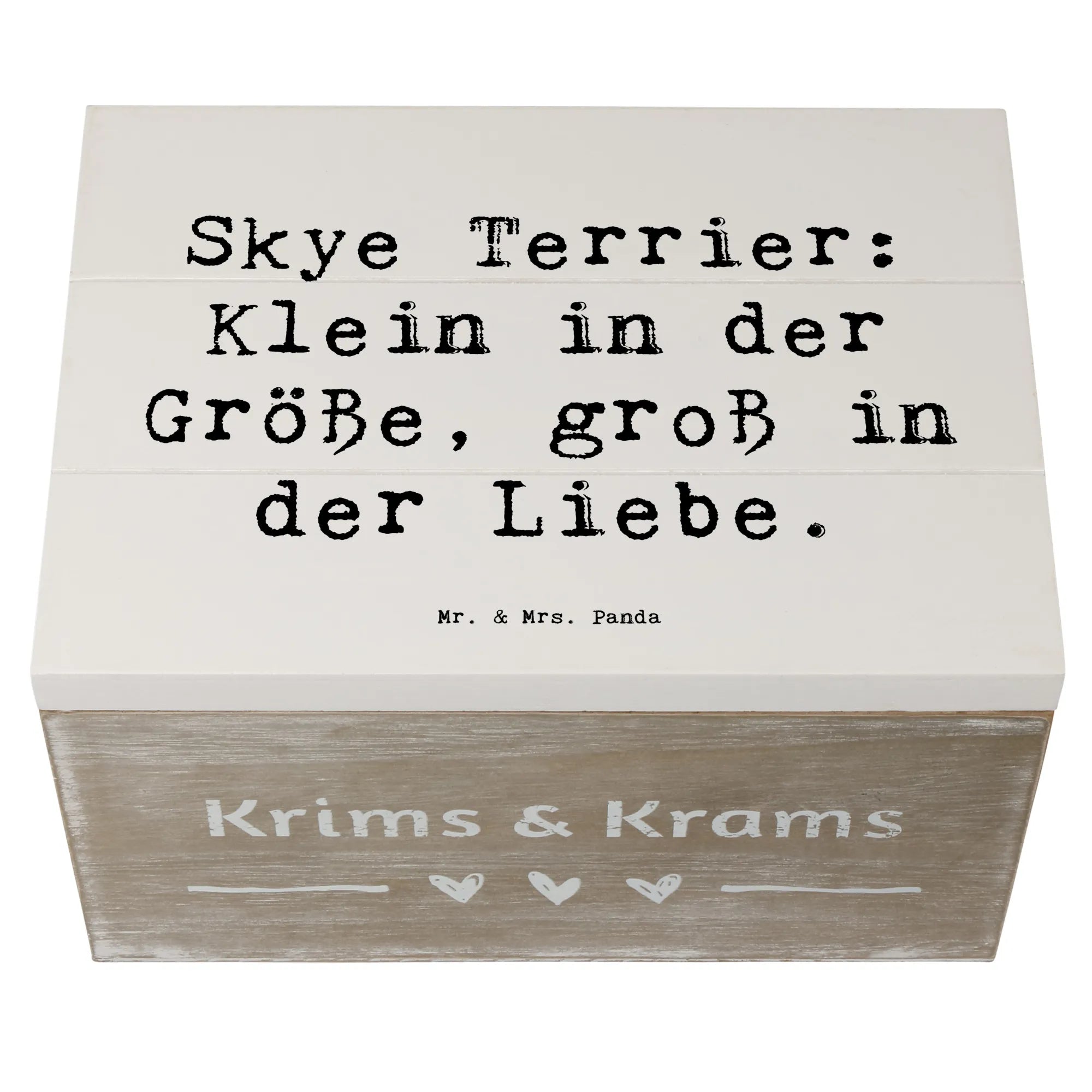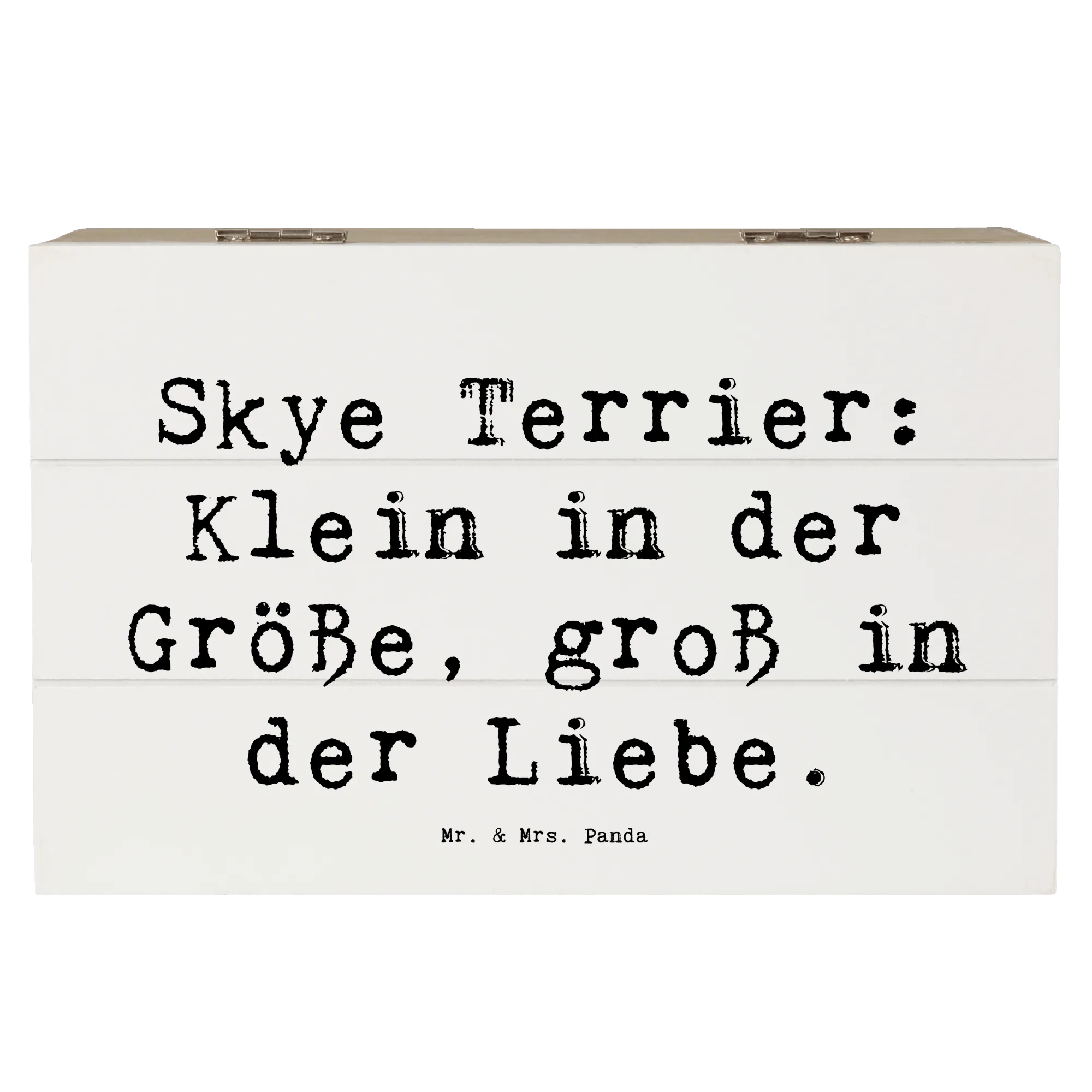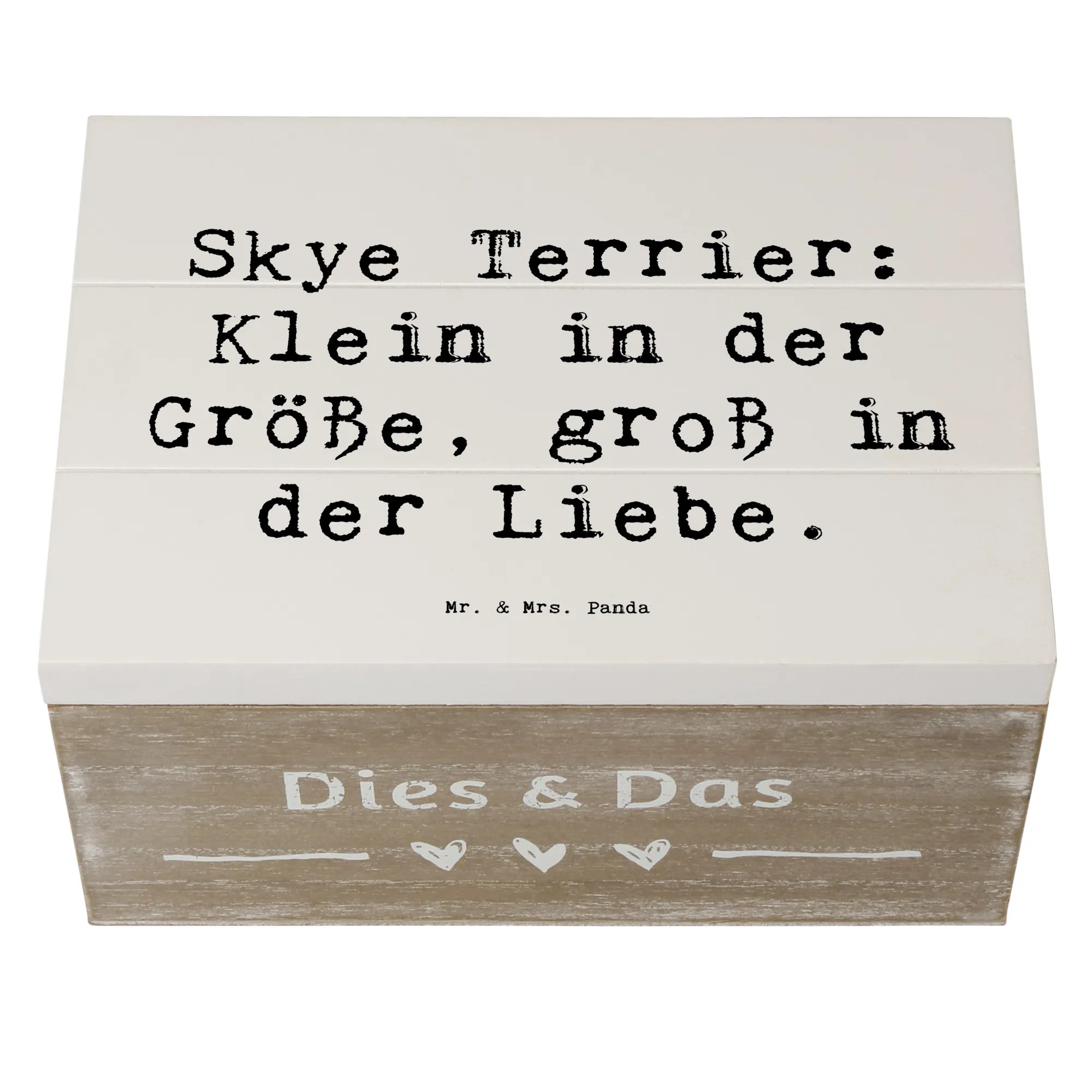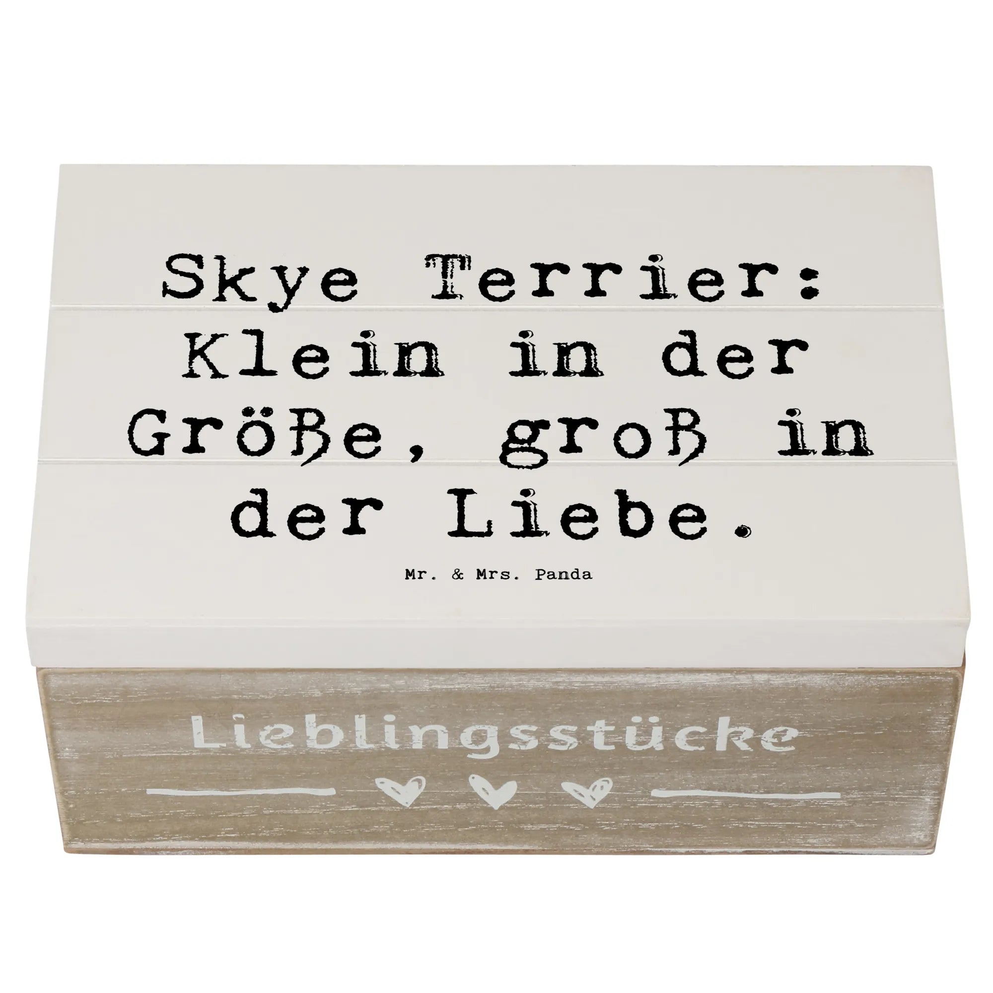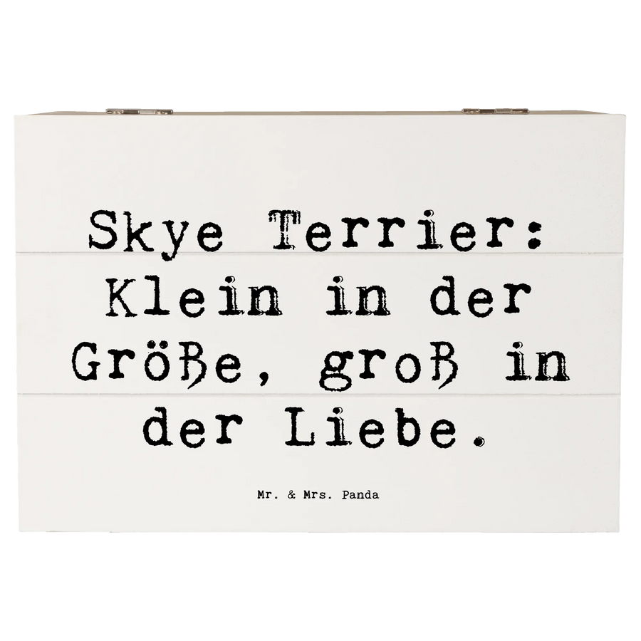 Entdecke die wundervolle Holzkiste von Mr. & Mrs. Panda, die mit dem liebevollen Motiv des Skye Terriers bedruckt ist. Diese Kiste ist nicht nur ein echter Hingucker, sondern auch der perfekte Aufbewahrungsort für Deine schönsten Schätze. Egal, ob Du Erinnerungen an besondere Anlässe, Kindheitserinnerungen oder einfach nur Fotos sammeln möchtest, diese Erinnerungskiste ist genau das Richtige für Dich! Mit einem liebevollen Spruch, der sagt: „Skye Terrier: Klein in der Größe, groß in der Liebe“, wird die Kiste zu einem ganz besonderen Geschenk für jeden Hundefan.