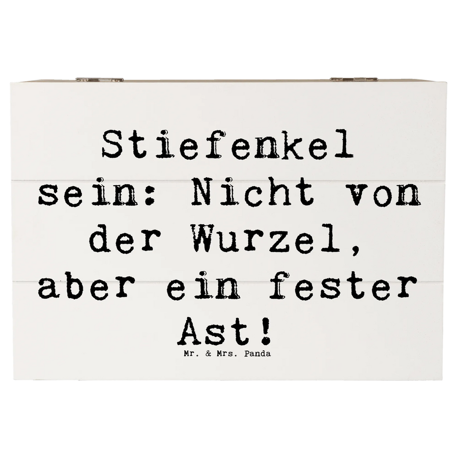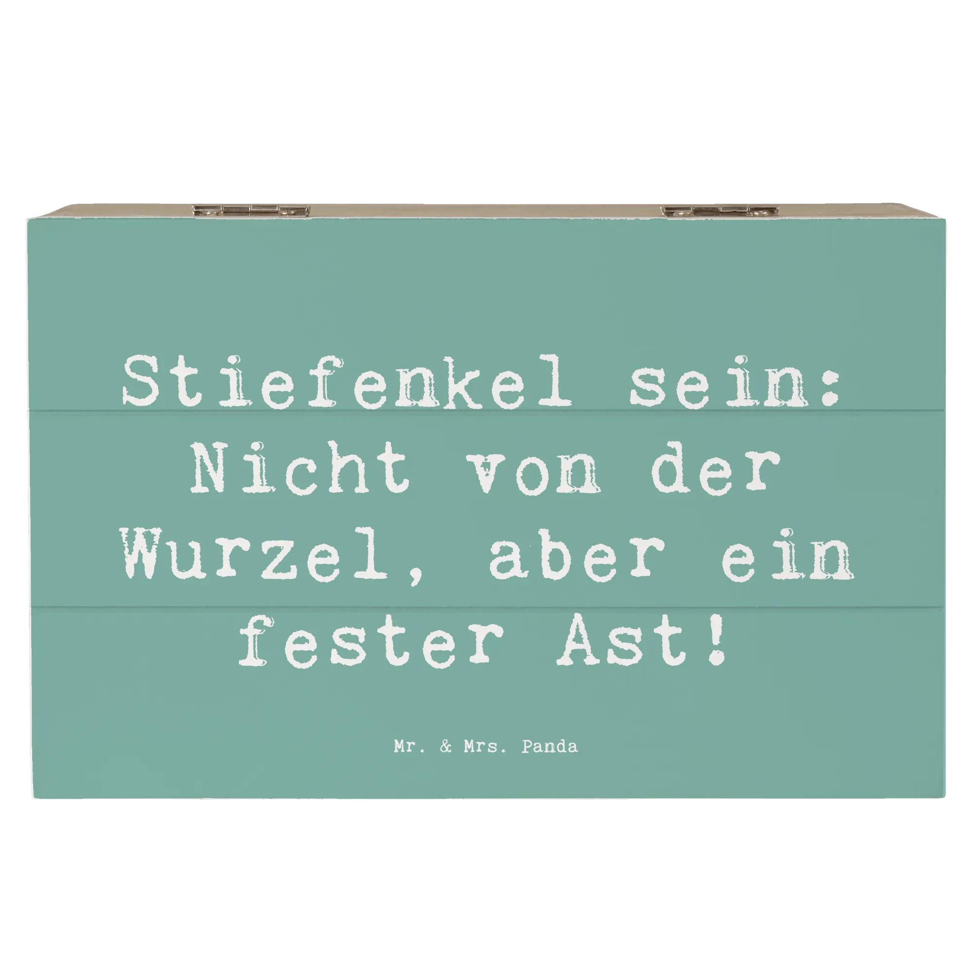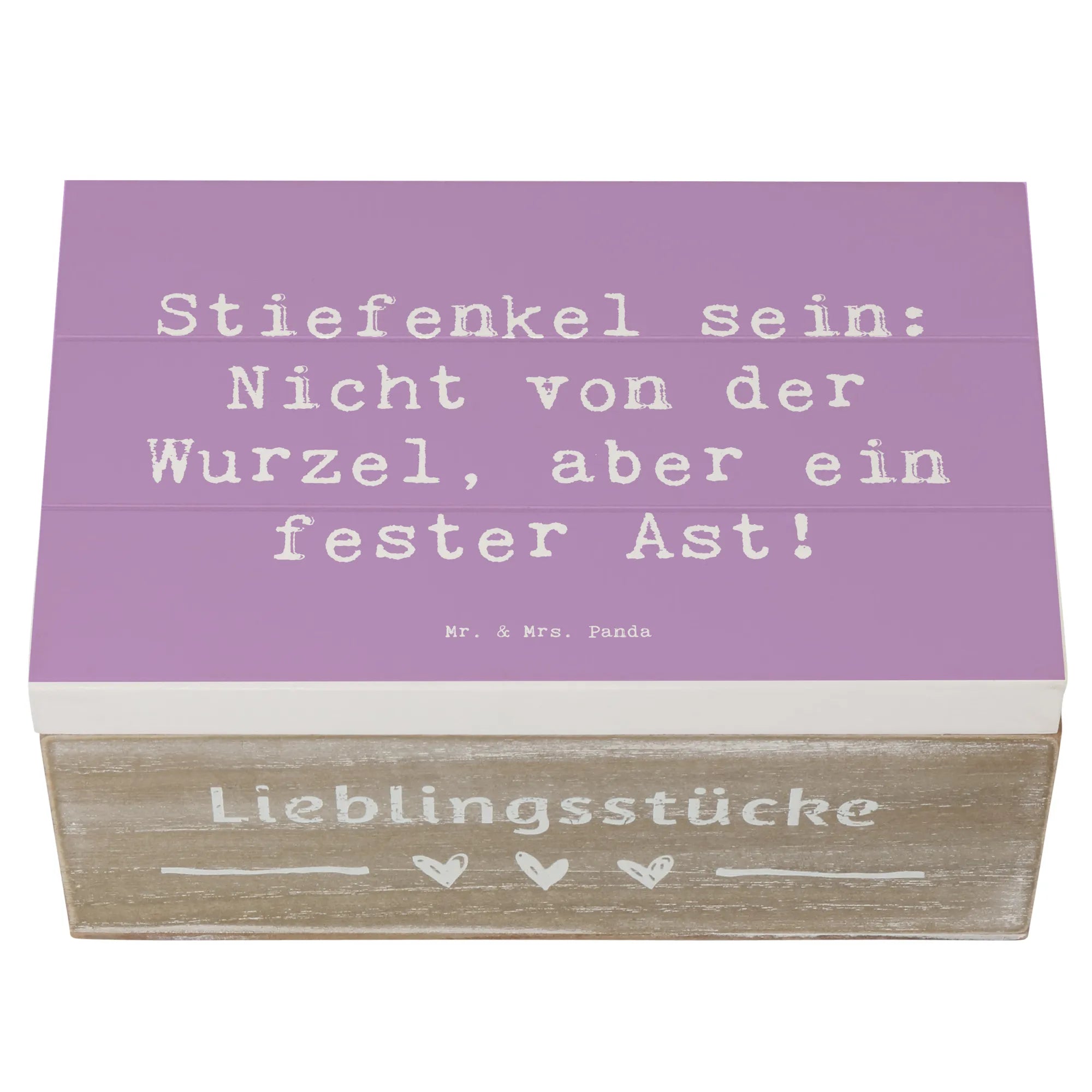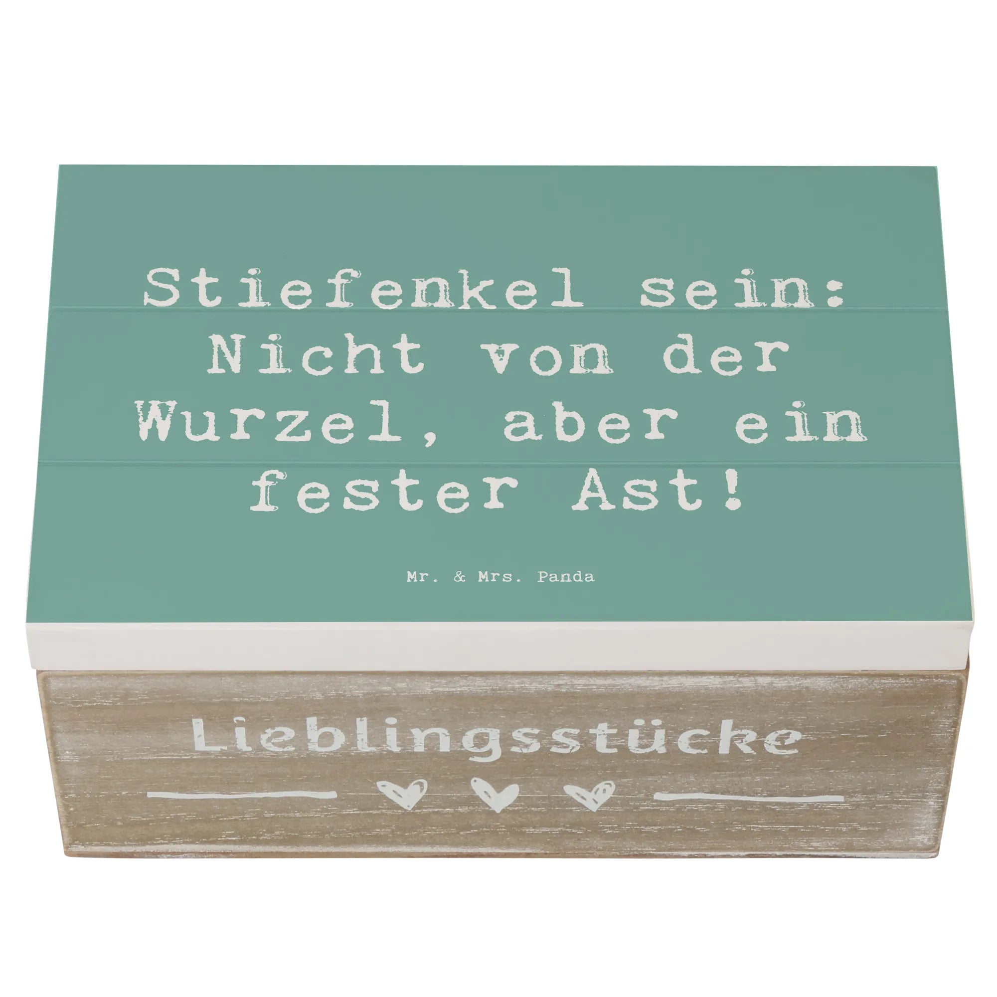 Die Holzkiste 'Stiefenkel sein: Nicht von der Wurzel, aber ein fester Ast!' von Mr. & Mrs. Panda ist das perfekte Geschenk für Großeltern und Familienmitglieder, die die besonderen Beziehungen in modernen Patchworkfamilien feiern möchten.