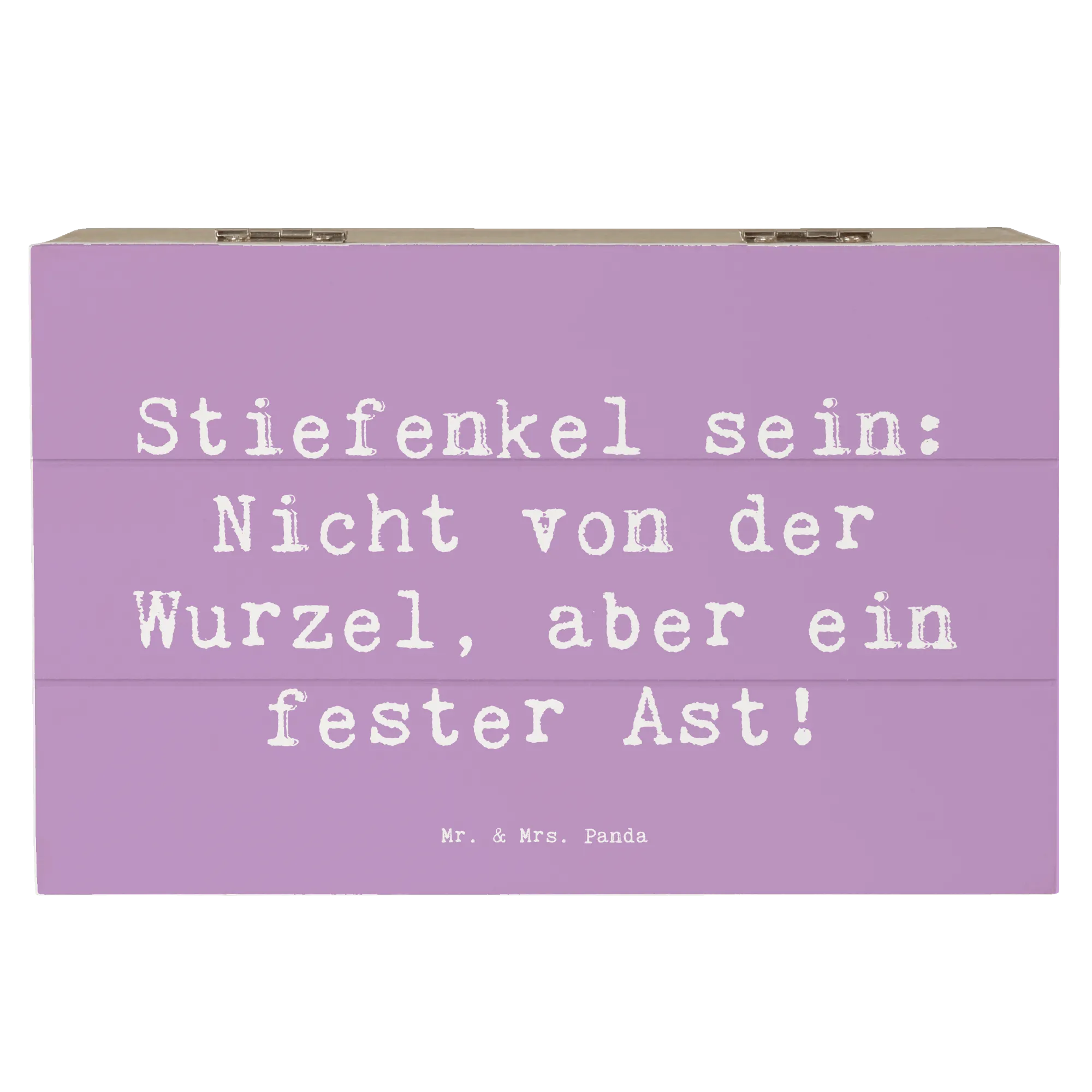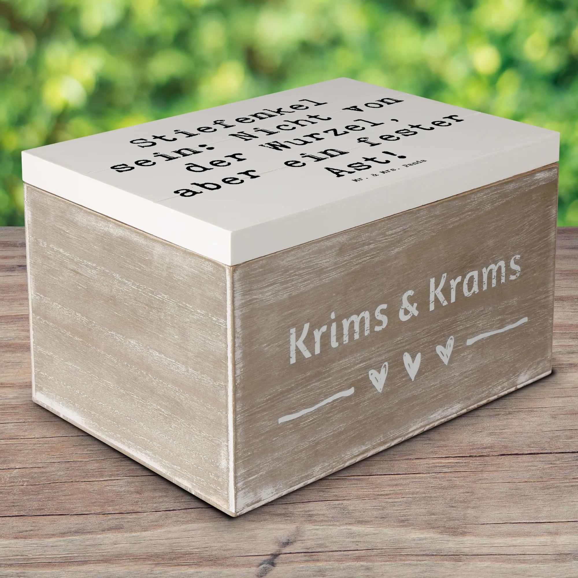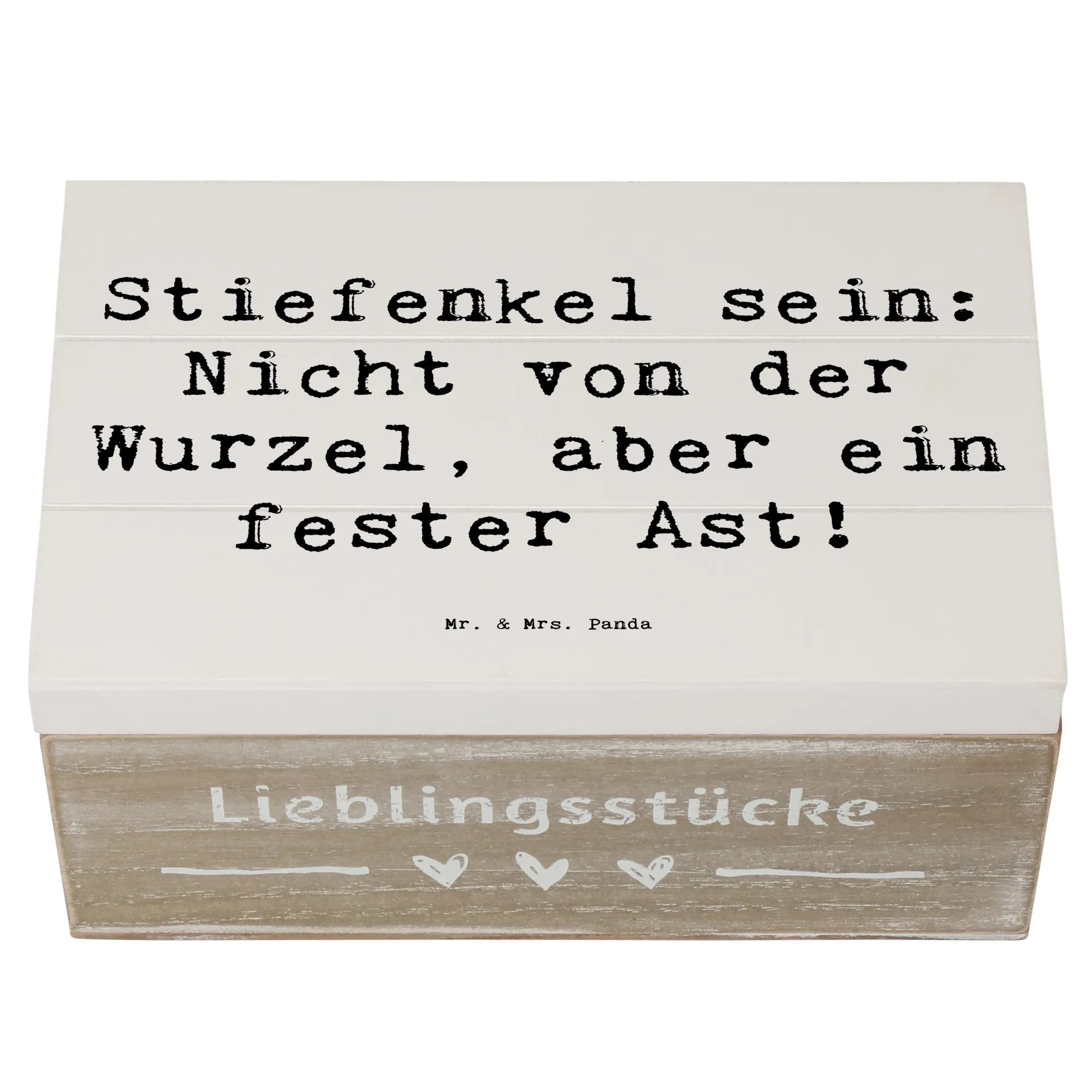Die Holzkiste 'Stiefenkel sein: Nicht von der Wurzel, aber ein fester Ast!' von Mr. & Mrs. Panda ist das perfekte Geschenk für Großeltern und Familienmitglieder, die die besonderen Beziehungen in modernen Patchworkfamilien feiern möchten.