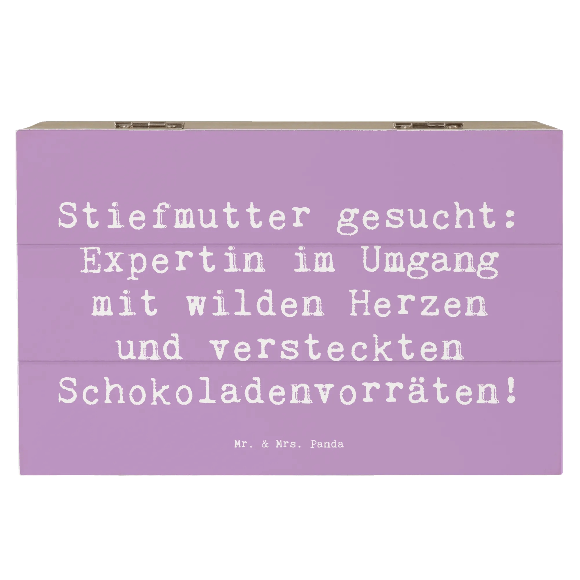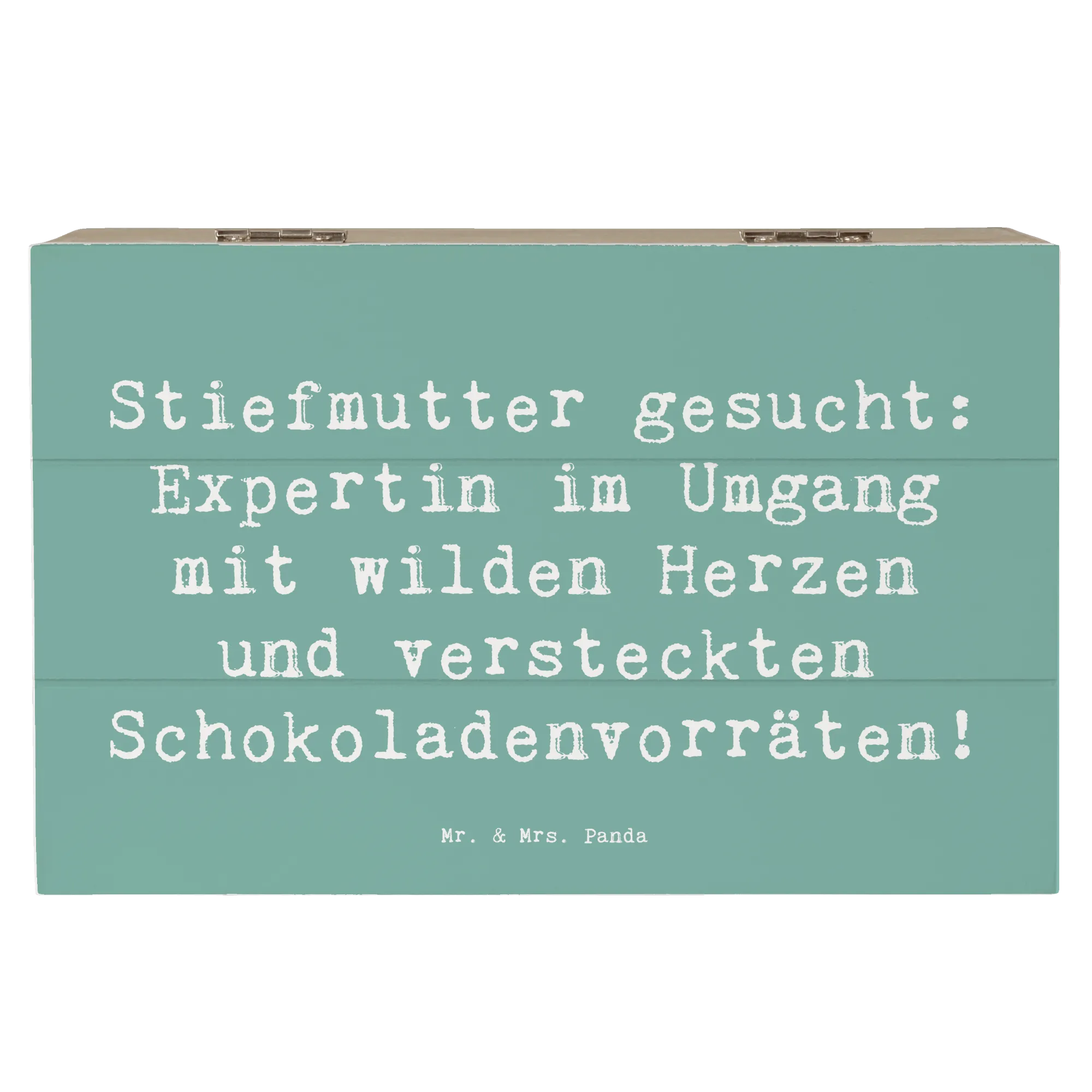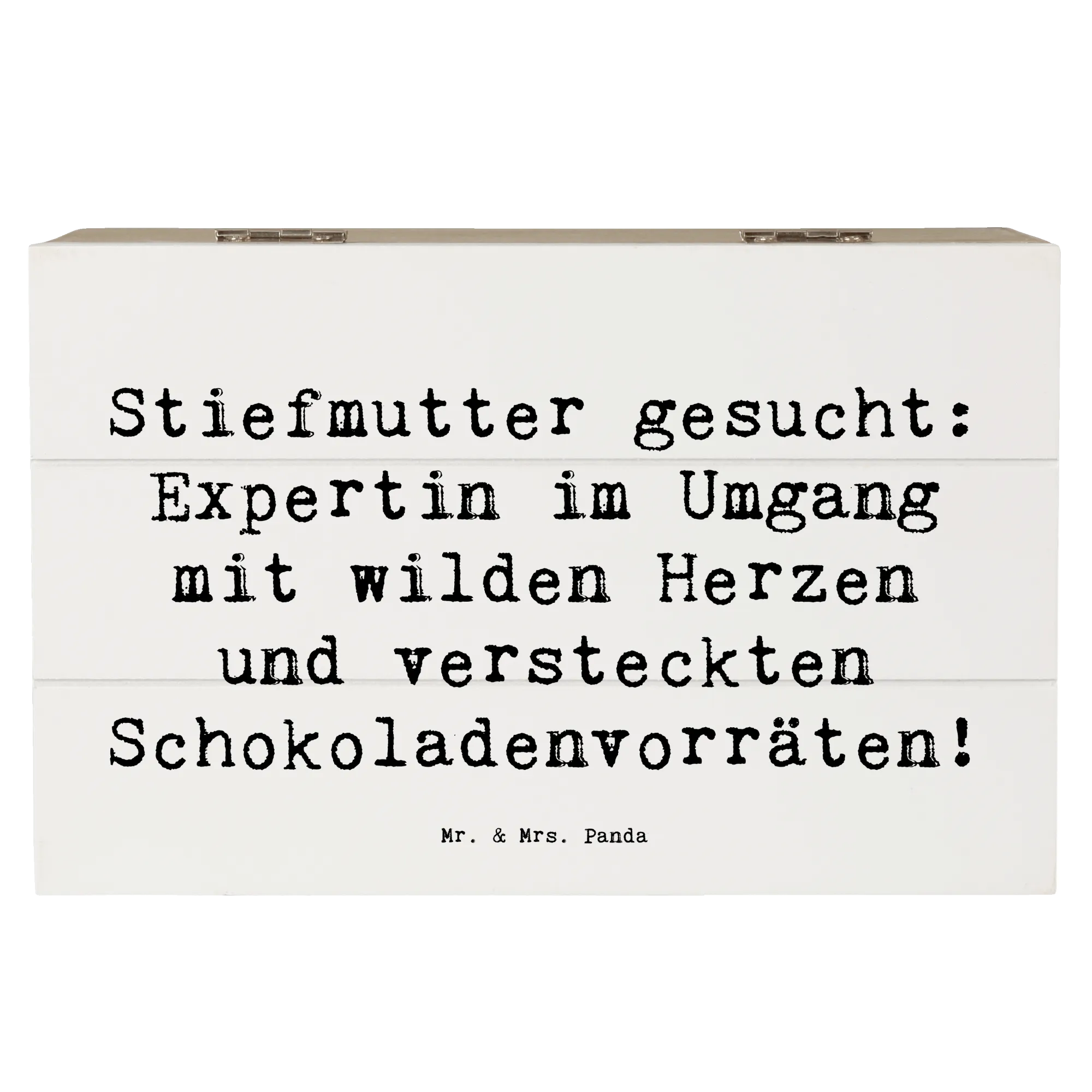 Die wunderschöne Holzkiste von Mr. & Mrs. Panda ist das perfekte Geschenk für all jene, die eine Stiefmutter in ihrem Leben wertschätzen. Der originelle Spruch "Stiefmutter gesucht: Expertin im Umgang mit wilden Herzen und versteckten Schokoladenvorräten!" bringt genau das auf den Punkt.