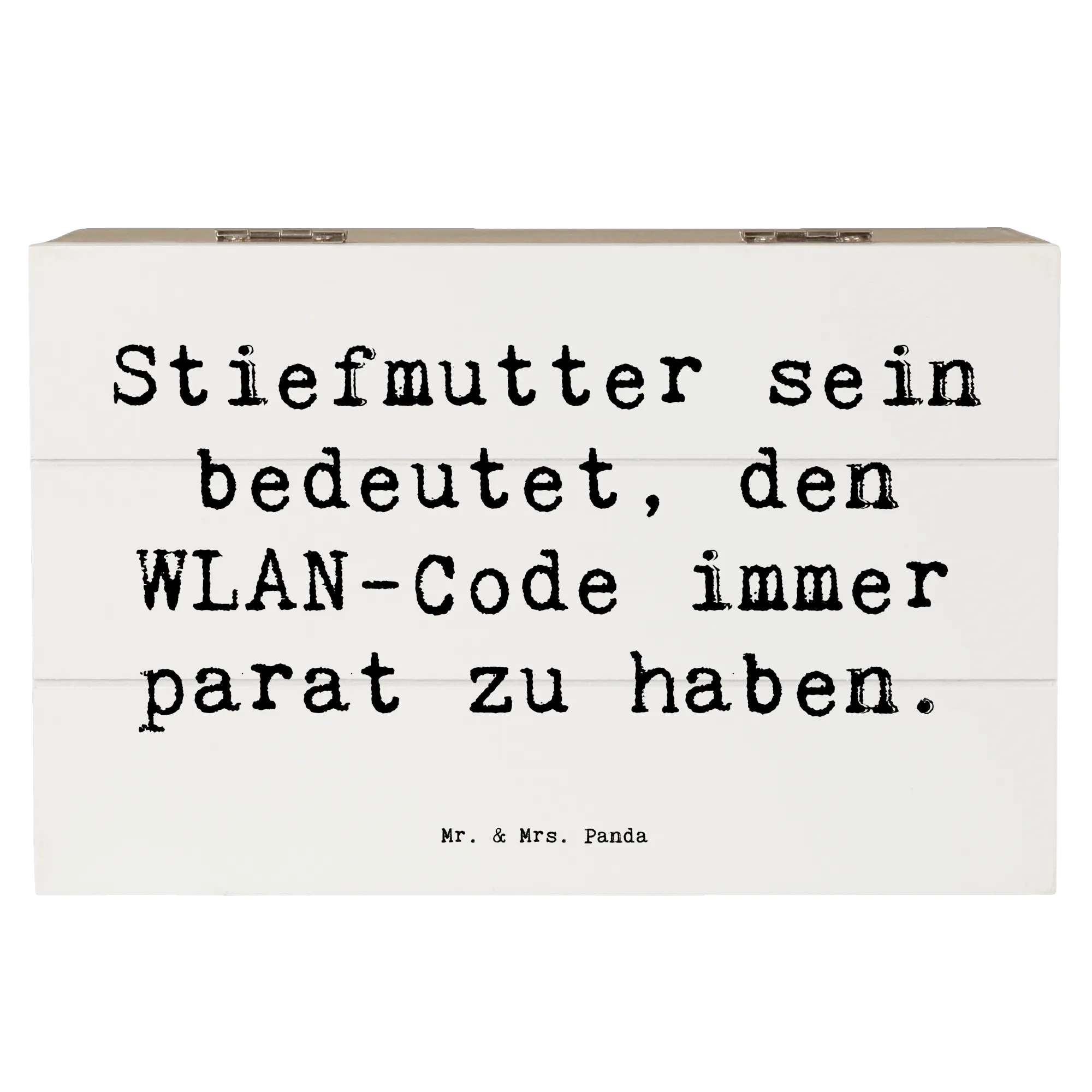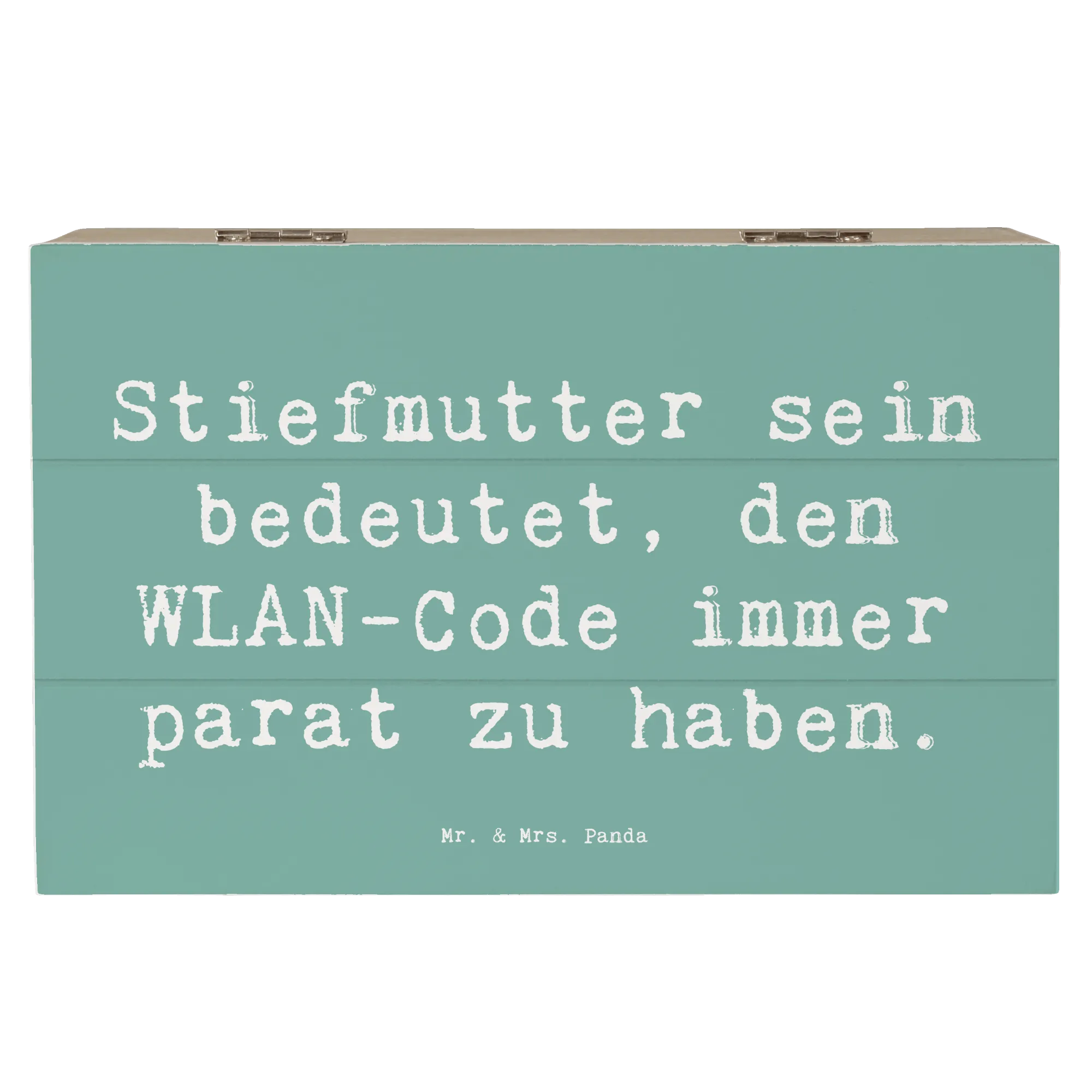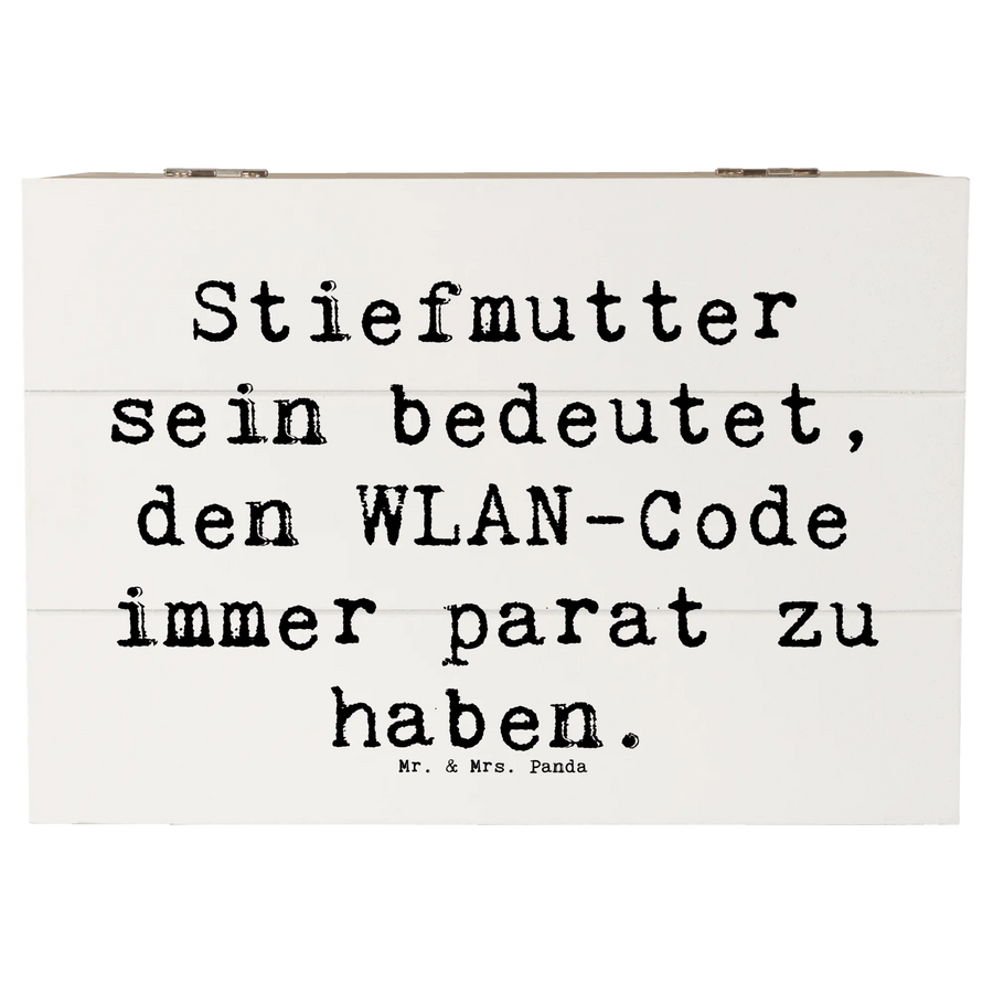 Die wunderschöne Holzkiste von Mr. & Mrs. Panda ist das perfekte Geschenk für jede Stiefmutter und ein unverzichtbares Accessoire für jede Patchwork-Familie. Mit einem ganz besonderen Aufdruck, der den Slogan 'Stiefmutter sein bedeutet, den WLAN-Code immer parat zu haben.' präsentiert, bringt diese Kiste nicht nur Ordnung in das Zuhause, sondern auch ein Lächeln in das Gesicht der Beschenkten.