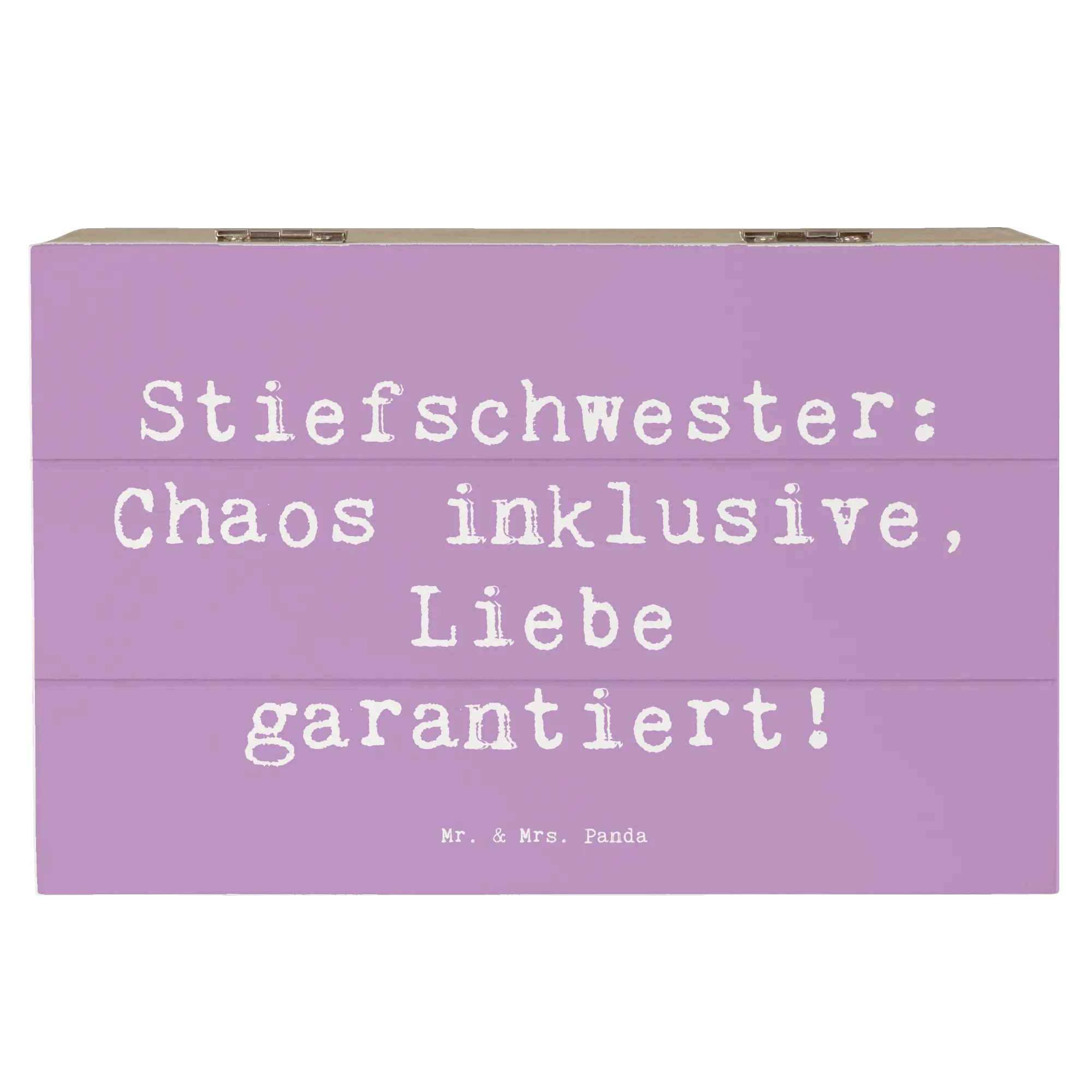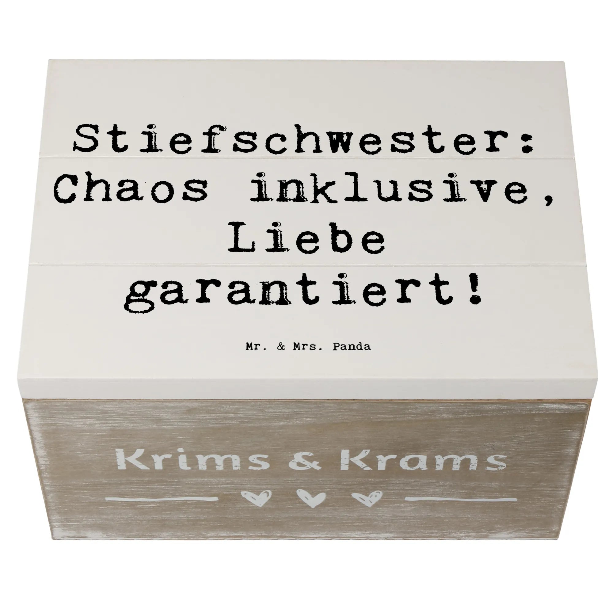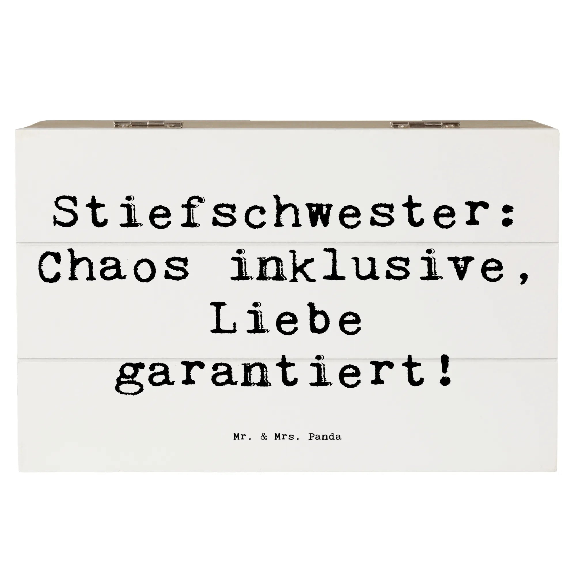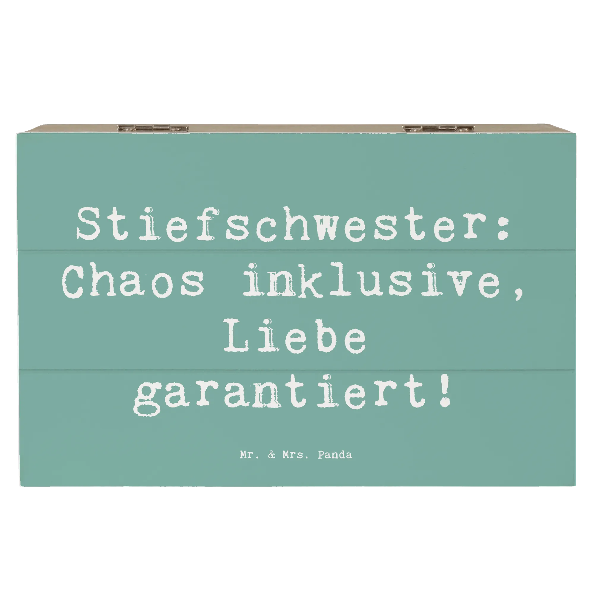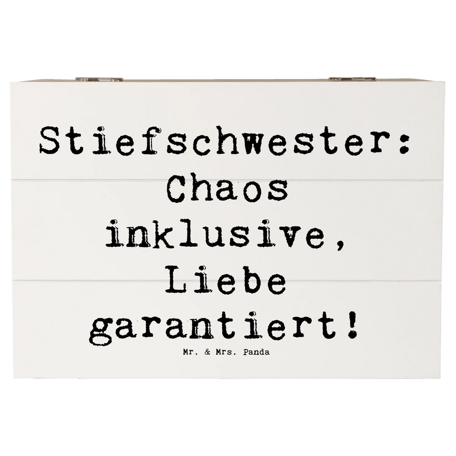 Die wunderschöne Holzkiste von Mr. & Mrs. Panda ist das perfekte Geschenk für Deine Stiefschwester! Mit dem spritzigen Motto "Stiefschwester: Chaos inklusive, Liebe garantiert!" aus unserer besonderen Kollektion Familie & Verwandte, wird jede Aufbewahrung zu einem besonderen Erlebnis.
