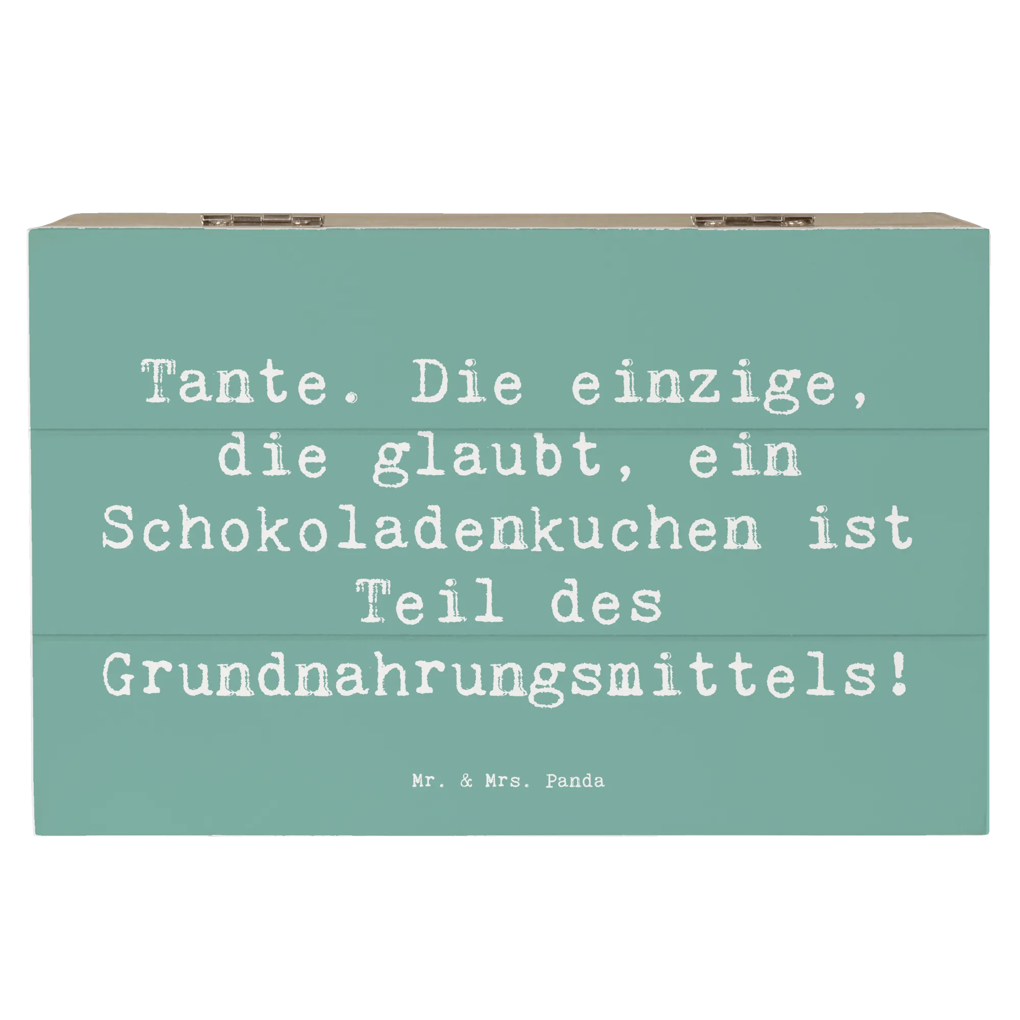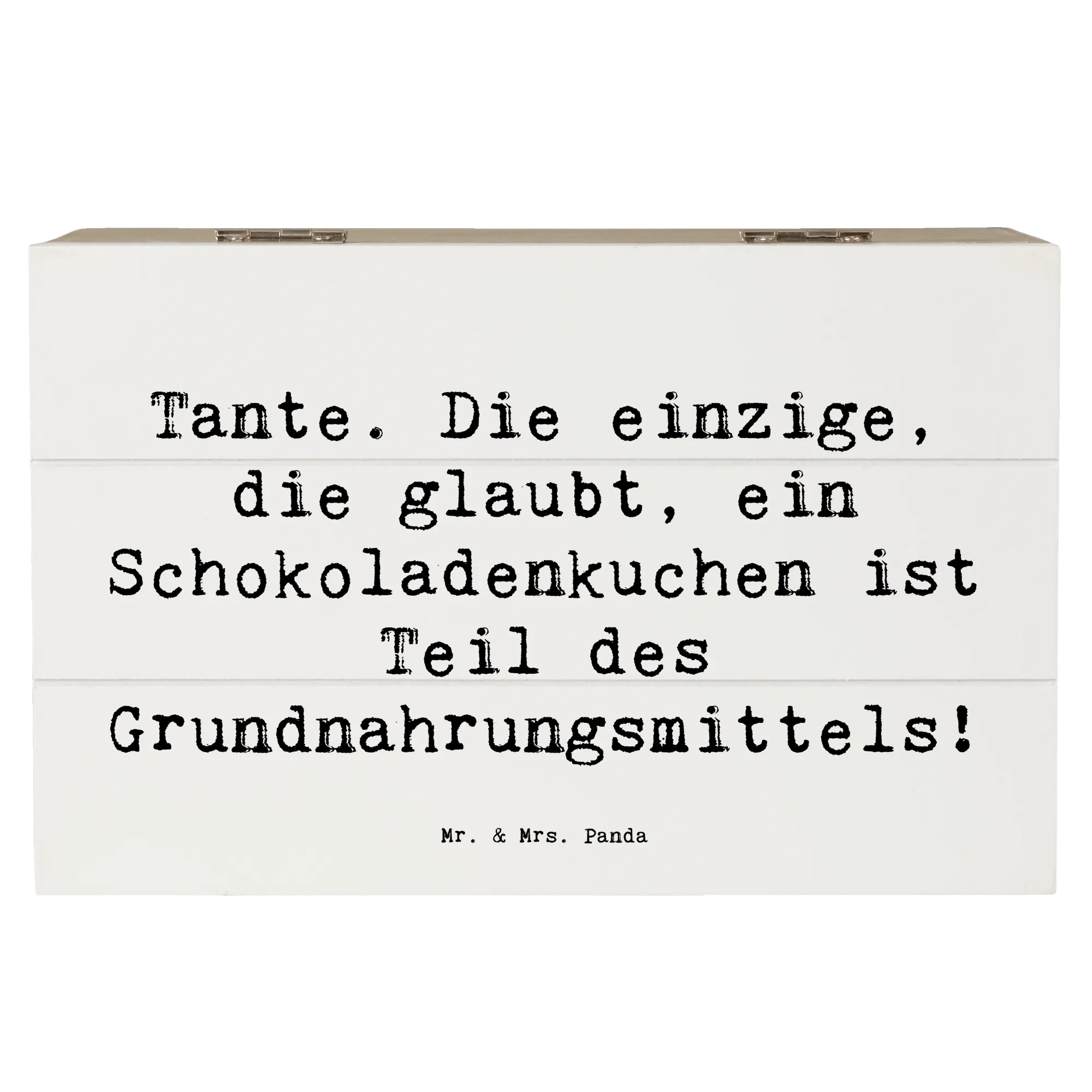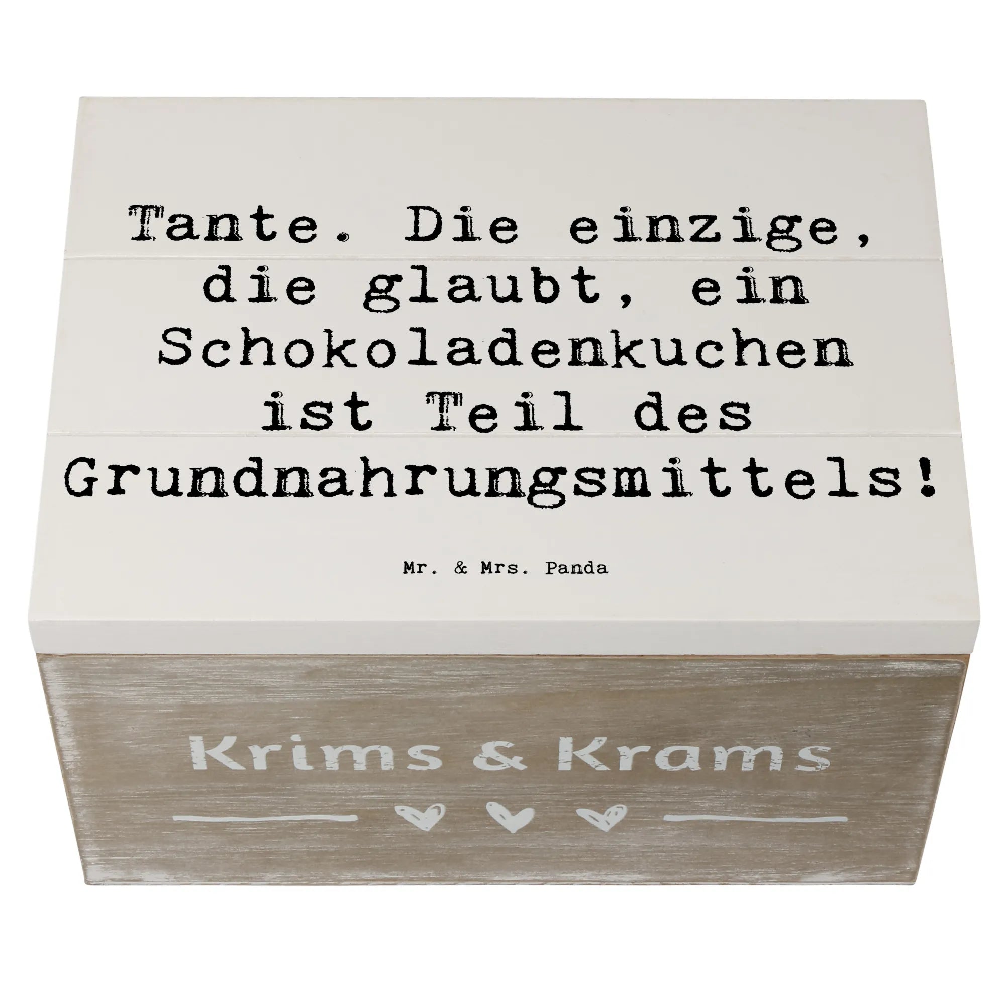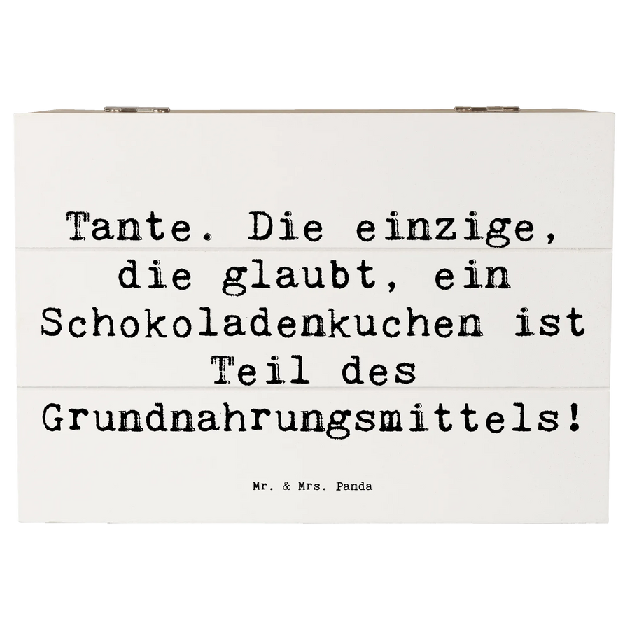 Mit dem herzlichen Spruch "Tante. Die einzige, die glaubt, ein Schokoladenkuchen ist Teil des Grundnahrungsmittels!" sorgt die Kiste für viele Schmunzler und Erinnerungen. Aufgrund ihrer stabilen Verarbeitung und der Einschlagscharniere lässt sich die Kiste einfach öffnen und schließen.