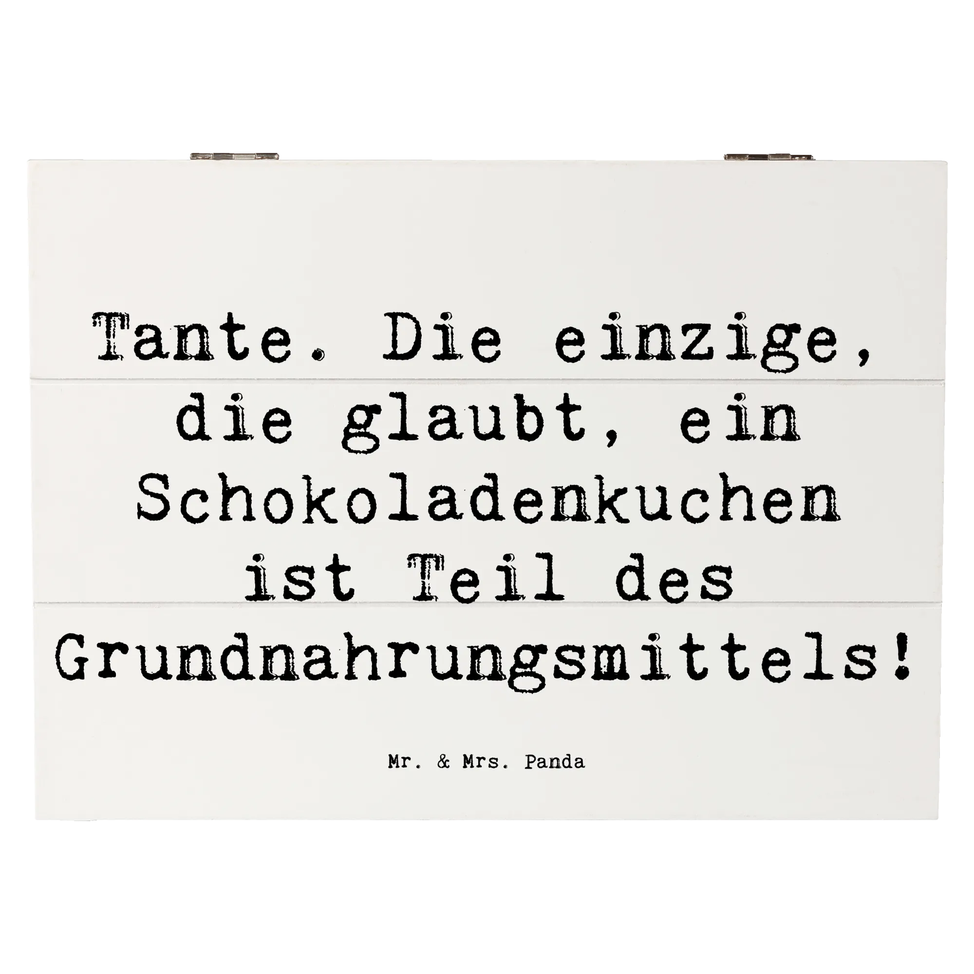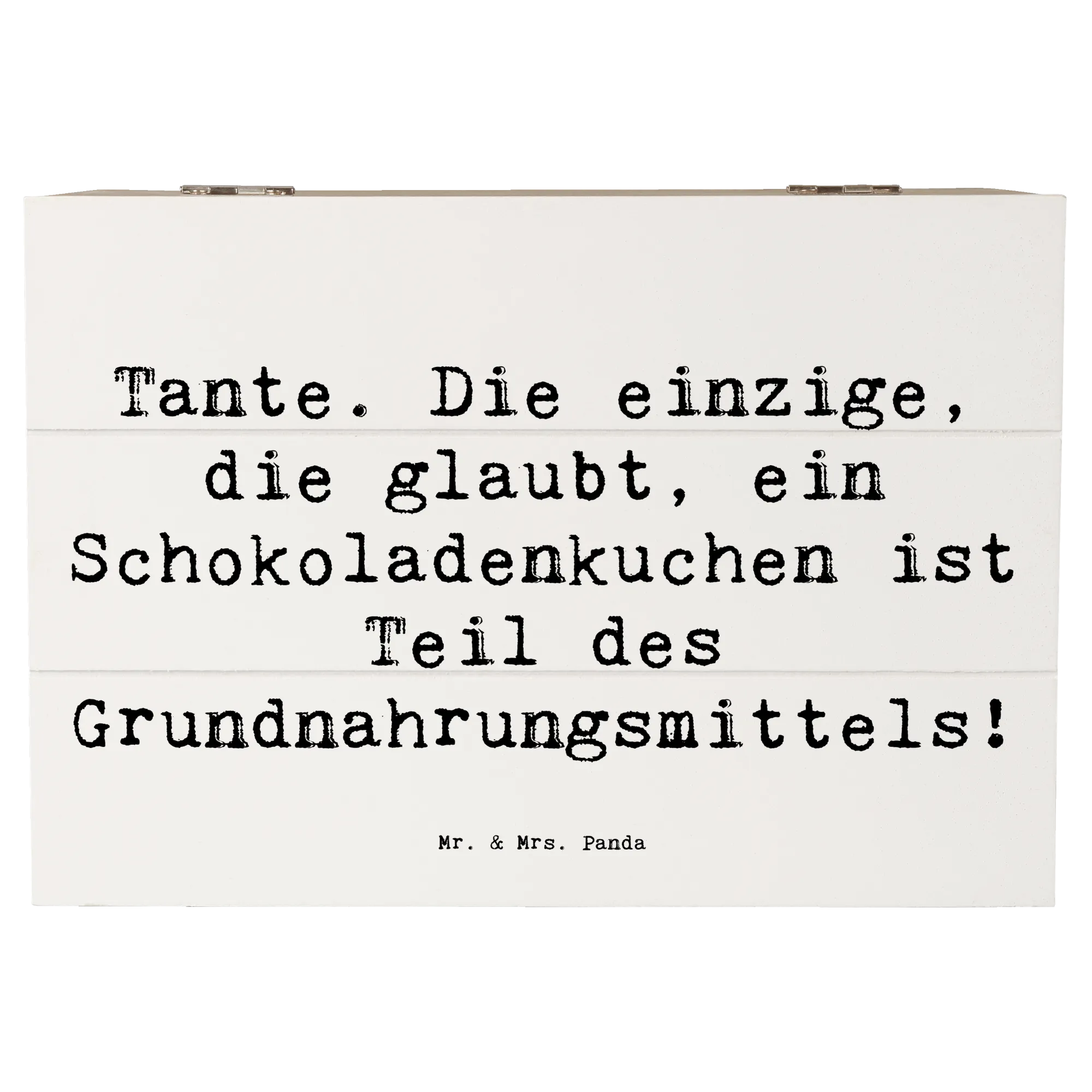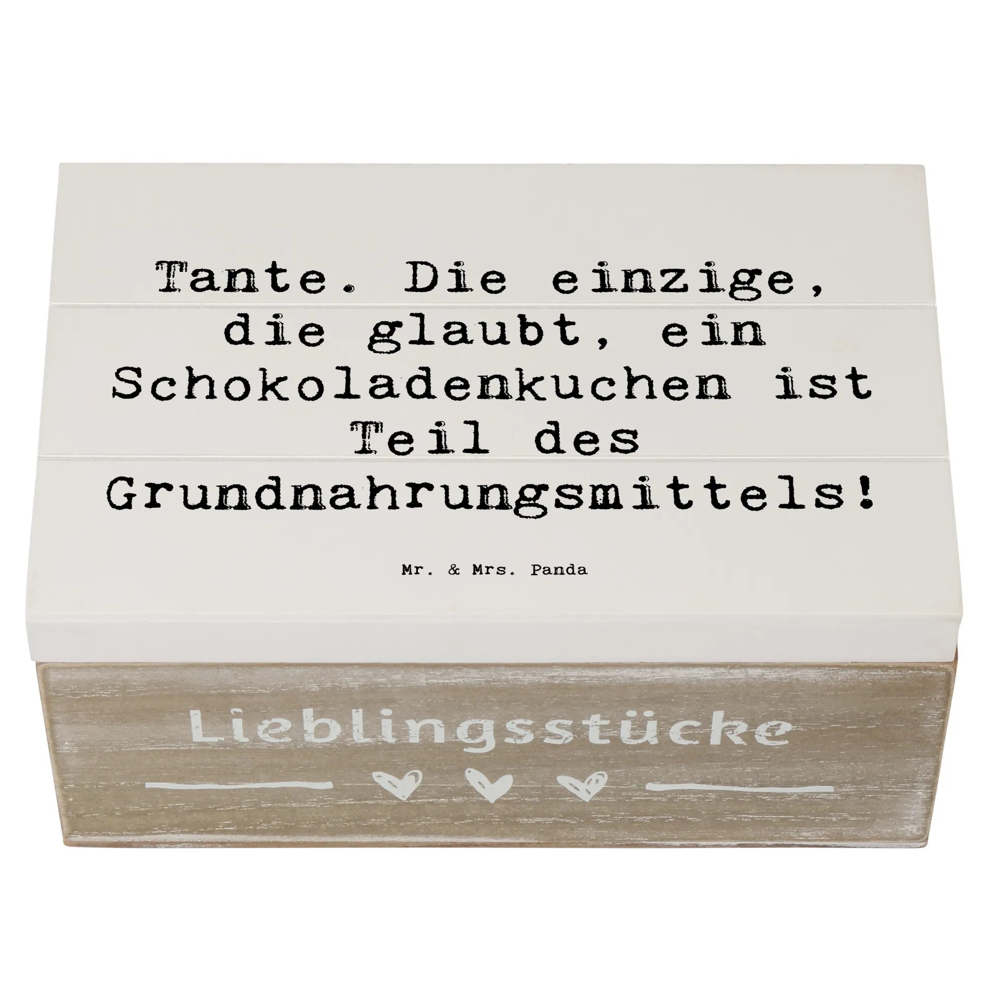 Mit dem herzlichen Spruch "Tante. Die einzige, die glaubt, ein Schokoladenkuchen ist Teil des Grundnahrungsmittels!" sorgt die Kiste für viele Schmunzler und Erinnerungen. Aufgrund ihrer stabilen Verarbeitung und der Einschlagscharniere lässt sich die Kiste einfach öffnen und schließen.