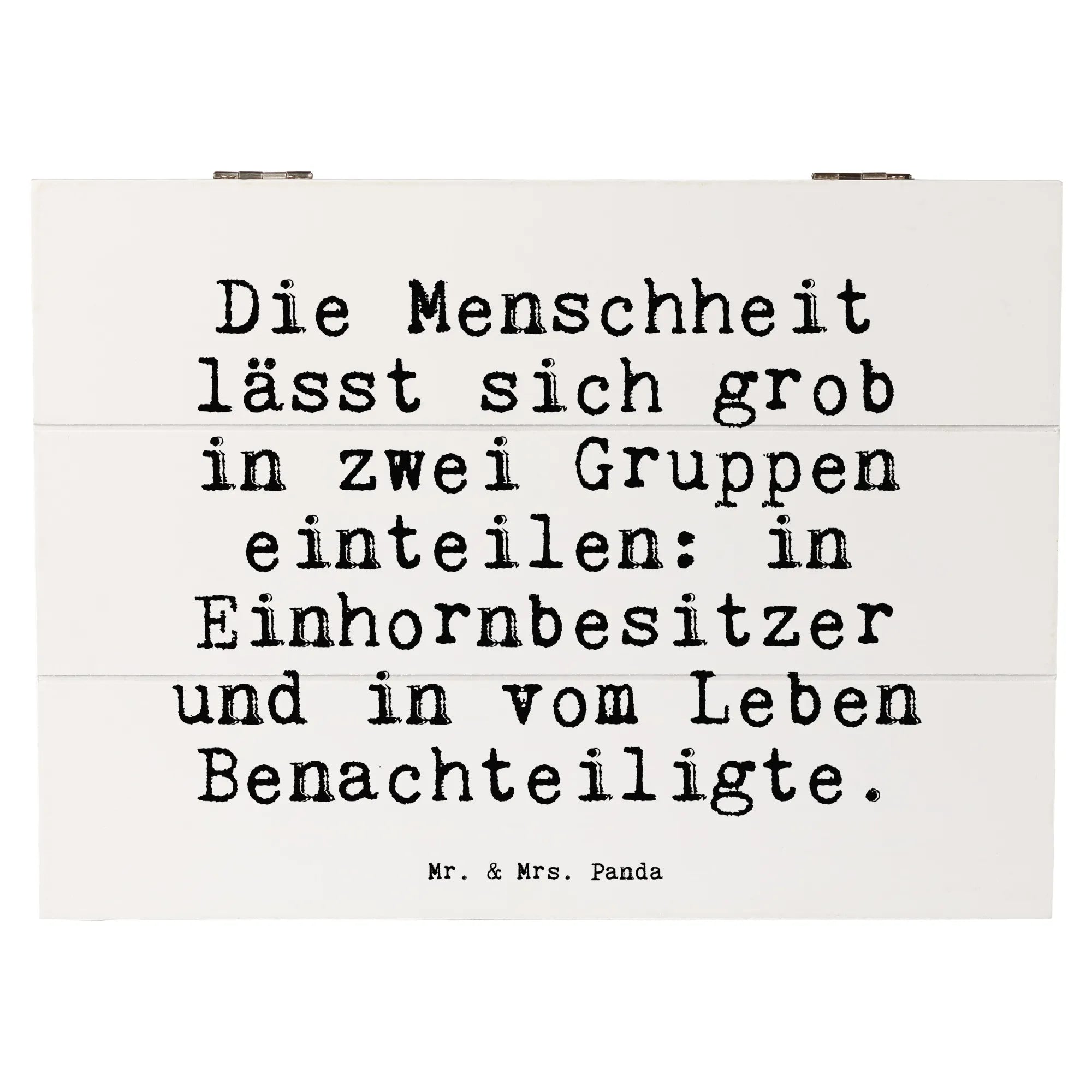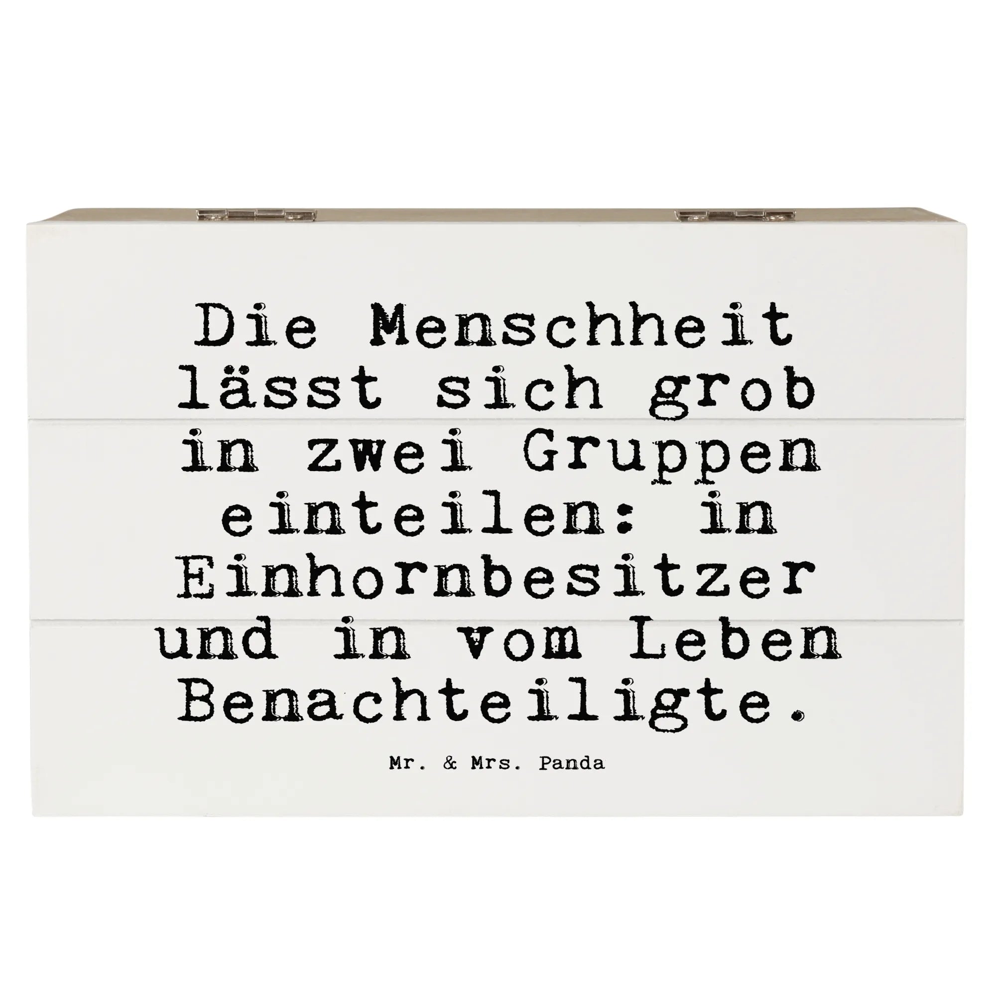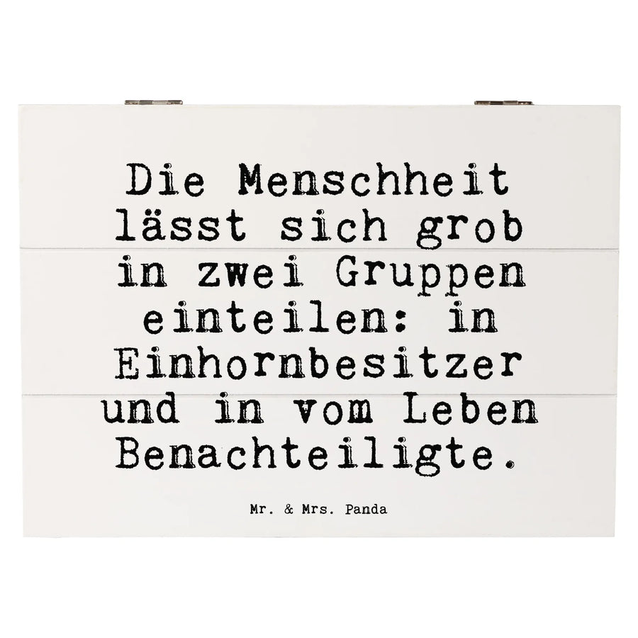 Die wunderschöne Holzkiste von Mr. & Mrs. Panda ist das perfekte Geschenk für alle, die Einhörner lieben und einen Hauch von Magie in ihr Leben bringen möchten. Mit dem liebevollen Spruch "Die Menschheit lässt sich grob in zwei Gruppen einteilen: in Einhornbesitzer und in vom Leben Benachteiligte." bringt diese Kiste nicht nur ein Lächeln auf die Gesichter, sondern bietet außerdem einen idealen Aufbewahrungsort für all deine Schätze.