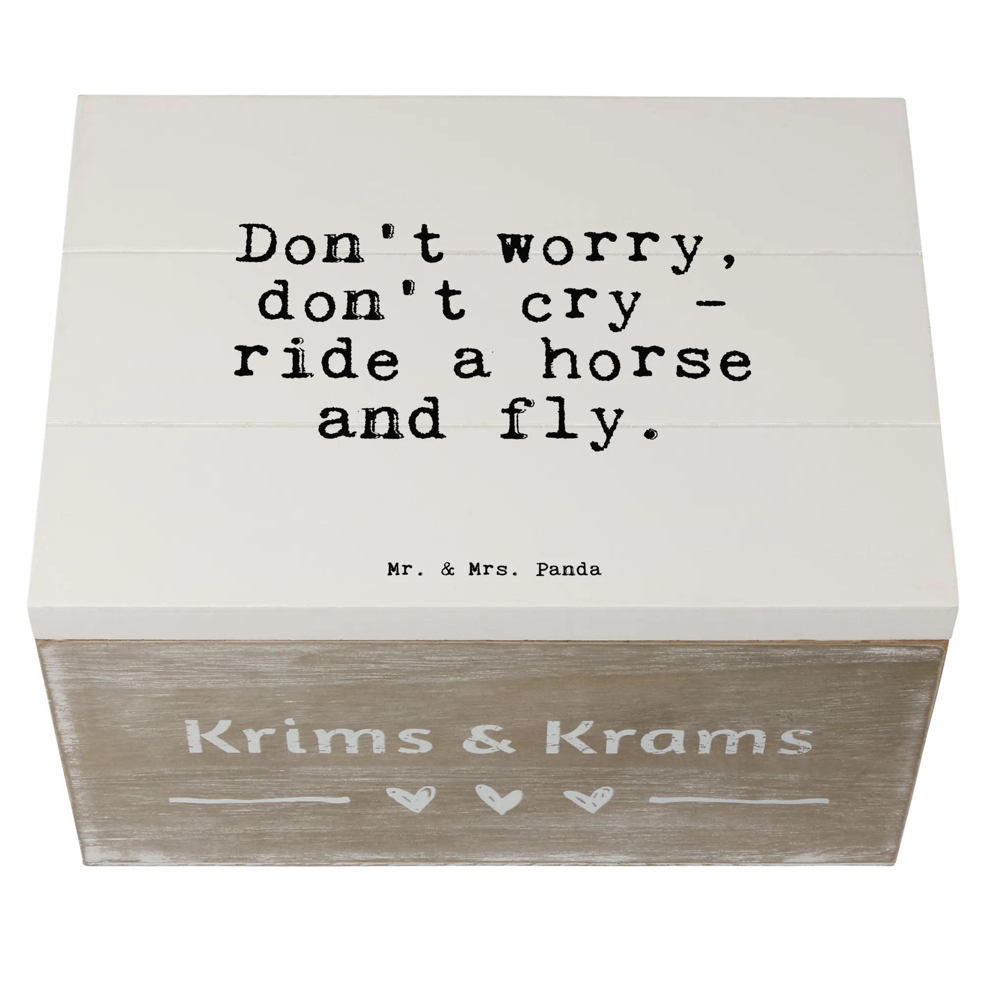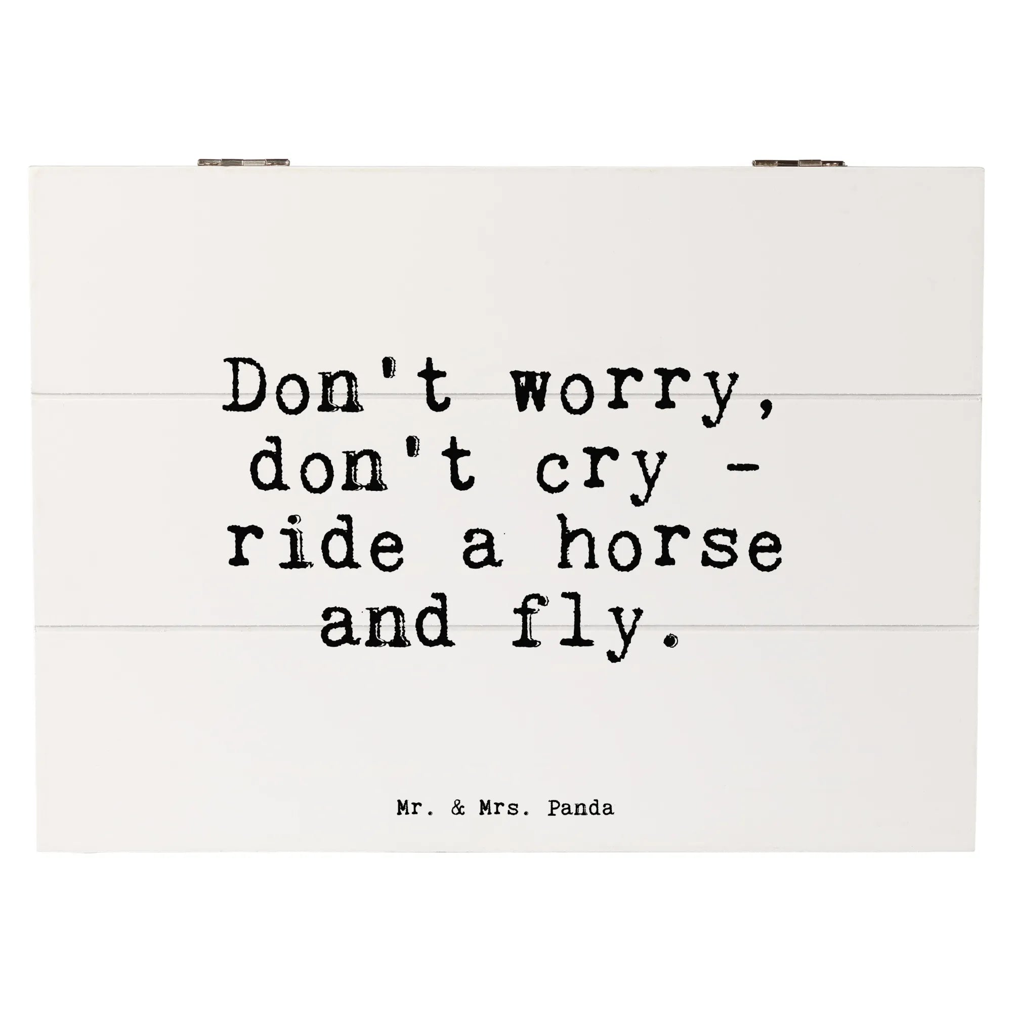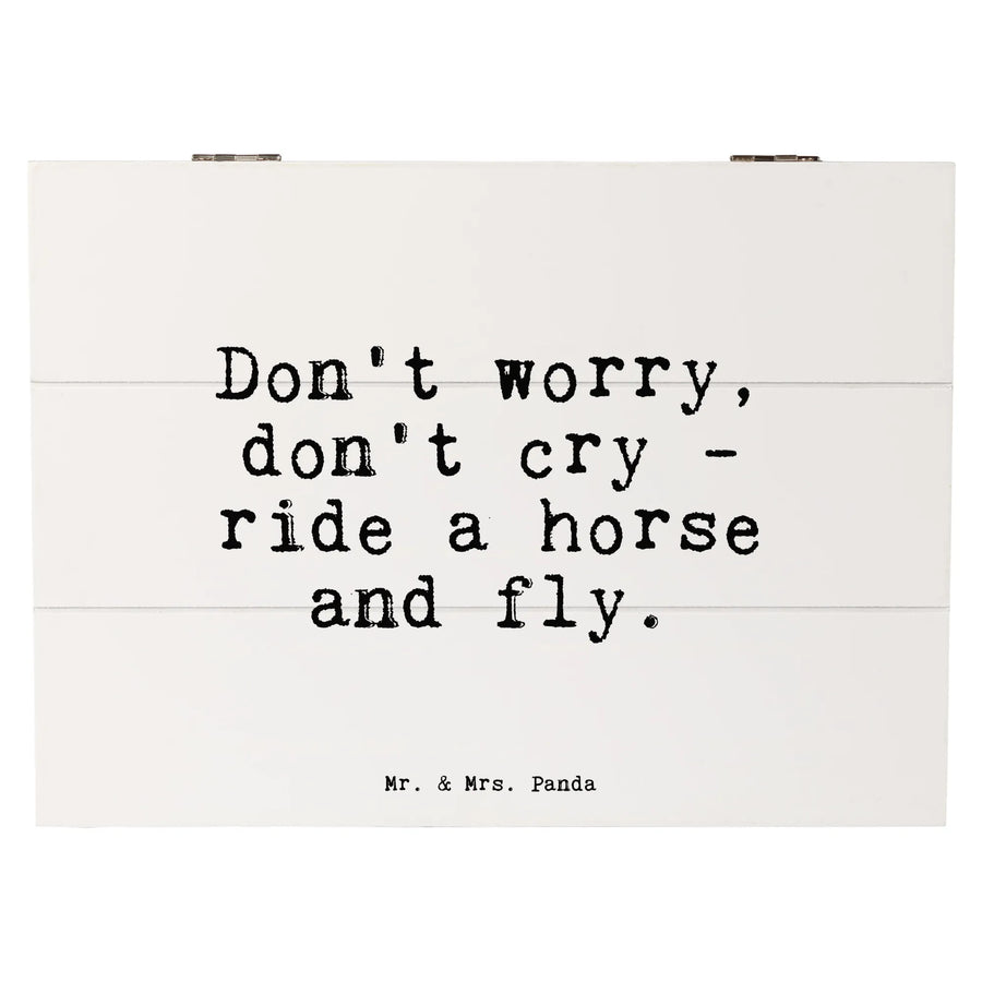 Entdecke die wundervolle Holzkiste mit dem aufmunternden Spruch "Don't worry, don't cry - ride a horse and fly." von Mr. & Mrs. Panda. Diese bezaubernde Erinnerungsbox ist nicht nur ein toller Aufbewahrungsort für all deine Schätze, sondern auch ein einzigartiges Geschenk für Pferdeliebhaber und Reiter.