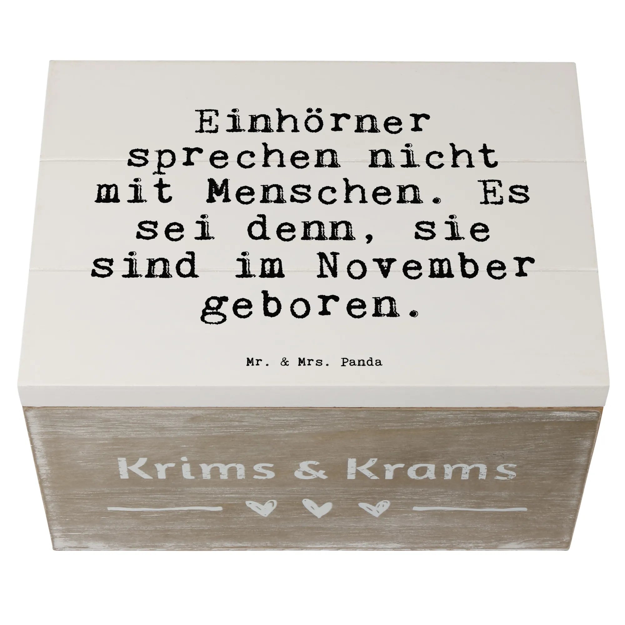 Die wunderschöne Holzkiste von Mr. & Mrs. Panda bietet nicht nur einen stilvollen Platz für all deine Schätze, sondern ist auch ein ganz besonderes Geschenk. Mit dem lustigen Spruch "Einhörner sprechen nicht mit Menschen. Es sei denn, sie sind im November geboren." verleiht diese Kiste jedem Raum einen Hauch von Magie und Freude.