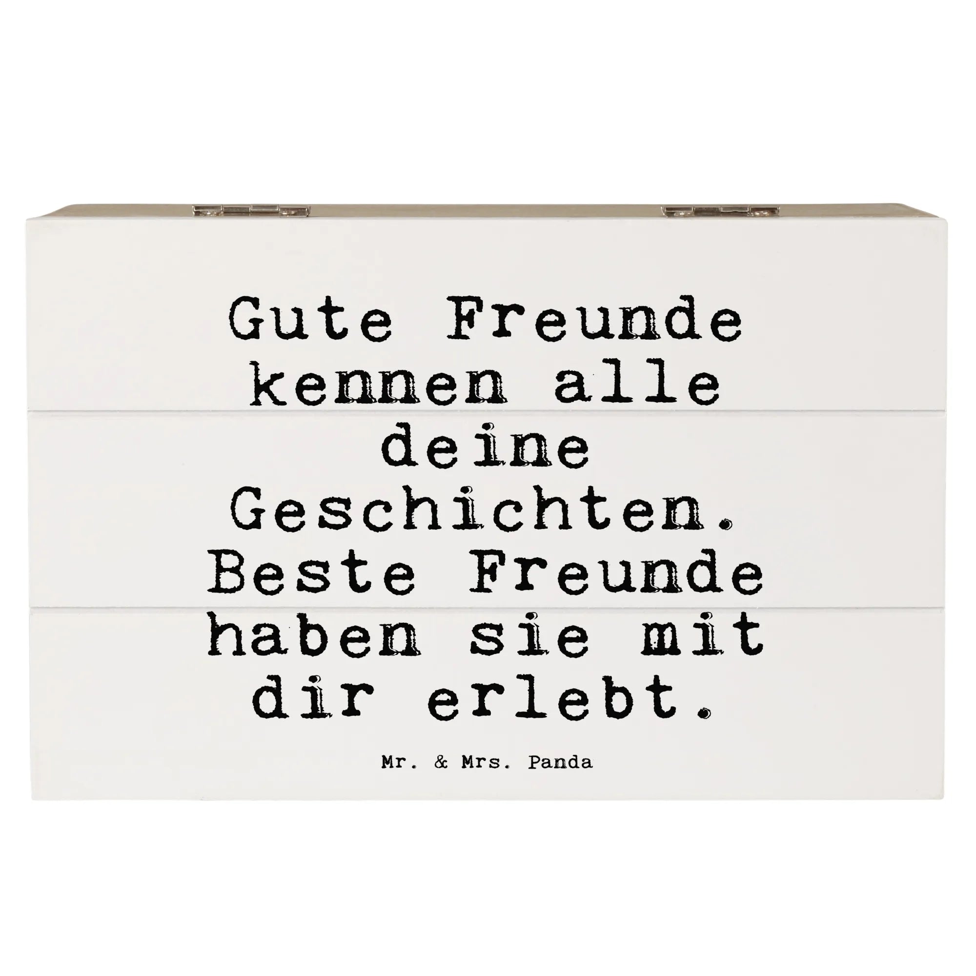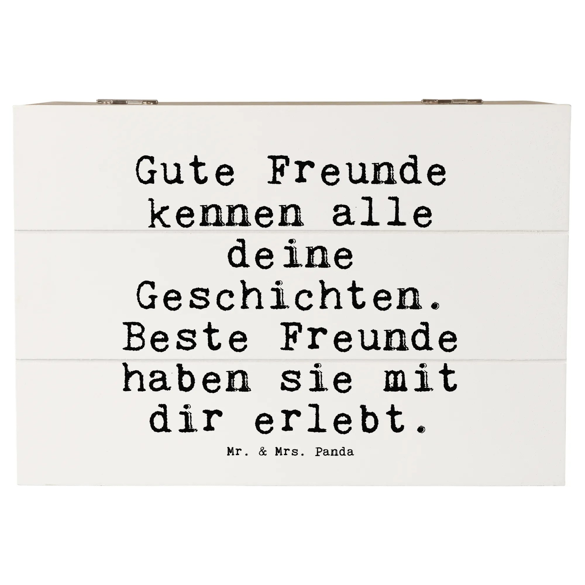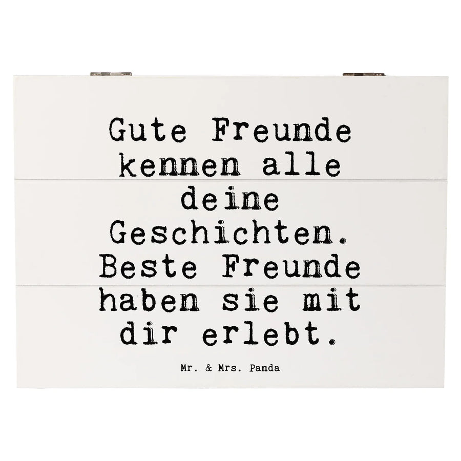 Die perfekte Holzkiste von Mr. & Mrs. Panda, bedruckt mit dem liebevollen Spruch "Gute Freunde kennen alle deine Geschichten. Beste Freunde haben sie mit dir erlebt." ist das ideale Geschenk für jeden Anlass.