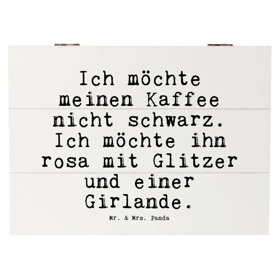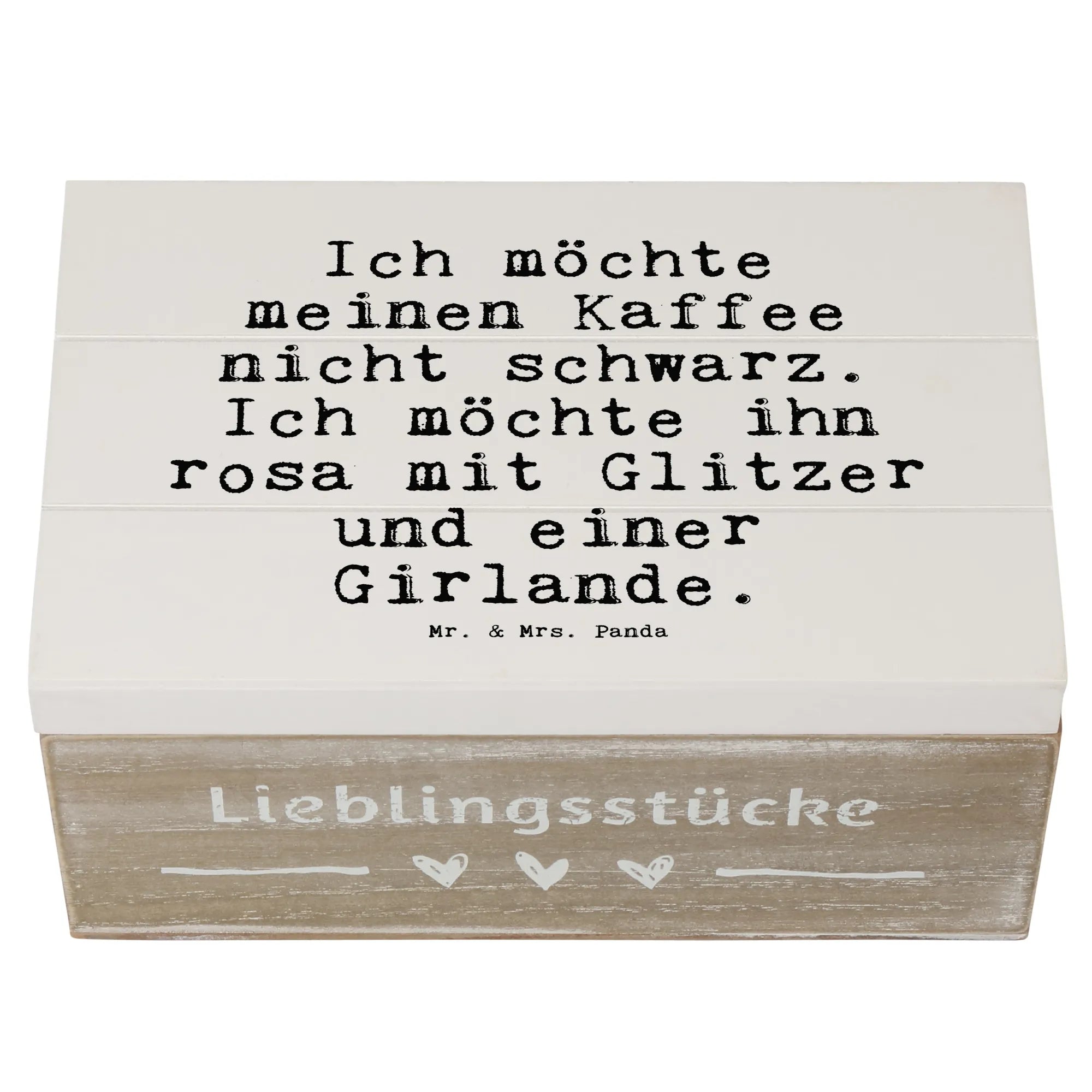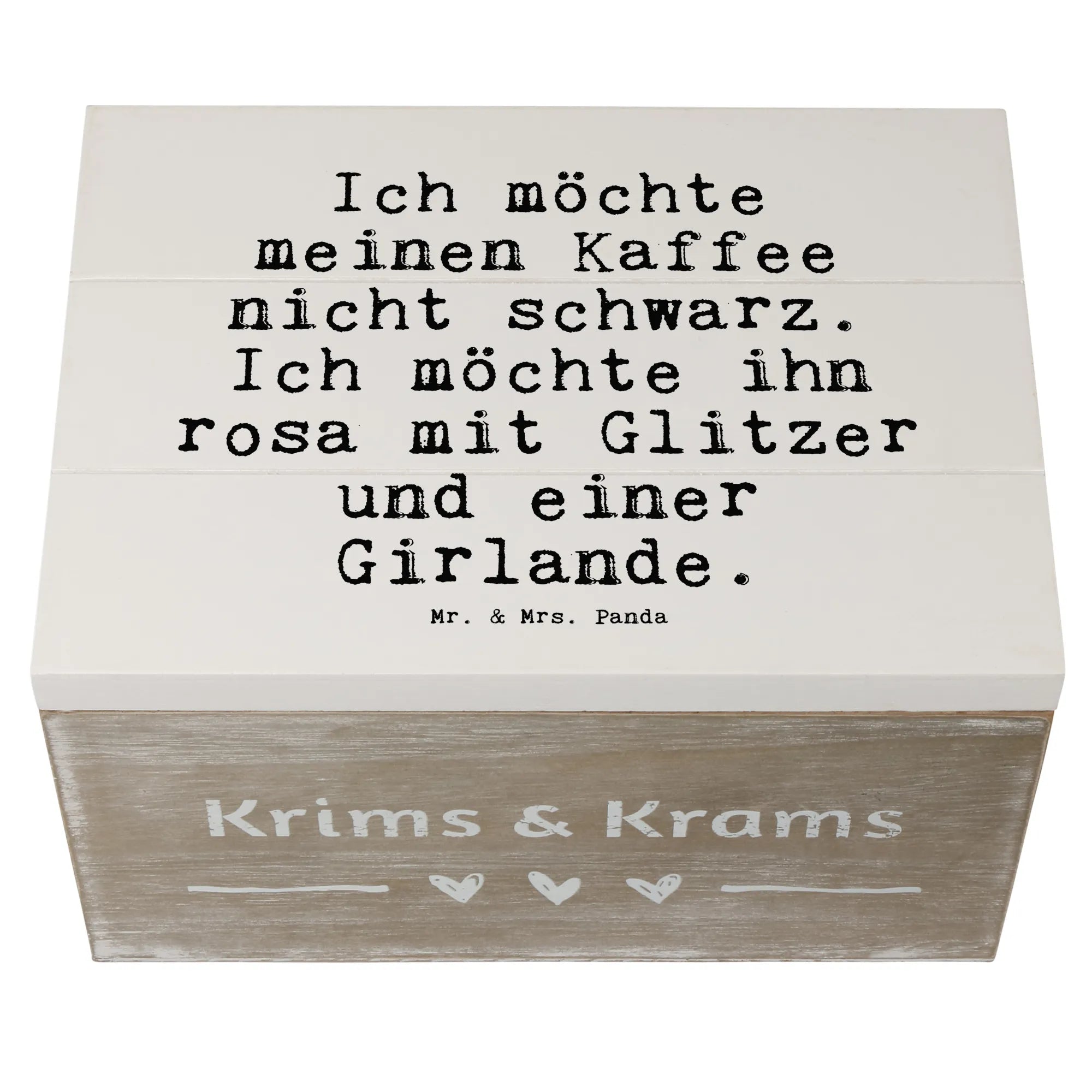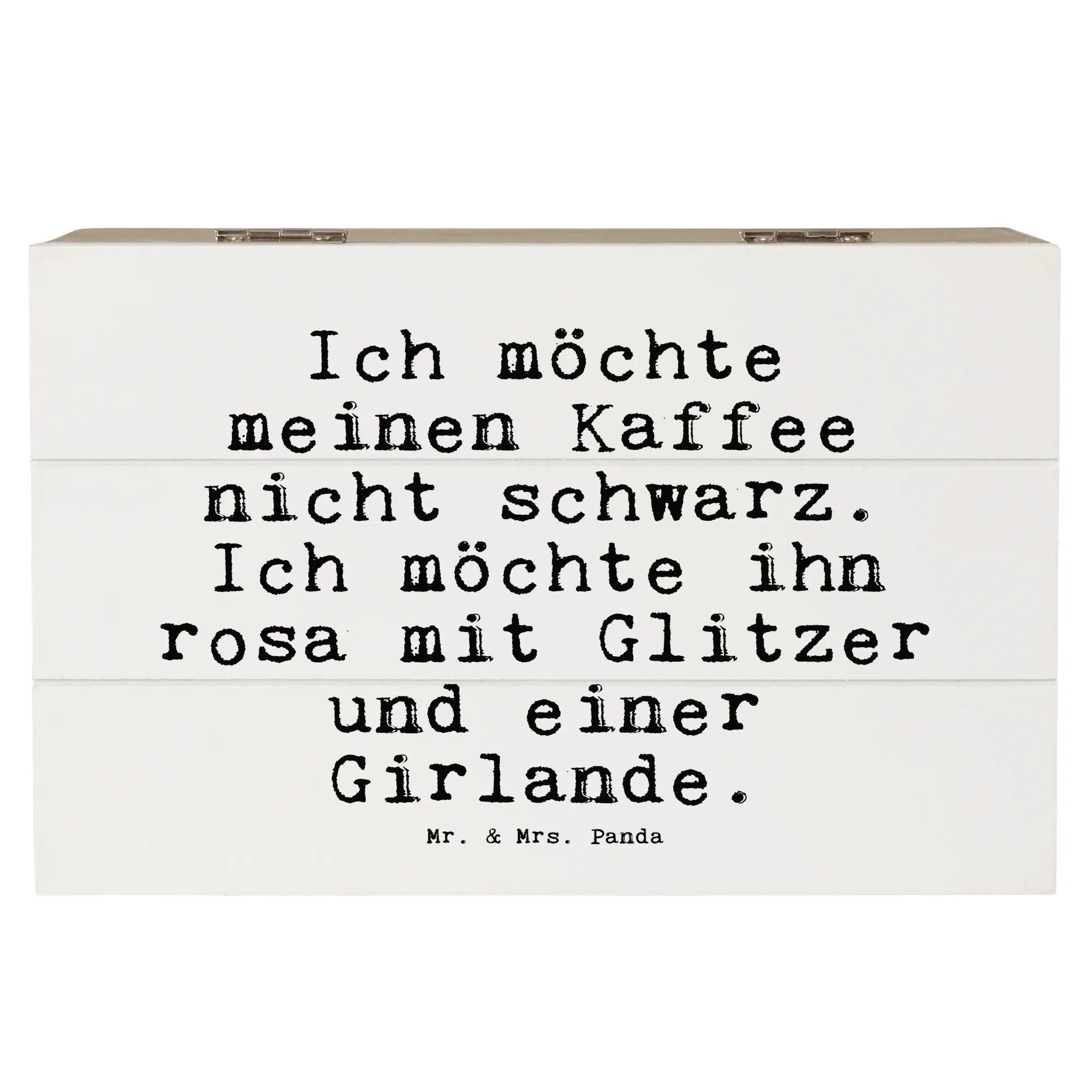 Die wunderschöne Holzkiste von Mr. & Mrs. Panda ist der perfekte Ort, um deine wertvollsten Erinnerungen aufzubewahren! Mit dem charmanten Spruch "Ich möchte meinen Kaffee nicht schwarz. Ich möchte ihn rosa mit Glitzer und einer Girlande." wird diese Kiste zu einem echten Hingucker.