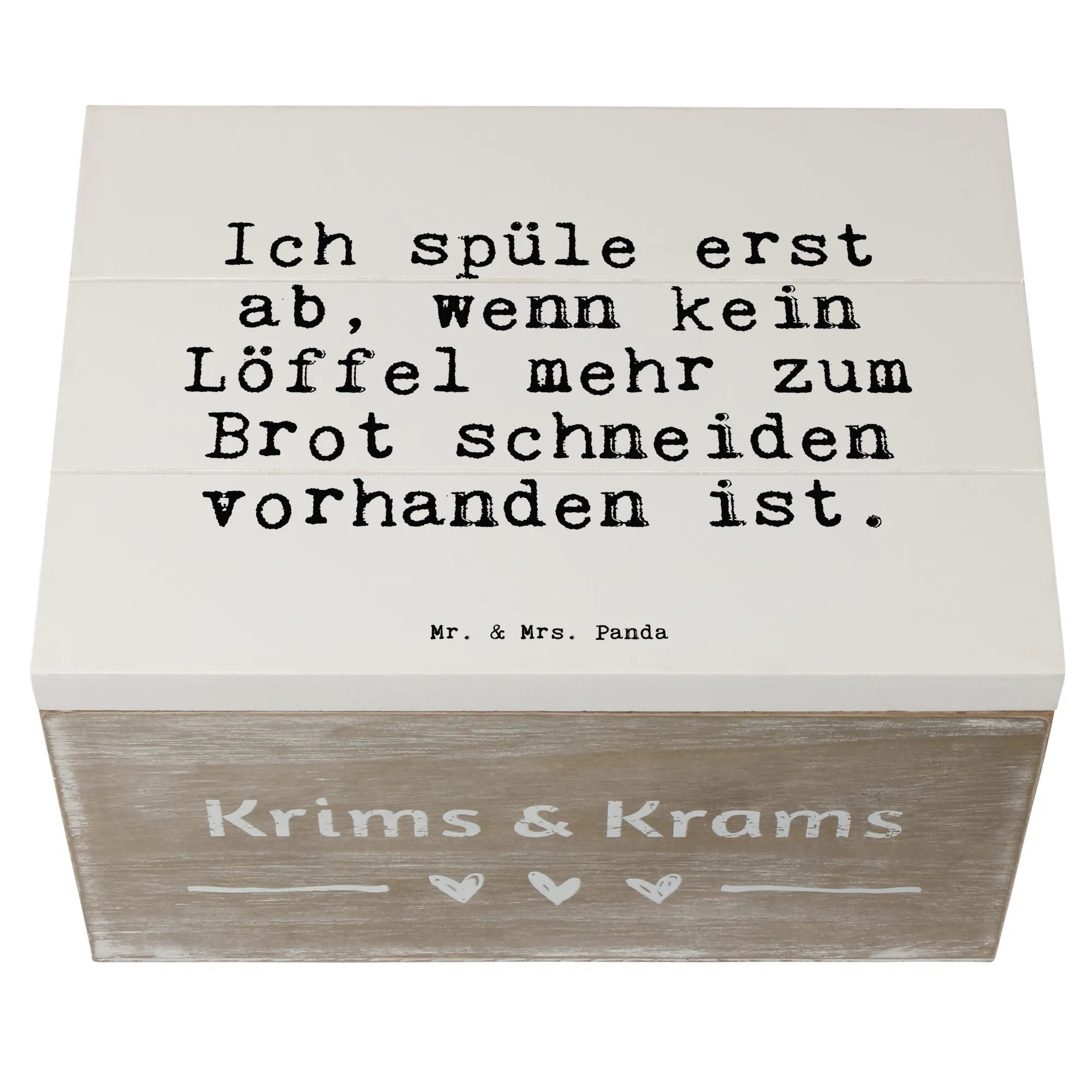 Unsere Holzkiste von Mr. & Mrs. Panda bringt Witz und Ordnung in Deinen Alltag. Bedruckt mit dem Spruch „Ich spüle erst ab, wenn kein Löffel mehr zum Brot schneiden vorhanden ist.“ ist diese Aufbewahrungsbox Holz perfekt für Singlehaushalte, die erste eigene Wohnung oder als Geschenk für Junggeselle, besten Freund oder Partner. Sie eignet sich hervorragend als Schatulle, Erinnerungsbox oder dekorative Box aus Holz.