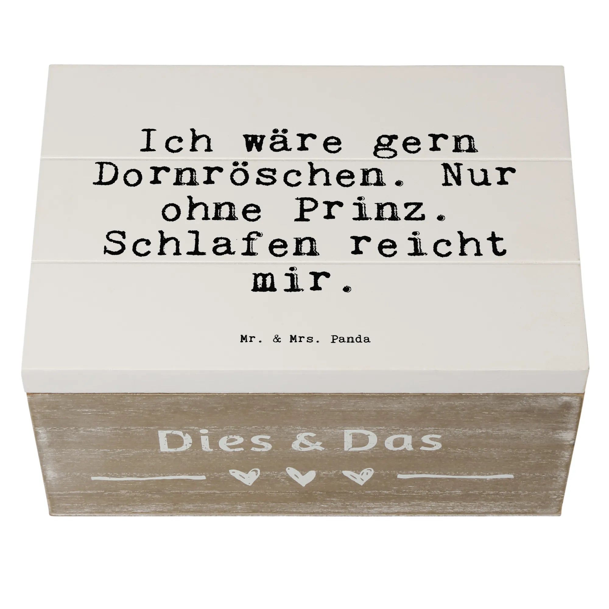 Entdecke die perfekte Möglichkeit, deine schönsten Erinnerungen stilvoll zu bewahren mit der zauberhaften Holzkiste "Ich wäre gern Dornröschen. Nur ohne Prinz. Schlafen reicht mir." von Mr. & Mrs. Panda.