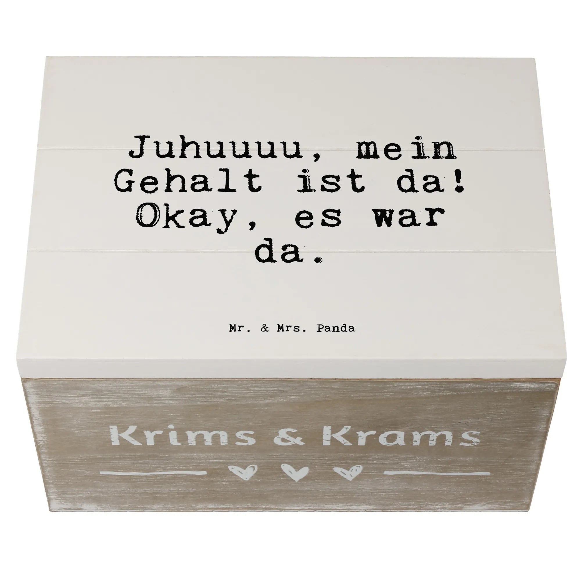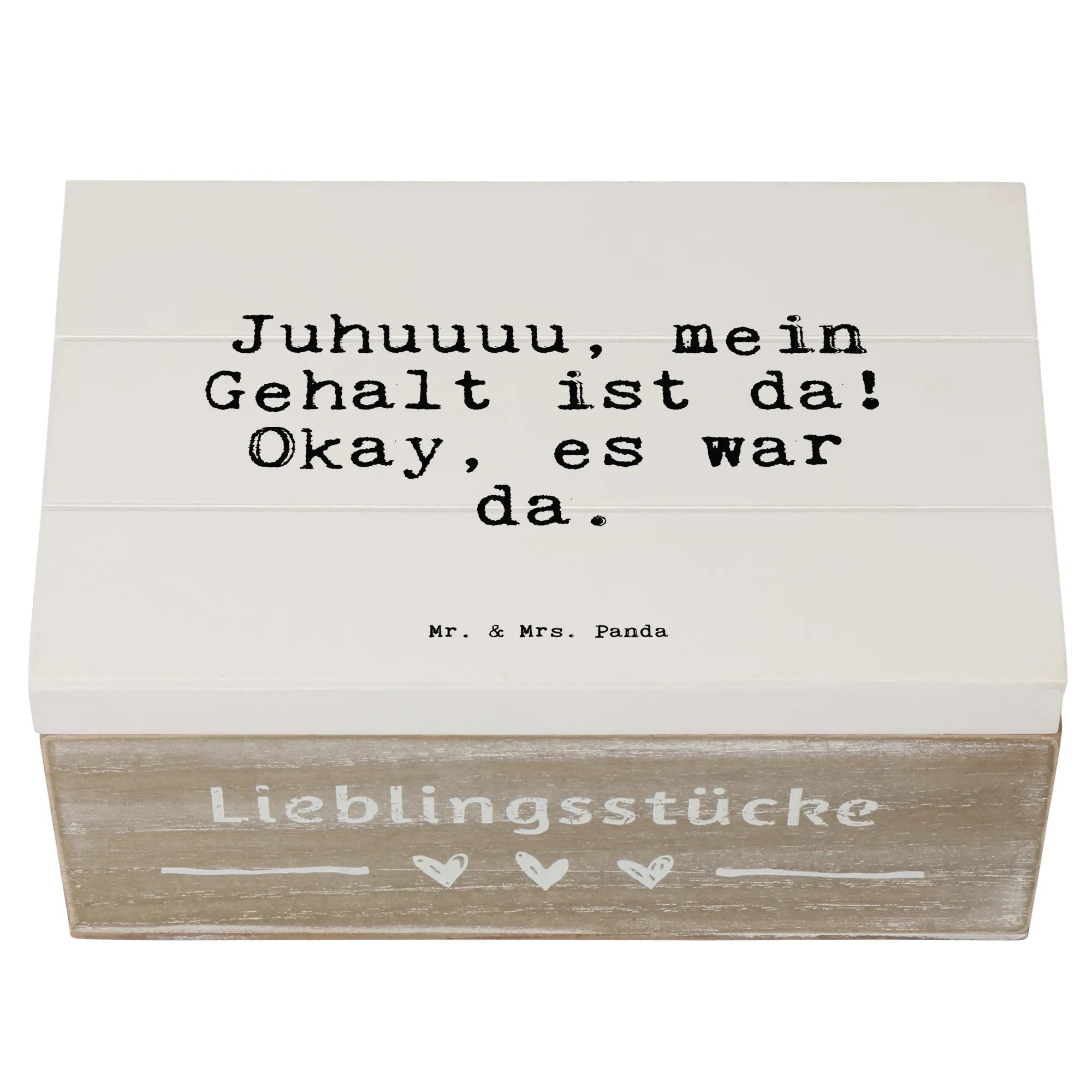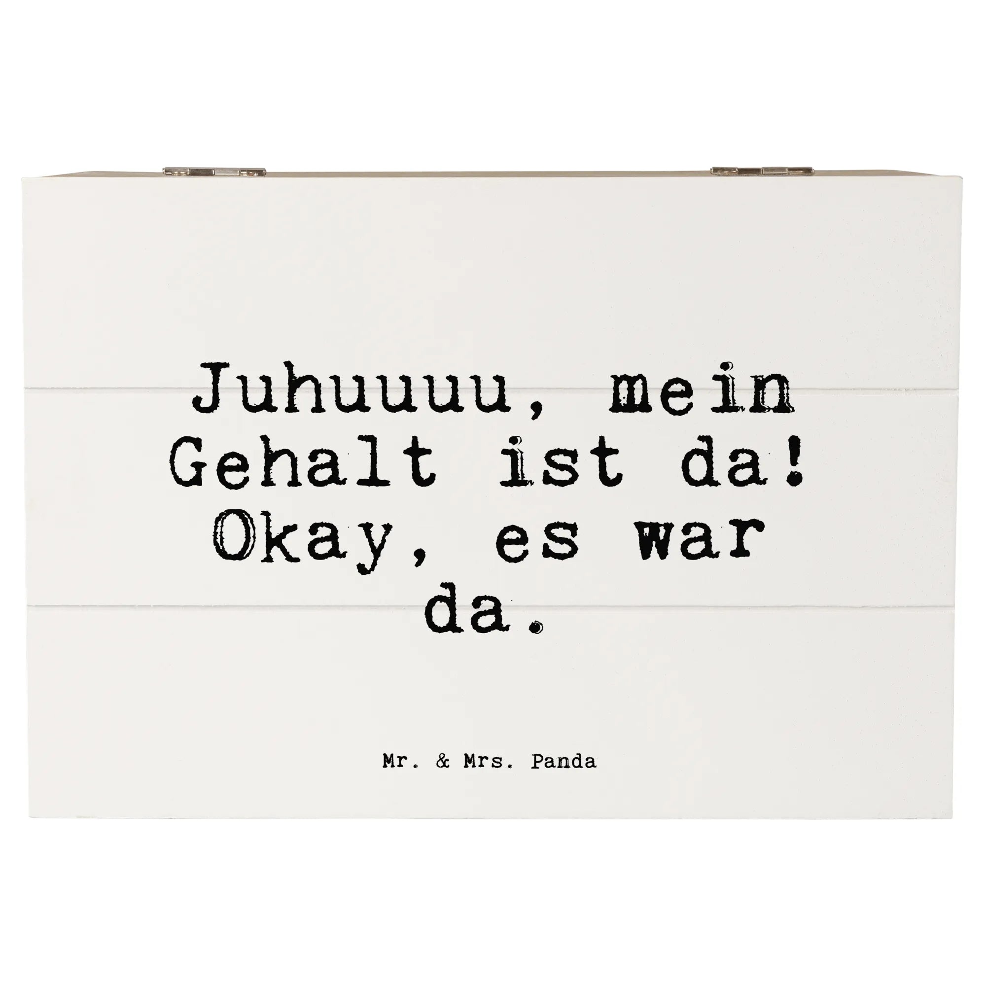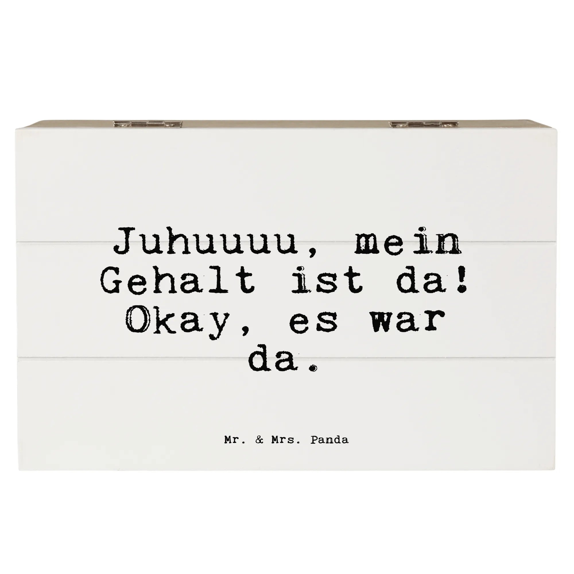 Die Holzkiste "Juhuuuu, mein Gehalt ist da! Okay, es war da." von Mr. & Mrs. Panda ist das perfekte Geschenk für alle, die gerne einen Blick in ihre Erinnerungen werfen oder einfach eine praktische Aufbewahrungsmöglichkeit suchen. Gefertigt aus robuster Premium Hartfaser, ist diese Kiste nicht nur stabil, sondern auch ein echter Hingucker mit ihrem charmanten Spruch. Mit den Maßen von 19 x 12 cm bietet sie ausreichend Platz für deine persönlichen Schätze.
