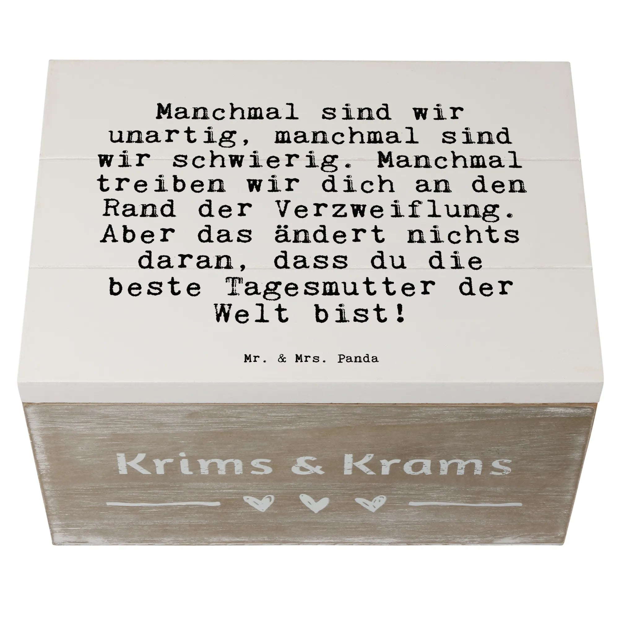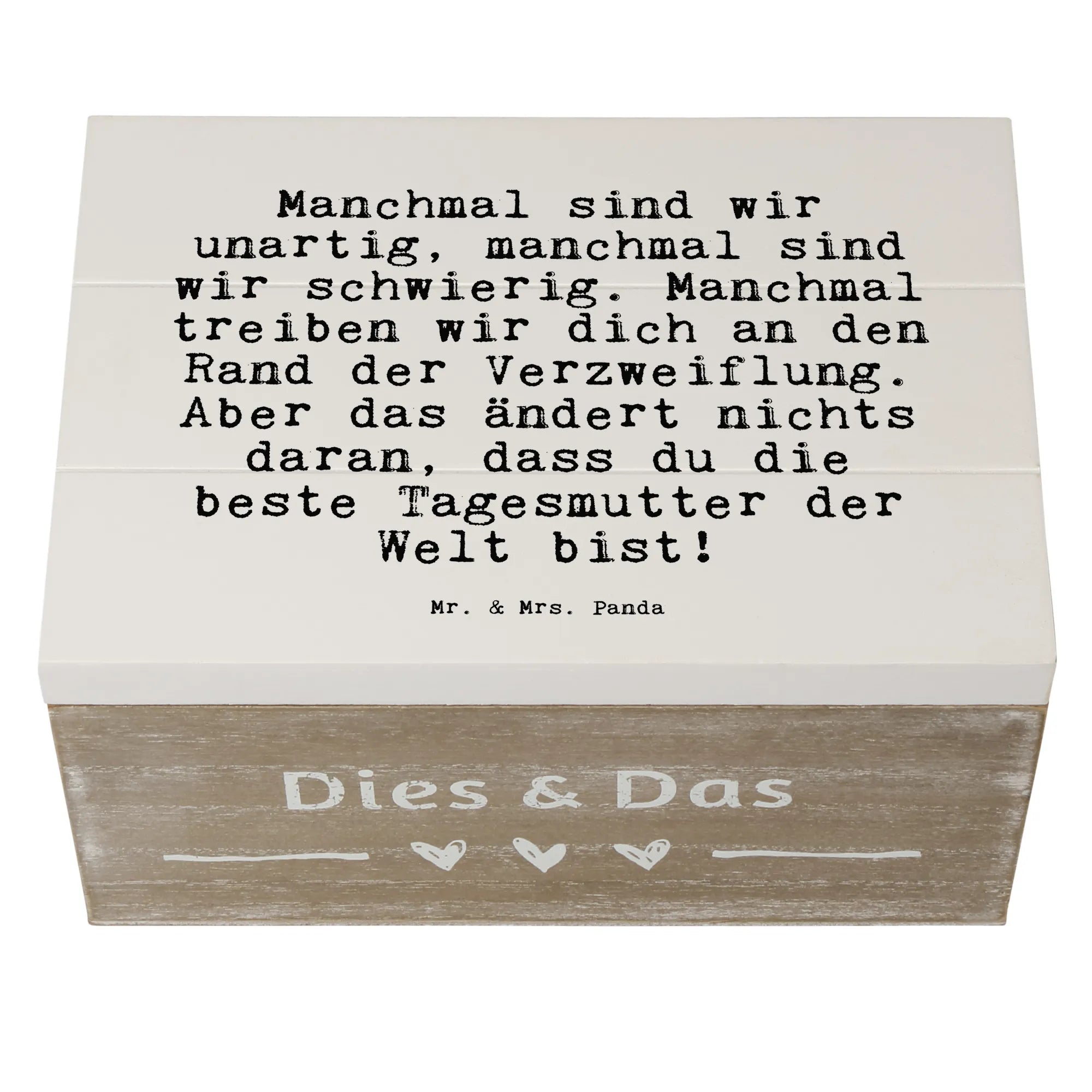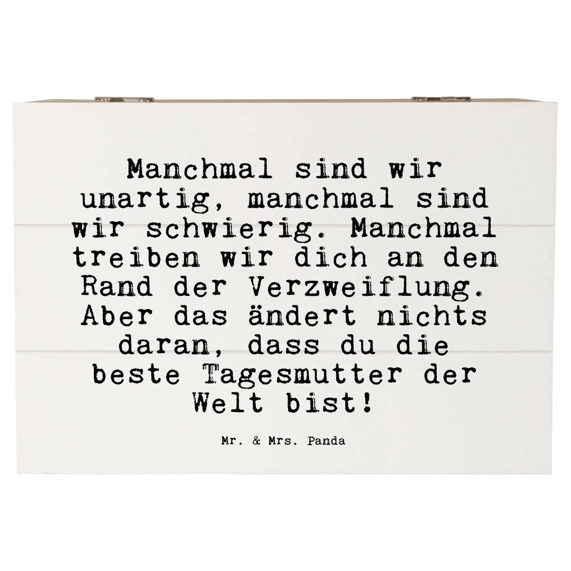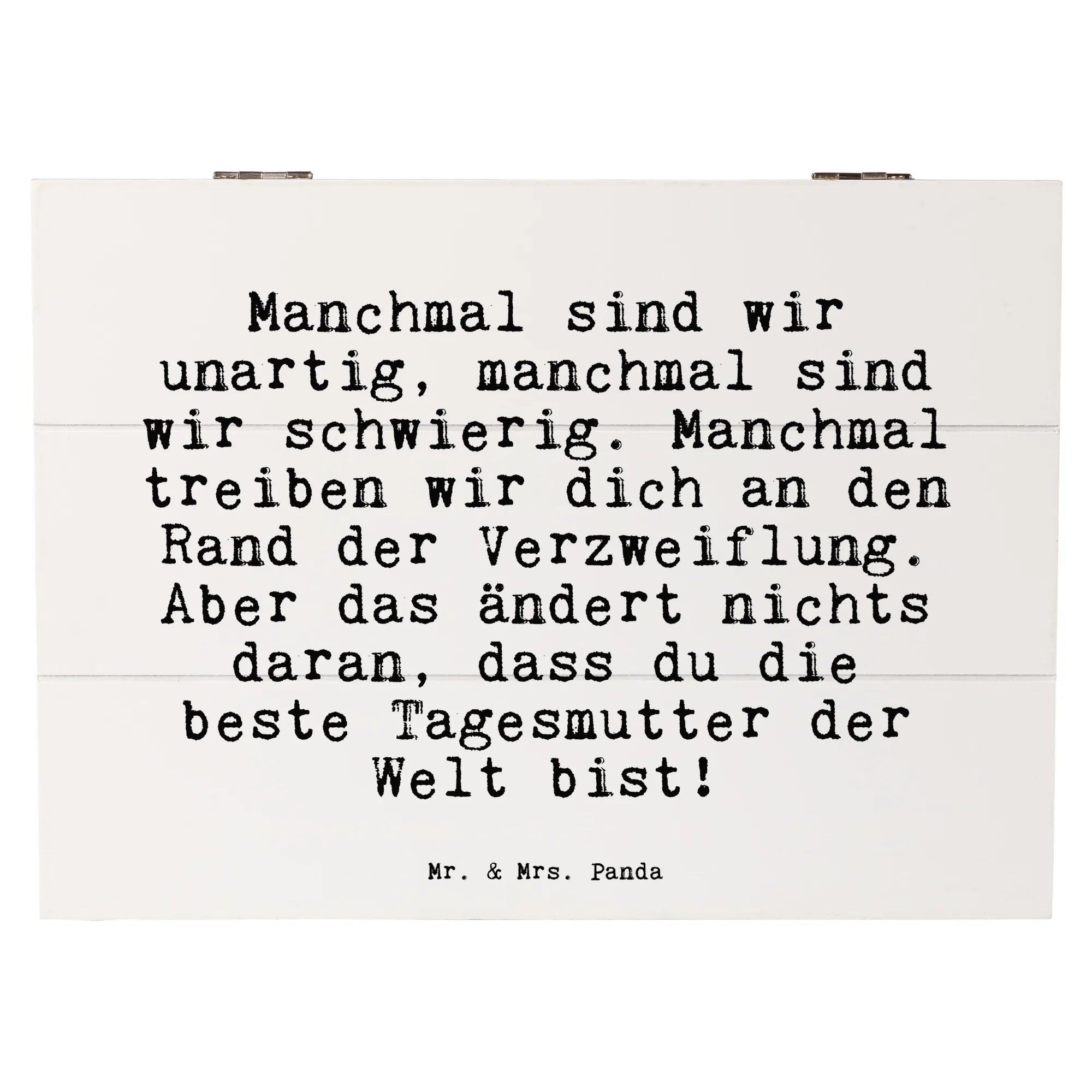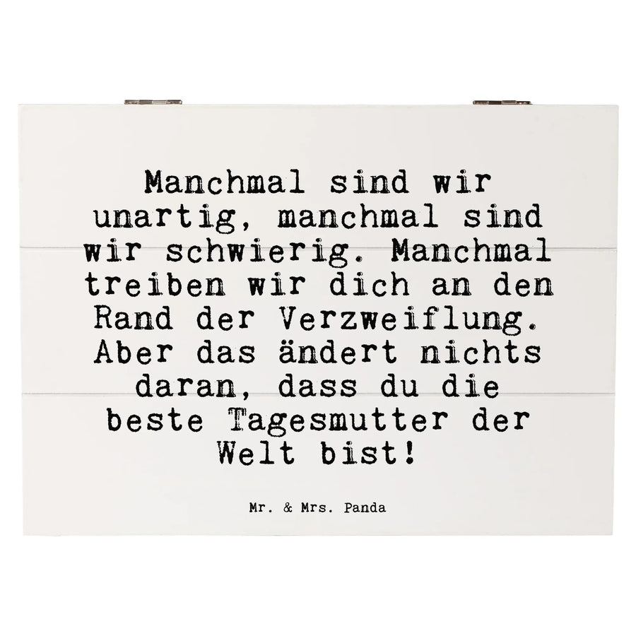 Die wunderschöne Holzkiste von Mr. & Mrs. Panda mit dem liebevollen Spruch "Manchmal sind wir unartig, manchmal sind wir schwierig. Manchmal treiben wir dich an den Rand der Verzweiflung. Aber das ändert nichts daran, dass du die beste Tagesmutter der Welt bist!" ist das perfekte Geschenk für deine Tagesmutter oder für jemanden, der gerne Erinnerungen bewahrt.