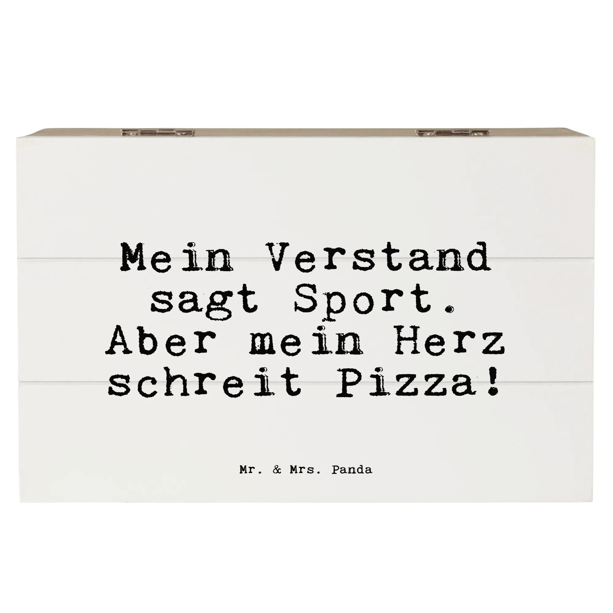 Die wunderschöne Holzkiste von Mr. & Mrs. Panda mit dem lustigen Spruch "Mein Verstand sagt Sport. Aber mein Herz schreit Pizza!" ist das perfekte Geschenk für alle, die das Leben genießen und dabei auch mal einen Teil ihrer Fitnessziele vergessen möchten.