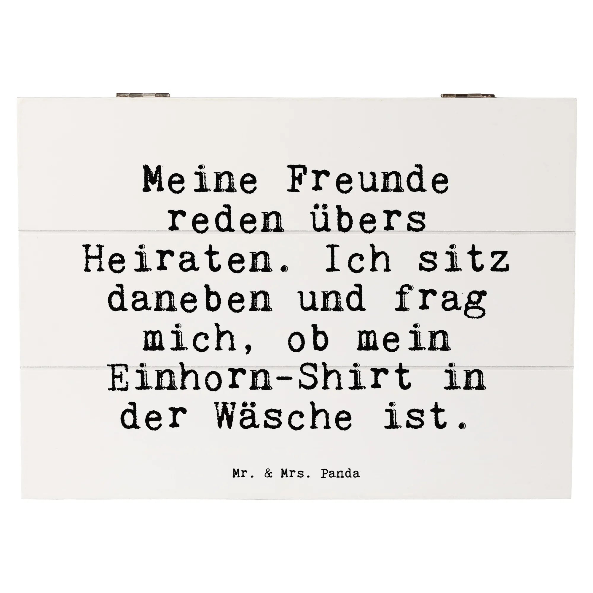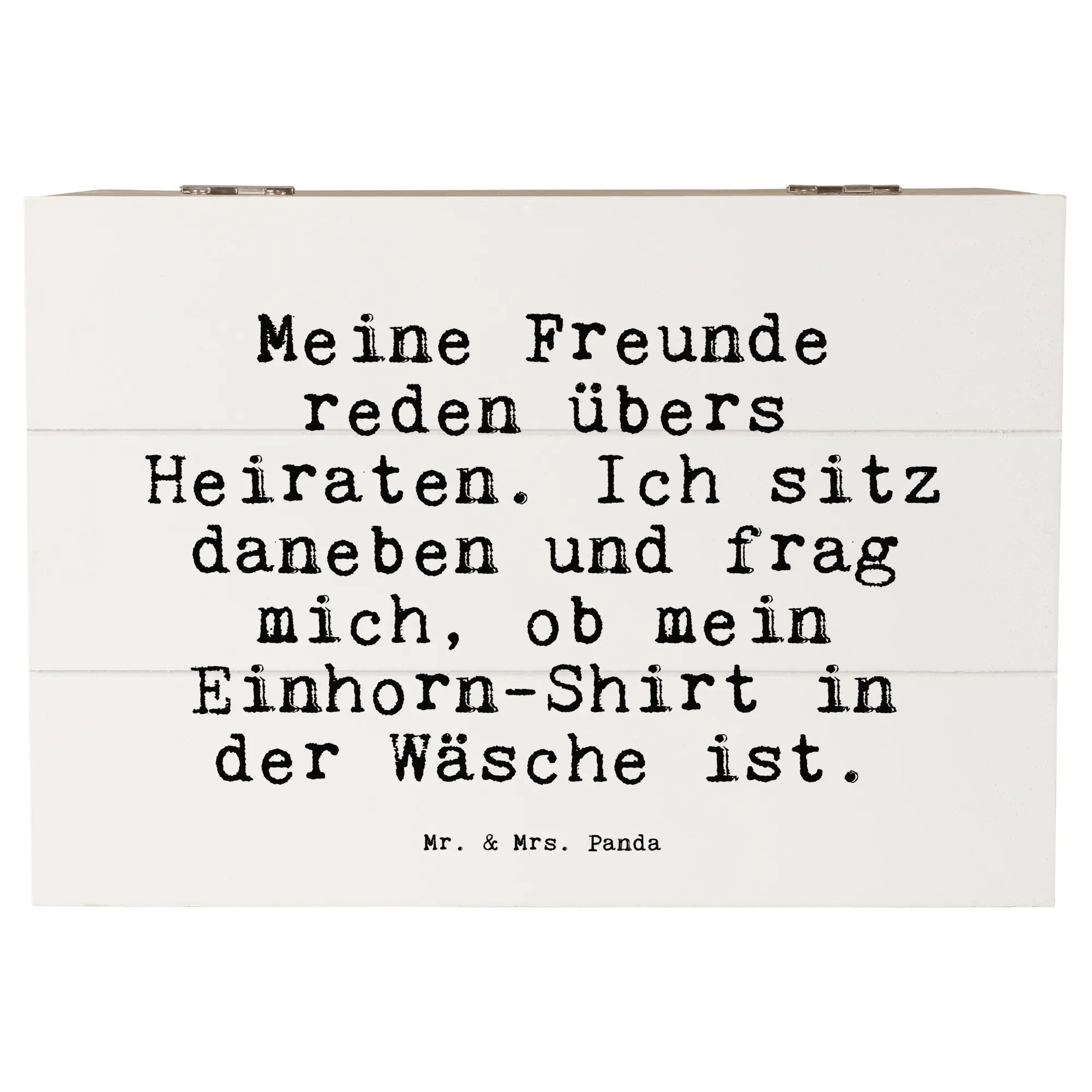 Du suchst das perfekte Geschenk für einen besonderen Anlass? Dann ist die wunderschöne Holzkiste von Mr. & Mrs. Panda genau das Richtige für dich! Mit dem spritzigen Spruch "Meine Freunde reden übers Heiraten. Ich sitz daneben und frag mich, ob mein Einhorn-Shirt in der Wäsche ist." wird diese Kiste ein echter Hingucker und sorgt für viele Lacher. Egal, ob für eine Hochzeit, einen Junggesellenabschied oder einfach nur als witziges Geschenk für Freunde, diese Aufbewahrungsbox ist ein wunderbarer Ort für all die kleinen Schätze und Erinnerungen, die du im Laufe der Jahre gesammelt hast.