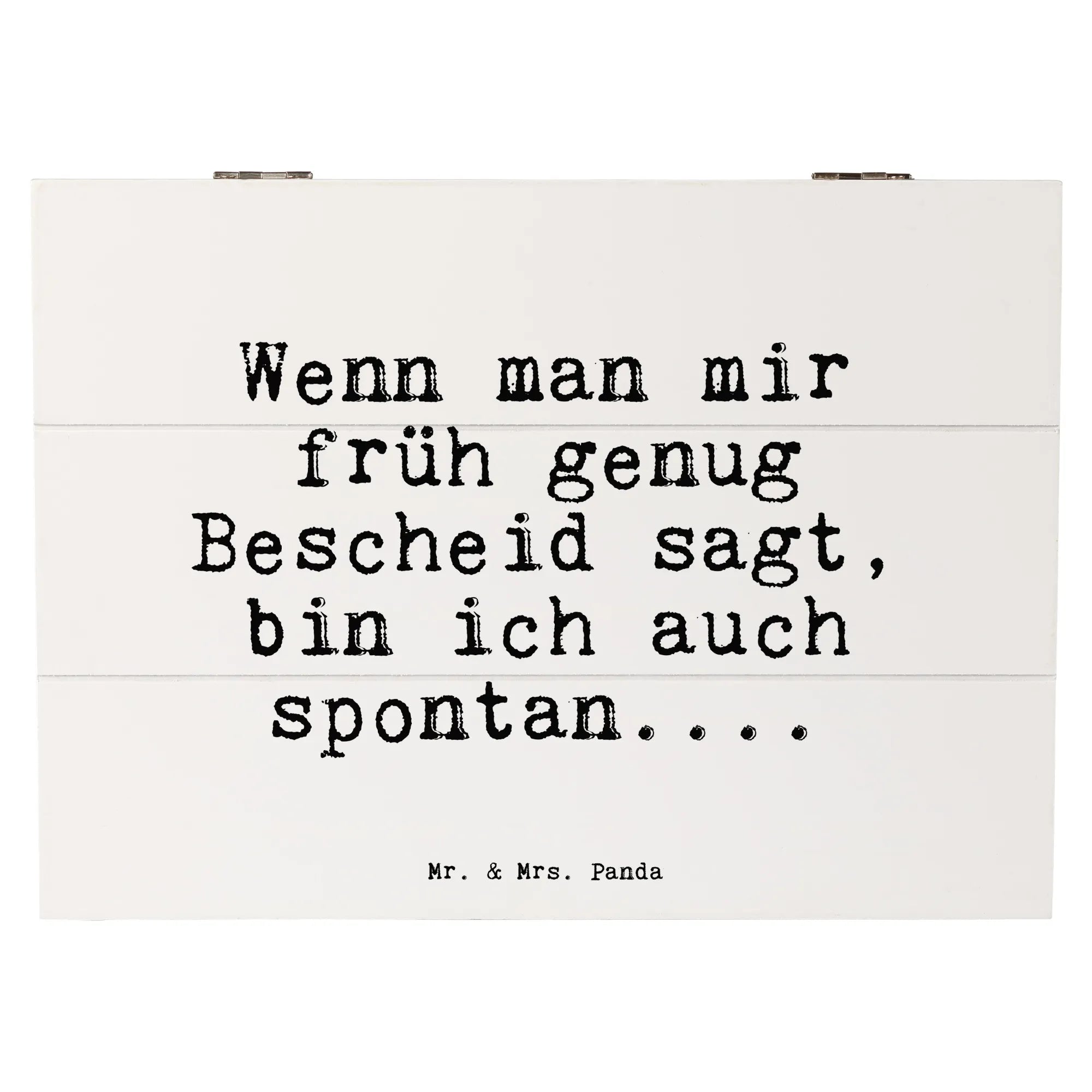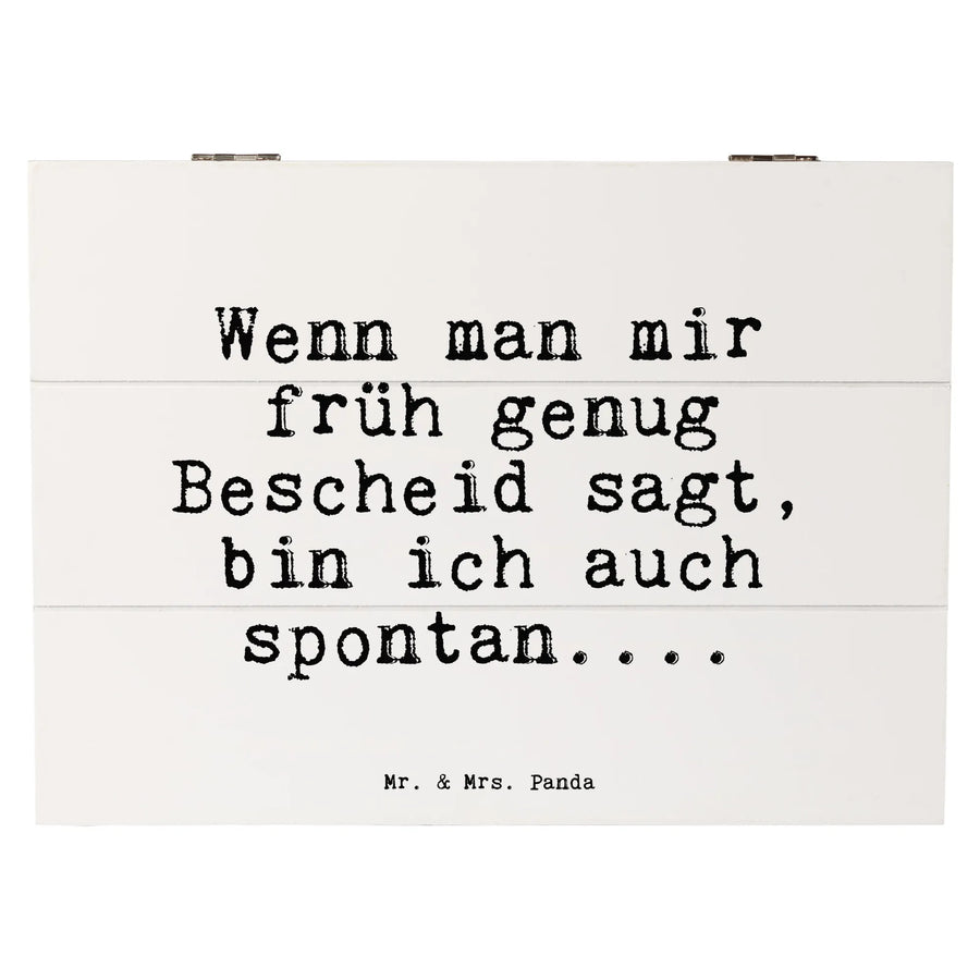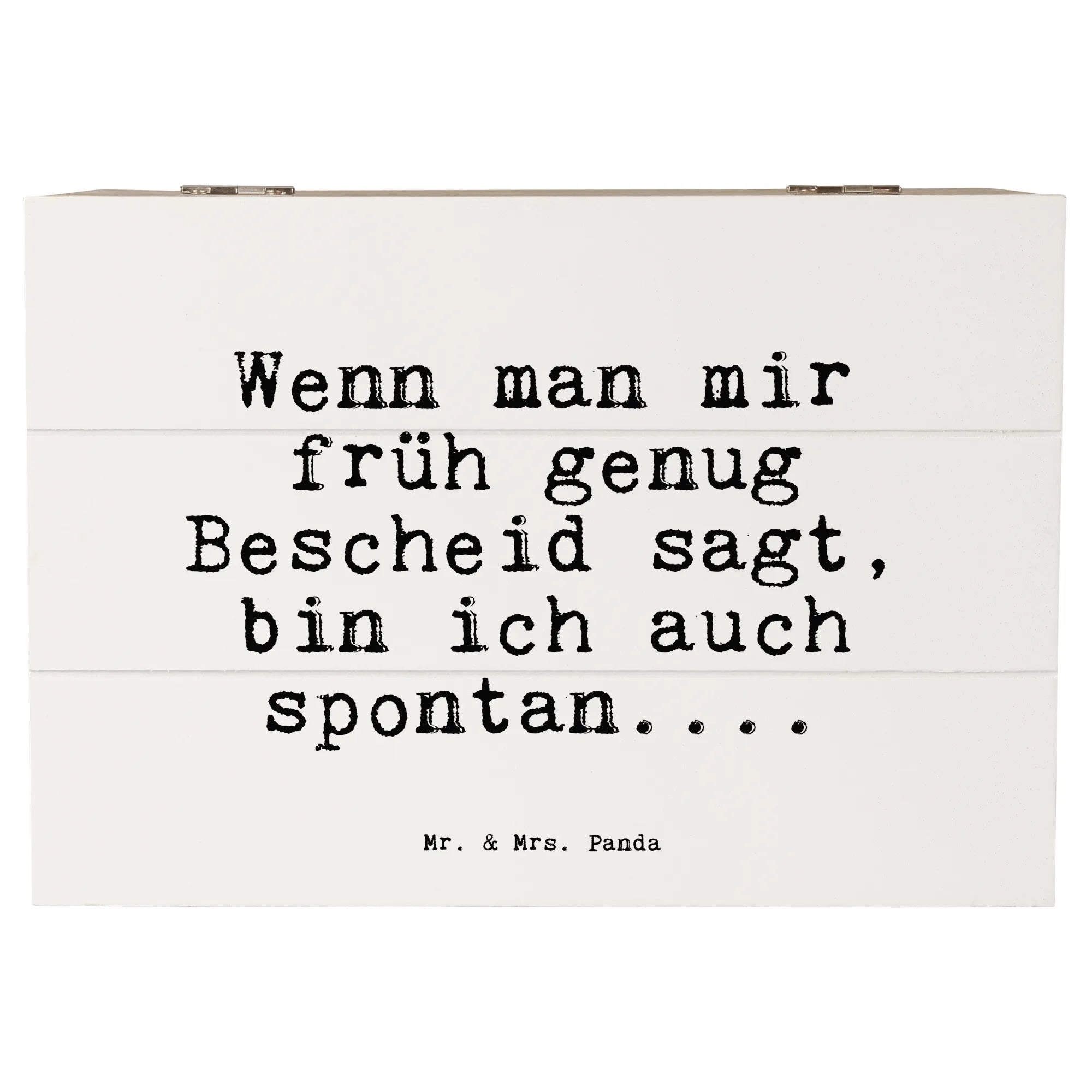 Die Holzkiste "Wenn man mir früh genug Bescheid sagt, bin ich auch spontan...." von Mr. & Mrs. Panda ist das perfekte Geschenk für alle, die spontane Abenteuer und unvergessliche Momente lieben. Diese wunderschöne Holzkiste ist nicht nur ein echter Hingucker, sondern auch ein praktischer Aufbewahrungsort für all deine Schätze.