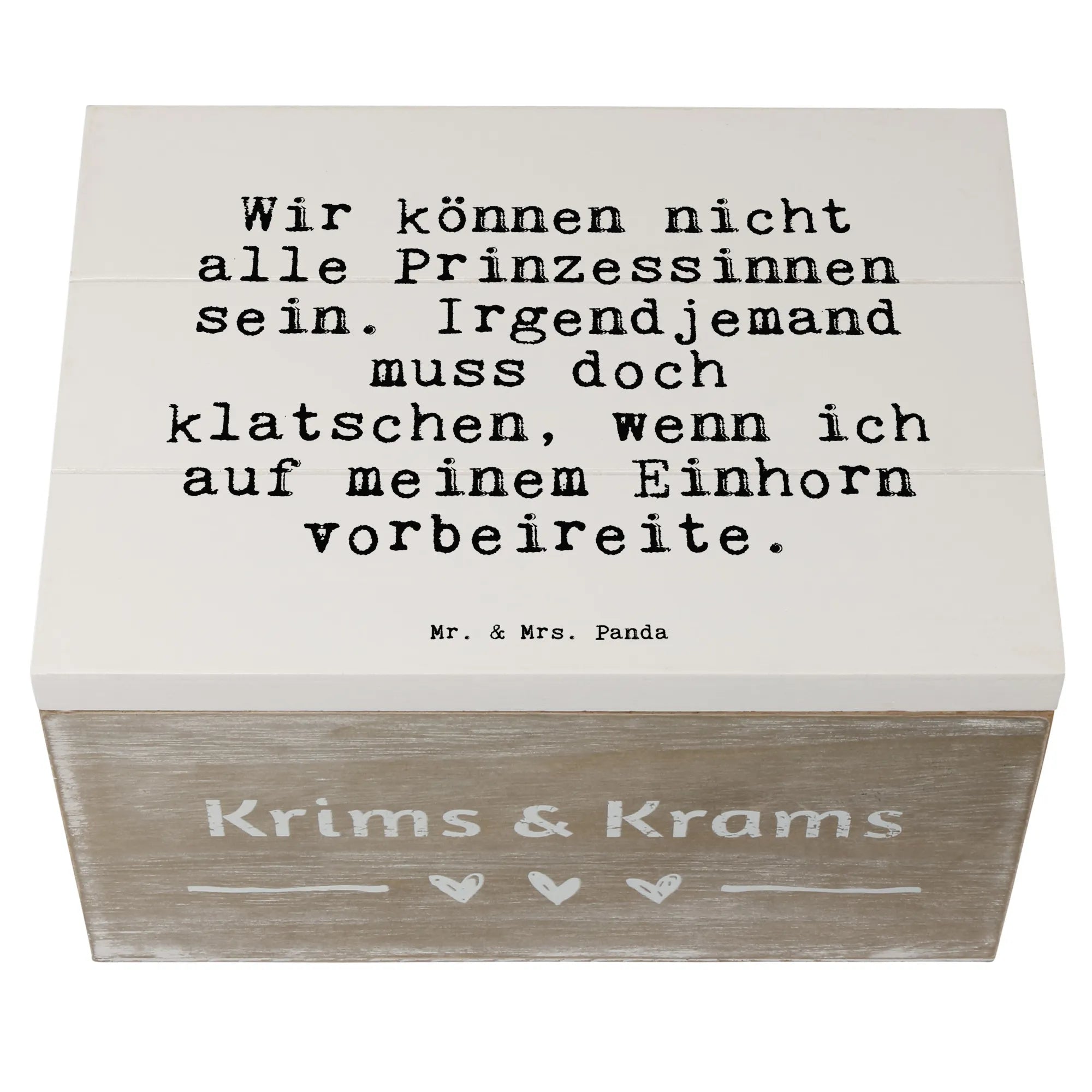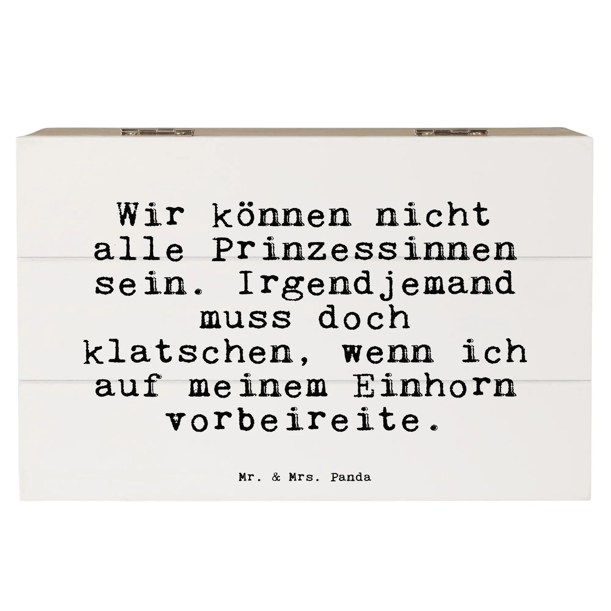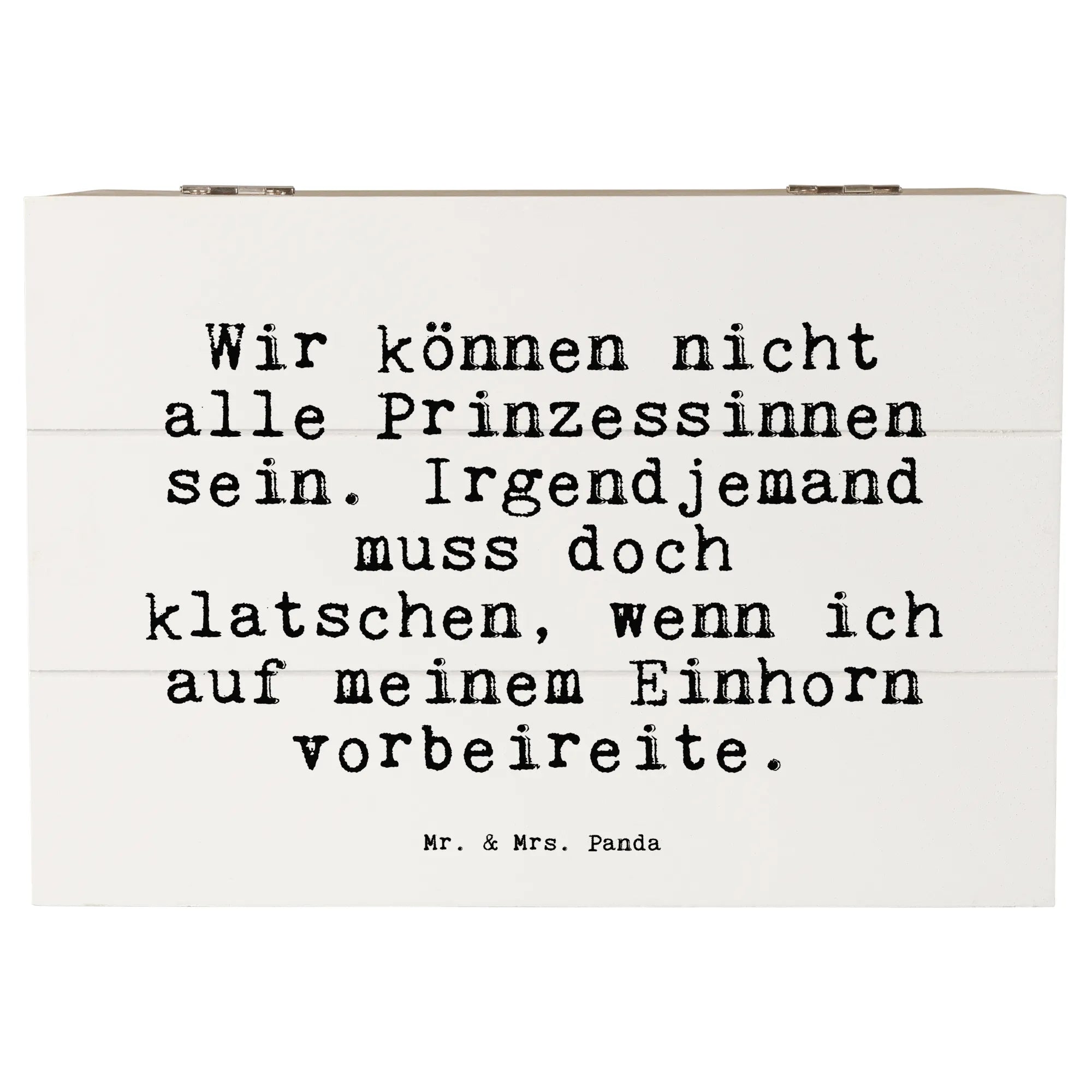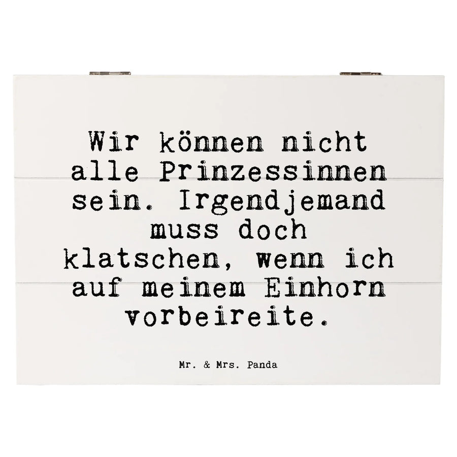 Entdecke die zauberhafte Holzkiste von Mr. & Mrs. Panda mit dem witzigen Spruch: "Wir können nicht alle Prinzessinnen sein. Irgendjemand muss doch klatschen, wenn ich auf meinem Einhorn vorbeireite." Diese wunderschöne und robuste Holzkiste ist der perfekte Aufbewahrungsort für all deine wertvollen Schätze, Erinnerungen und Gadgets!