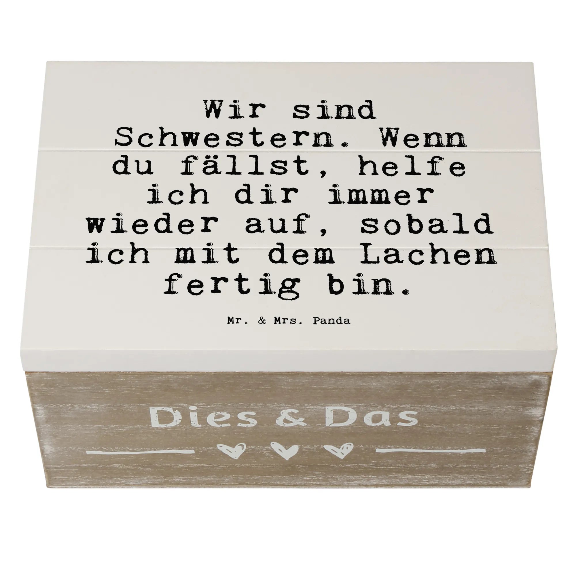 Die wunderschöne Holzkiste von Mr. & Mrs. Panda mit dem zauberhaften Spruch "Wir sind Schwestern. Wenn du fällst, helfe ich dir immer wieder auf, sobald ich mit dem Lachen fertig bin." ist das perfekte Geschenk für all jene, die eine besondere Verbindung zu ihrer Schwester pflegen. Egal, ob zum Geburtstag, zum Glückwunsch, oder einfach als liebevolle Geste – diese Kiste wird das Herz Deiner Schwester höher schlagen lassen!