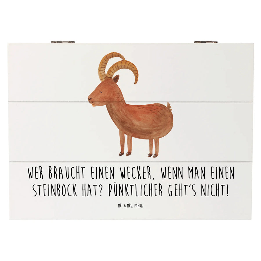 Die wunderschöne Holzkiste von Mr. & Mrs. Panda ist das perfekte Geschenk für alle Steinbock-Geborenen, die Pünktlichkeit und Organisation schätzen. Mit dem liebevoll gestalteten Motiv und dem Spruch "Wer braucht einen Wecker, wenn man einen Steinbock hat? Pünktlicher geht's nicht!" wird diese Erinnerungskiste zu einem echten Blickfang in jedem Zuhause.