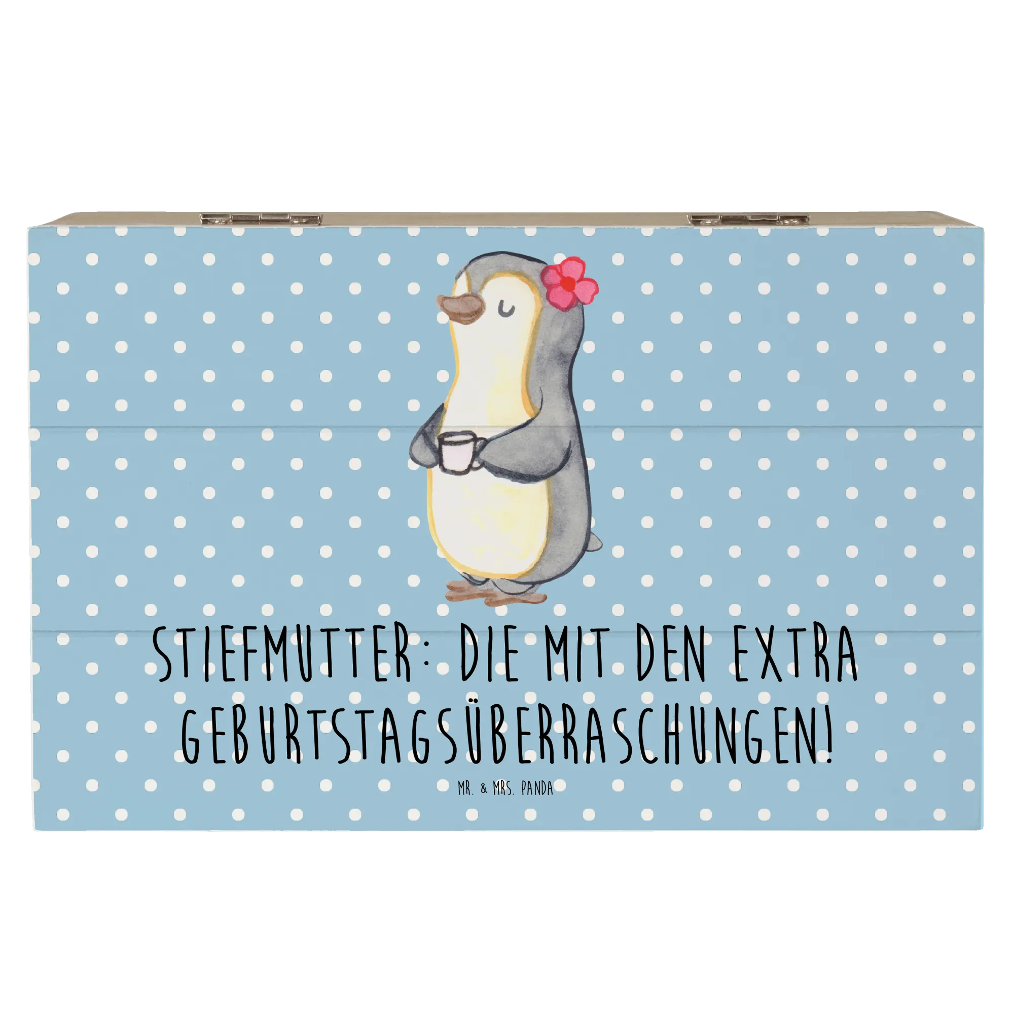 Die wunderschöne Holzkiste für Stiefmütter von Mr. & Mrs. Panda ist nicht nur ein praktisches Aufbewahrungsbehältnis, sondern auch eine herzerwärmende Erinnerung an besondere Momente in der Familie. Mit dem liebevollen Motiv "Stiefmutter: Die mit den extra Geburtstagsüberraschungen!" wirst Du sicher das Herz Deiner Stiefmutter erobern.