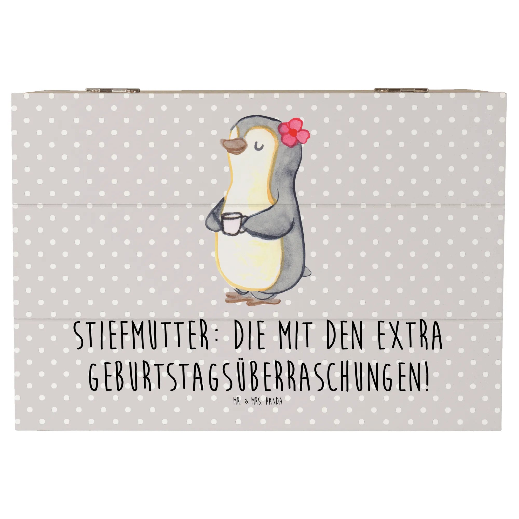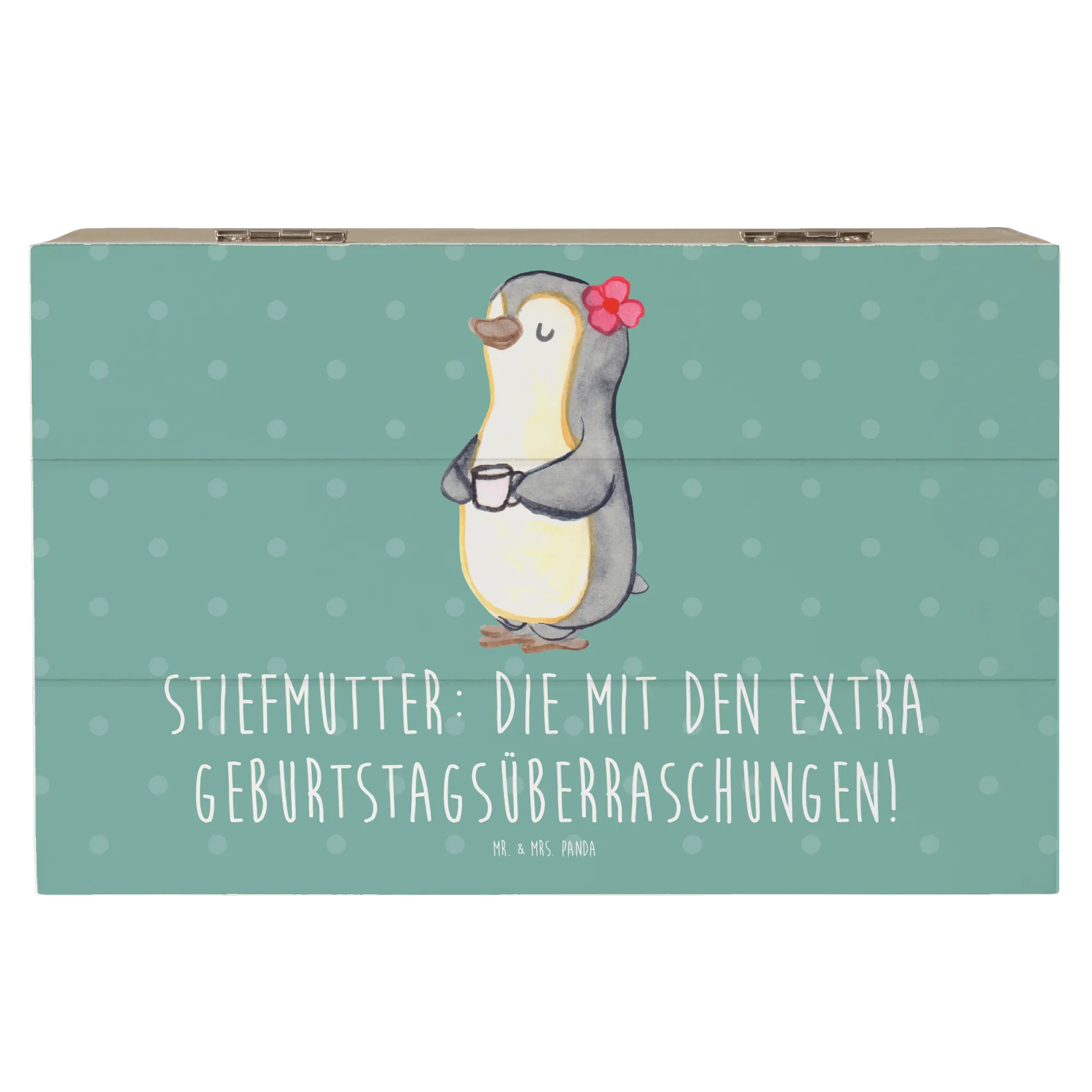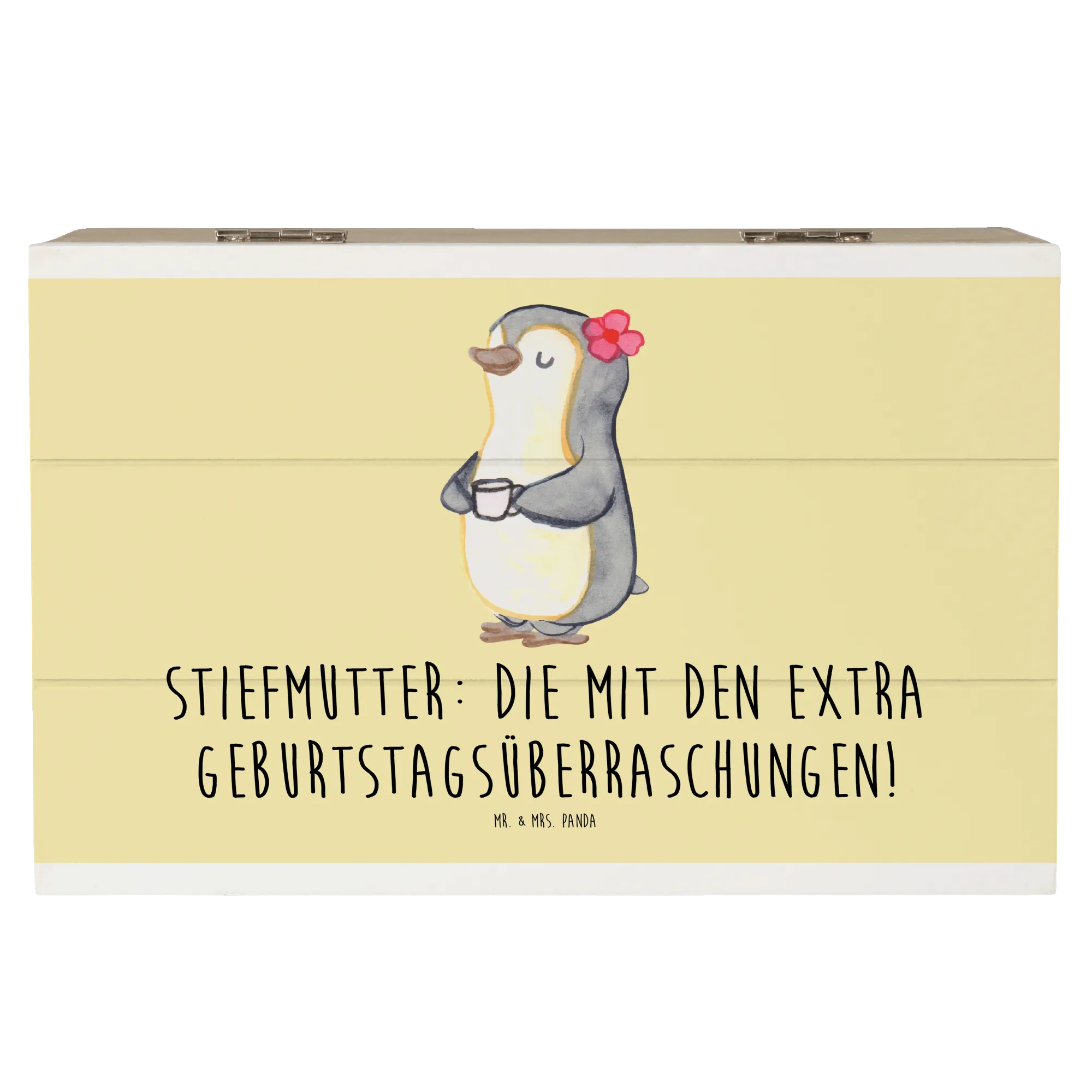 Die wunderschöne Holzkiste von Mr. & Mrs. Panda ist nicht nur ein praktisches Aufbewahrungselement, sondern auch eine zauberhafte Erinnerungskiste. Mit dem liebevollen Motiv "Stiefmutter: Die mit den extra Geburtstagsüberraschungen!" ist sie das perfekte Geschenk für alle Stiefmütter in Patchwork-Familien.