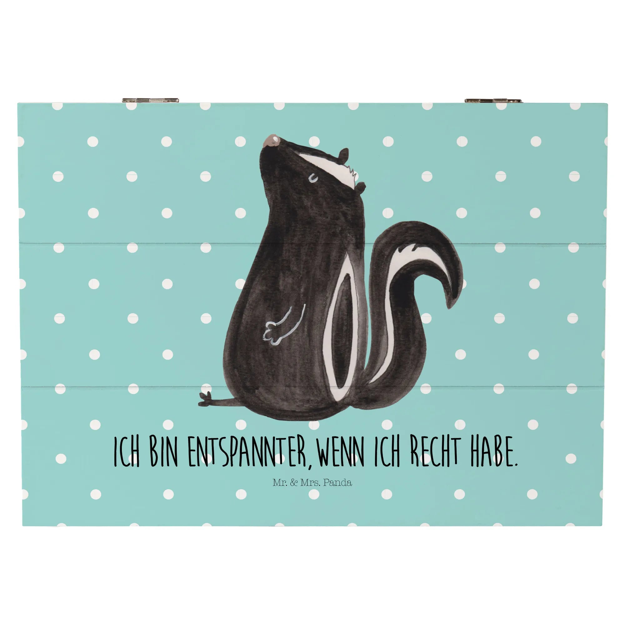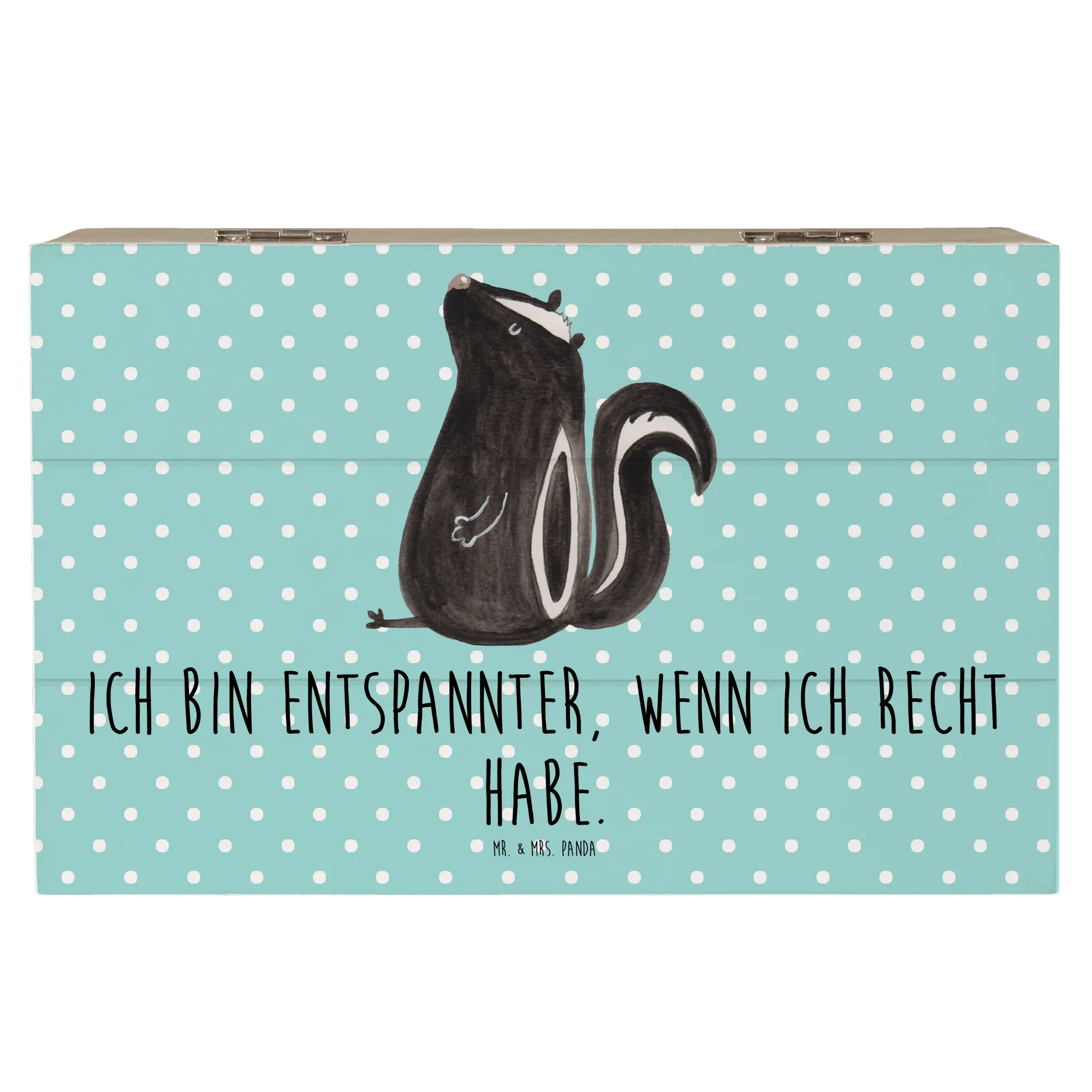 Ob für einen besonderen Menschen oder einfach für dich selbst, diese Kiste wird garantiert Freude bereiten! Der sanfte, türkise Hintergrund verstärkt das fröhliche Design und lässt das Stinktier wunderbar zur Geltung kommen. Verwöhne deine Liebsten mit einem Geschenk, das nicht nur praktisch, sondern auch voller Herz ist. Pflege die Kiste einfach mit einem feuchten Tuch. Diese Holzkiste ist ein kleines Kunstwerk für jeden, der das Besondere liebt und eine Schwäche für gute Sprüche hat.
