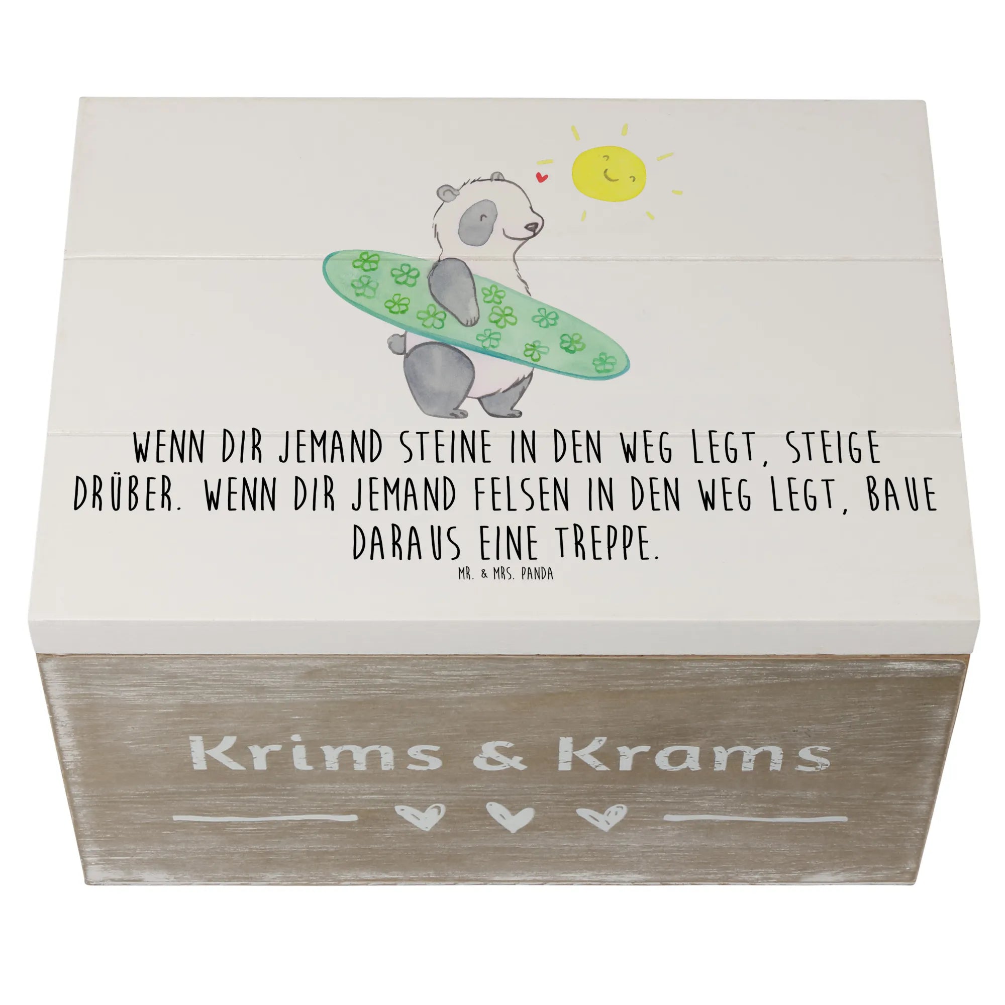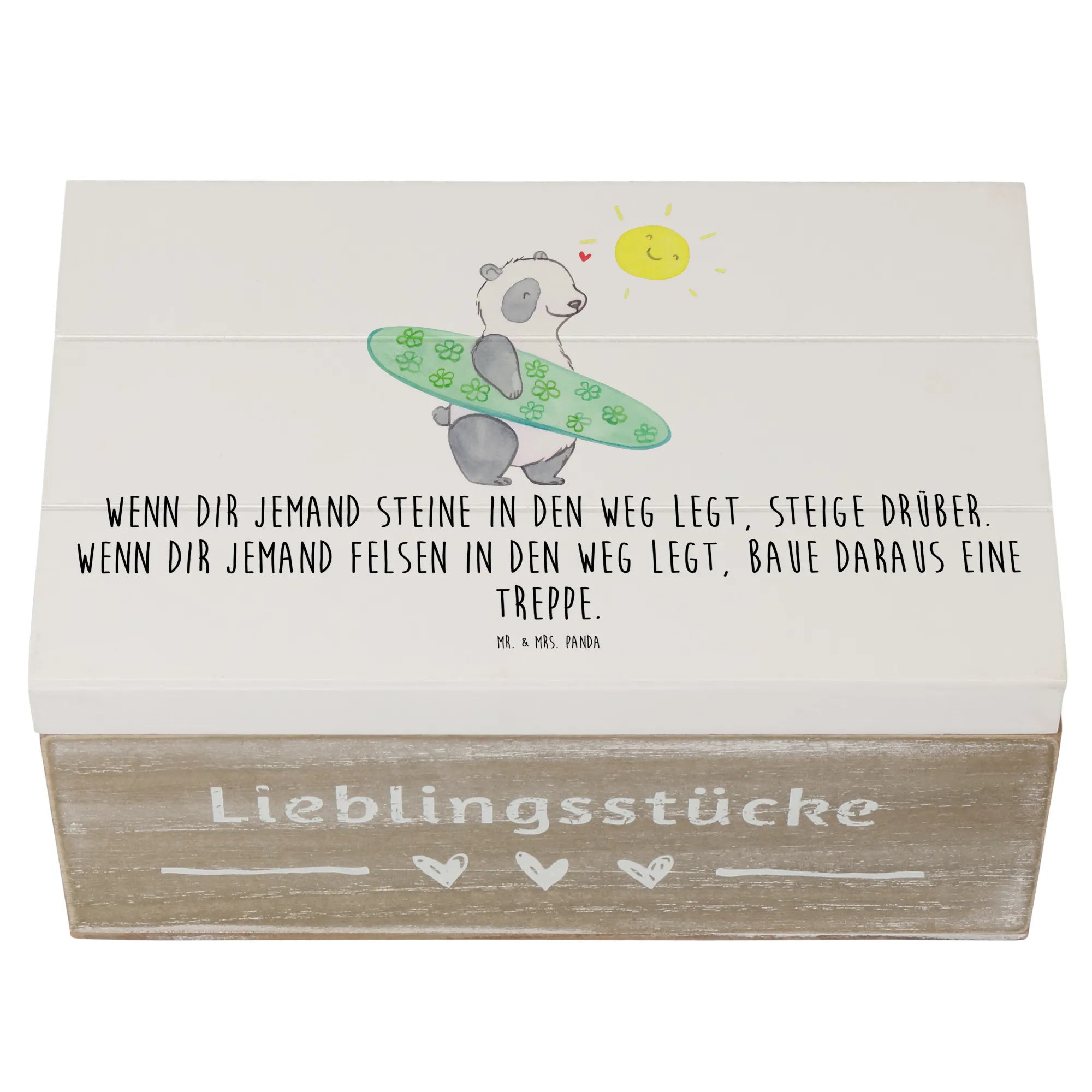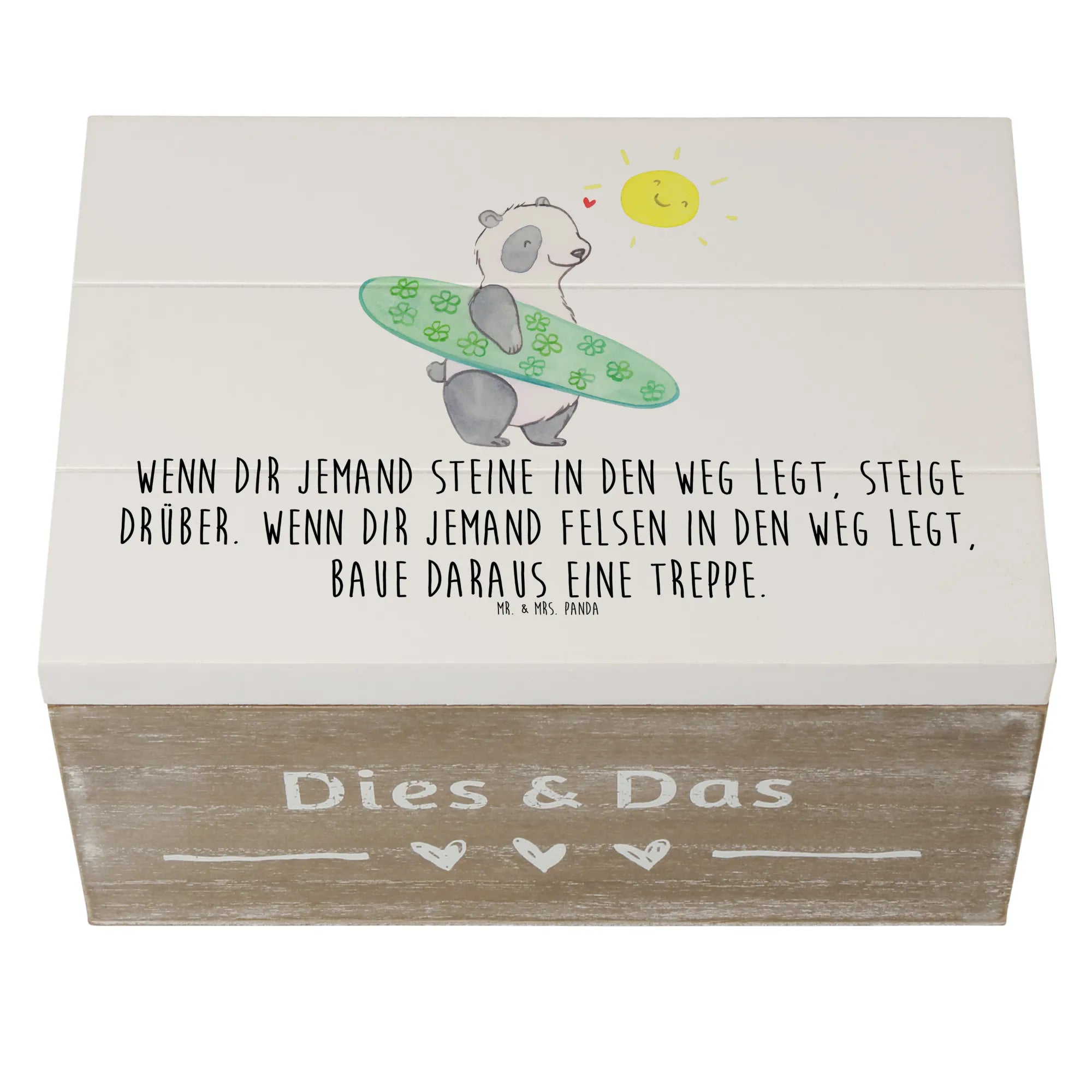 Die Holzkiste 'Stolpersteine im Alltag meistern' aus der Kollektion Mutmacher von Mr. & Mrs. Panda ist das perfekte Geschenk für all jene, die ein wenig Mut und Zuversicht in ihrem Alltag gebrauchen können. Ob als Erinnerungskiste, Aufbewahrungsbox oder einfach nur als schöne Dekokiste – diese liebevoll gestaltete Holzkiste bietet nicht nur ausreichend Platz für wertvolle Schätze, sondern inspiriert auch mit einem wunderbaren Spruch: 'Wenn dir jemand Steine in den Weg legt, steige drüber. Wenn dir jemand Felsen in den Weg legt, baue daraus eine Treppe.'