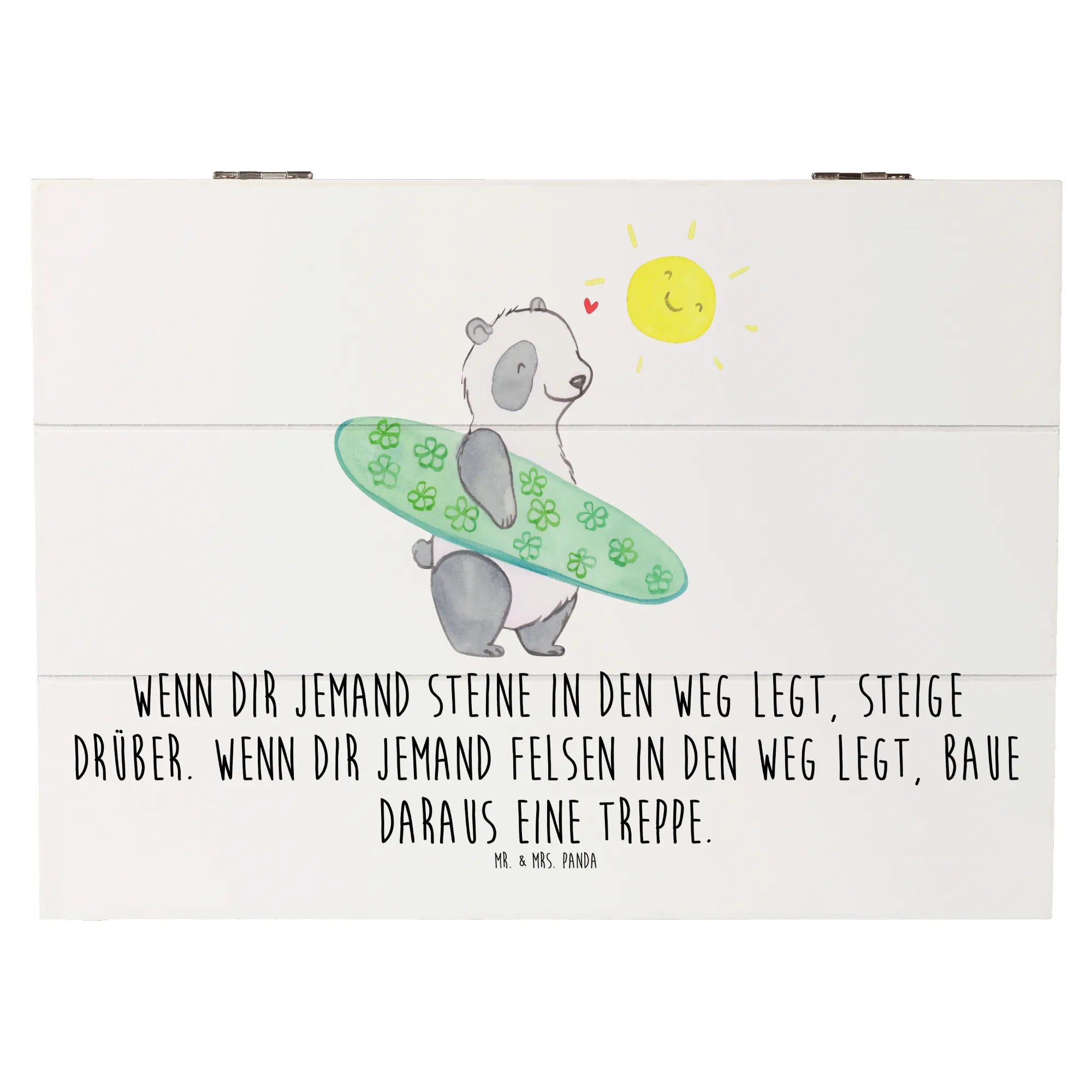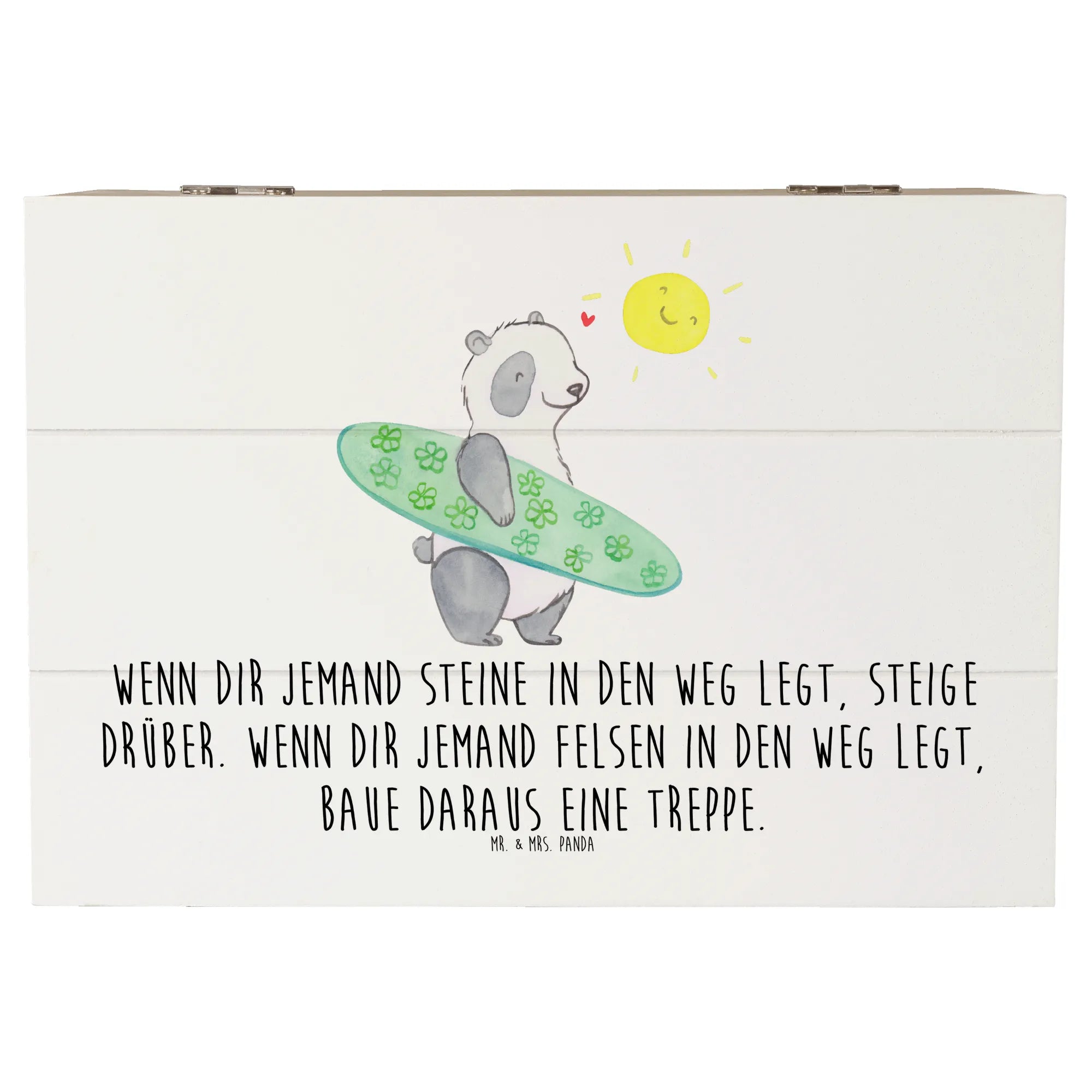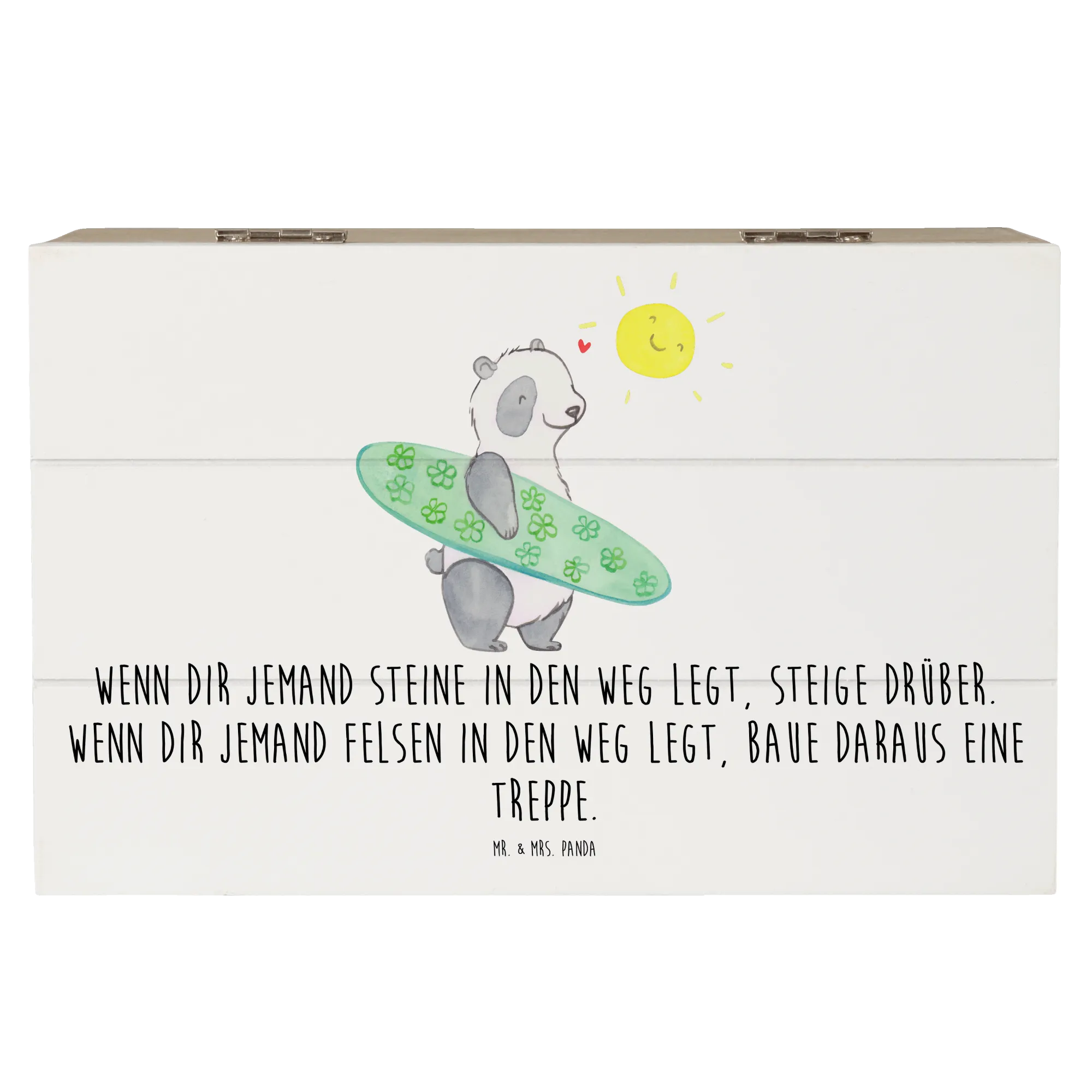 Die Holzkiste 'Stolpersteine im Alltag meistern' aus der Kollektion Mutmacher von Mr. & Mrs. Panda ist das perfekte Geschenk für all jene, die ein wenig Mut und Zuversicht in ihrem Alltag gebrauchen können. Ob als Erinnerungskiste, Aufbewahrungsbox oder einfach nur als schöne Dekokiste – diese liebevoll gestaltete Holzkiste bietet nicht nur ausreichend Platz für wertvolle Schätze, sondern inspiriert auch mit einem wunderbaren Spruch: 'Wenn dir jemand Steine in den Weg legt, steige drüber. Wenn dir jemand Felsen in den Weg legt, baue daraus eine Treppe.'
