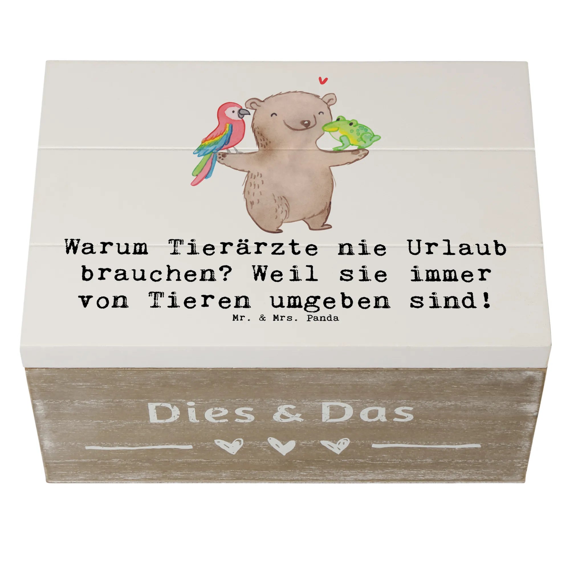 Die wunderschöne Holzkiste von Mr. & Mrs. Panda mit dem niedlichen Motiv für Tierärzte ist das perfekte Geschenk für jeden, der Tiere liebt und in diesem Beruf arbeitet. Sie ist nicht nur ein praktischer Aufbewahrungsort für all die kleinen Schätze und Erinnerungen, die wir im Leben sammeln, sondern auch ein liebevoll gestaltetes Accessoire, das jedem Arbeitsplatz einen persönlichen Touch verleiht. Mit dem Slogan "Warum Tierärzte nie Urlaub brauchen? Weil sie immer von Tieren umgeben sind!" bringt diese Kiste ein Lächeln auf jedes Gesicht.