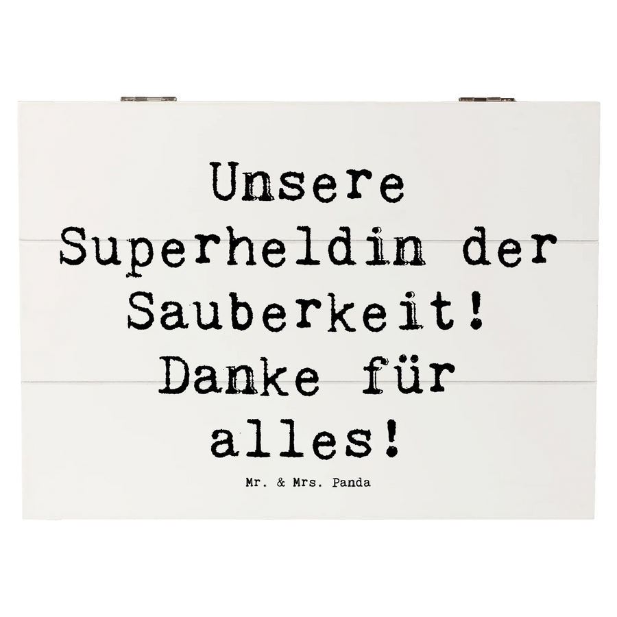 Die wunderschöne Holzkiste Putzfrau von Mr. & Mrs. Panda ist das perfekte Geschenk, um Danke zu sagen. Mit ihrem liebevollen Slogan "Unsere Superheldin der Sauberkeit! Danke für alles!" wird diese Kiste zu einem ganz besonderen Erinnerungsstück.