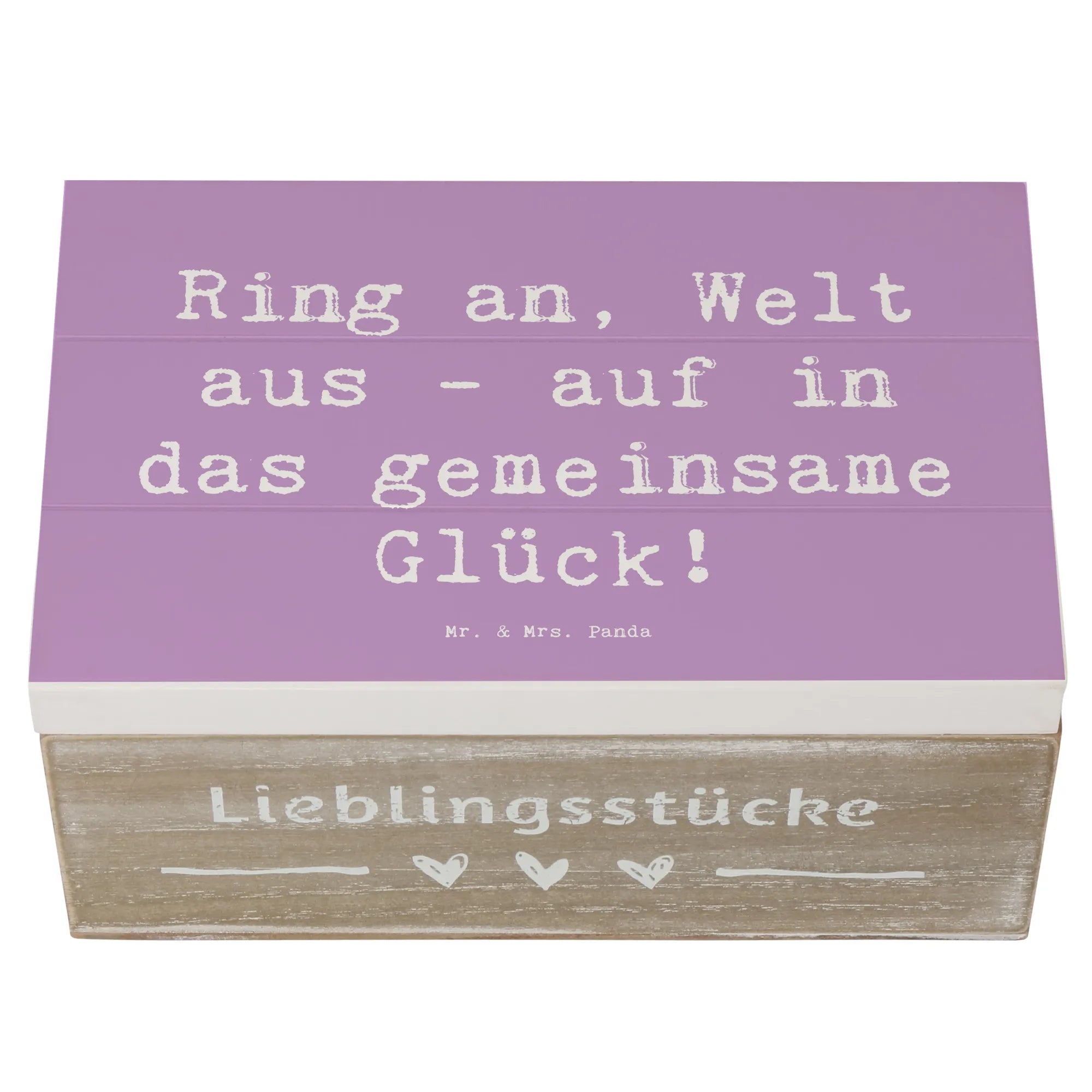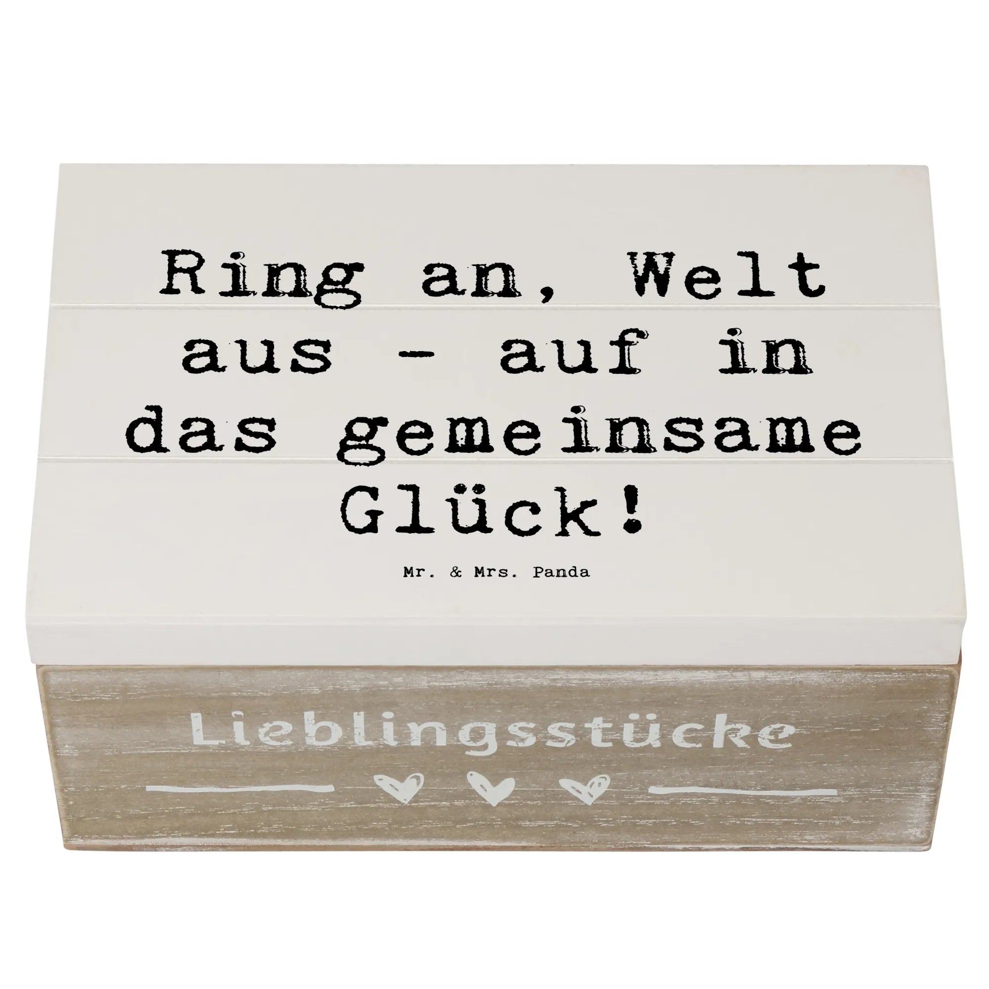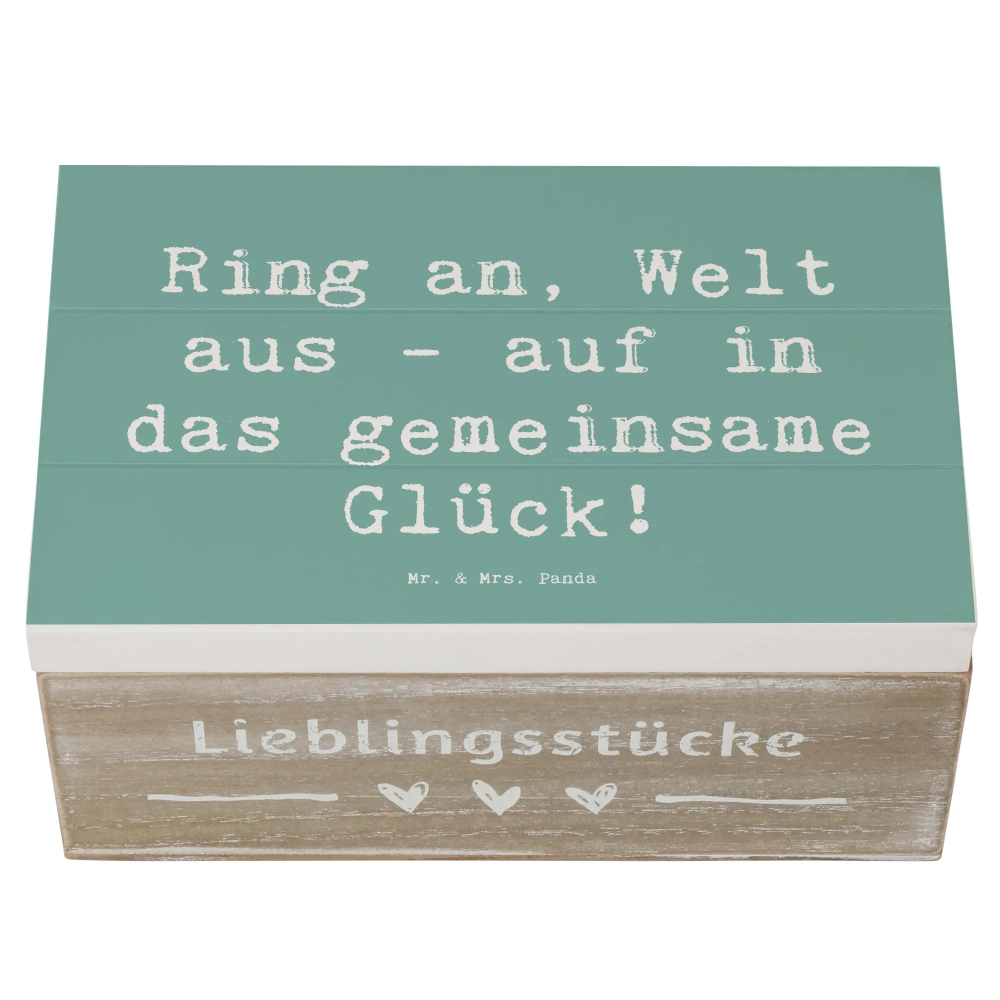 Der liebevoll gestaltete Spruch 'Ring an, Welt aus - auf in das gemeinsame Glück!' macht diese Erinnerungskiste besonders einzigartig und verbindet die Vorfreude auf das gemeinsame Leben.