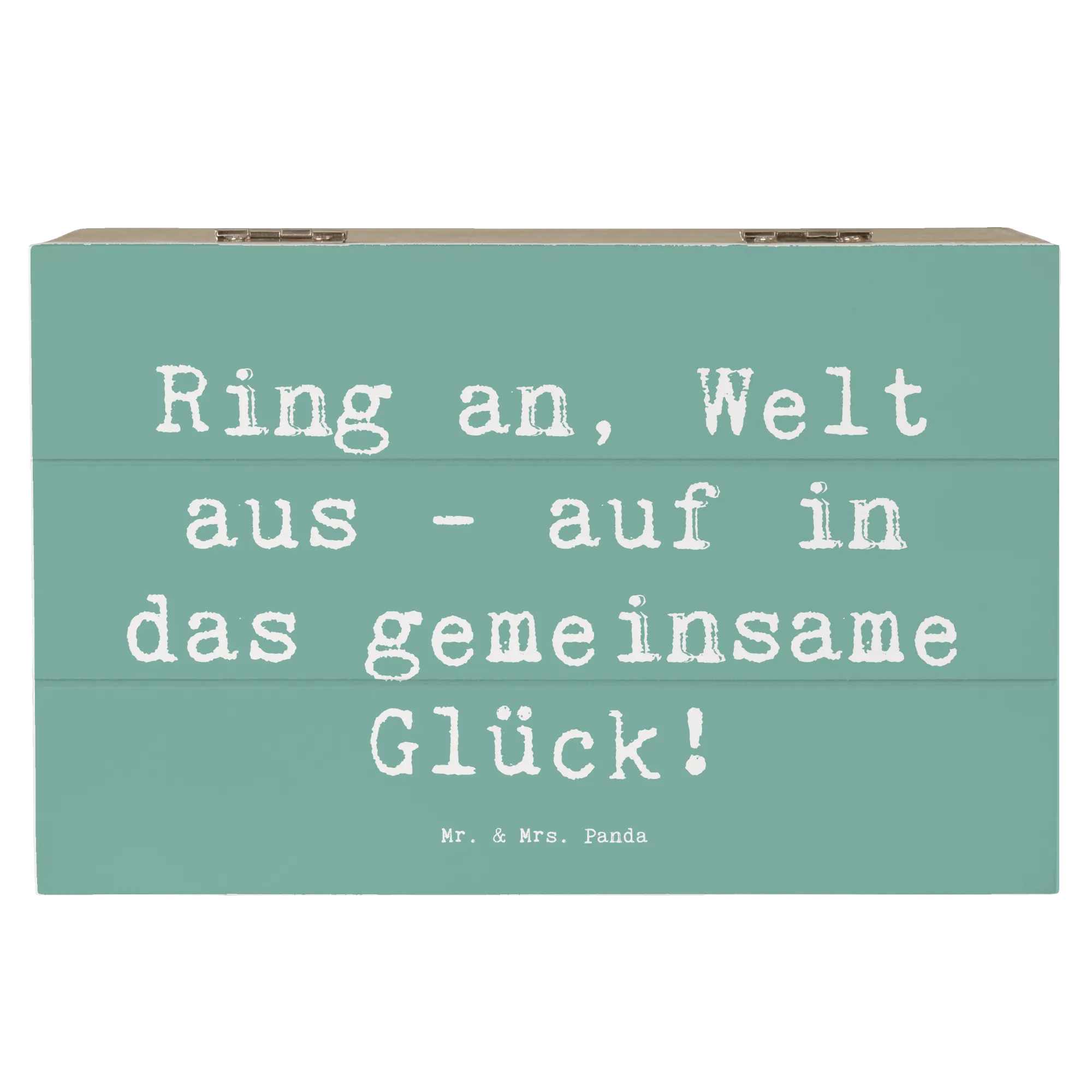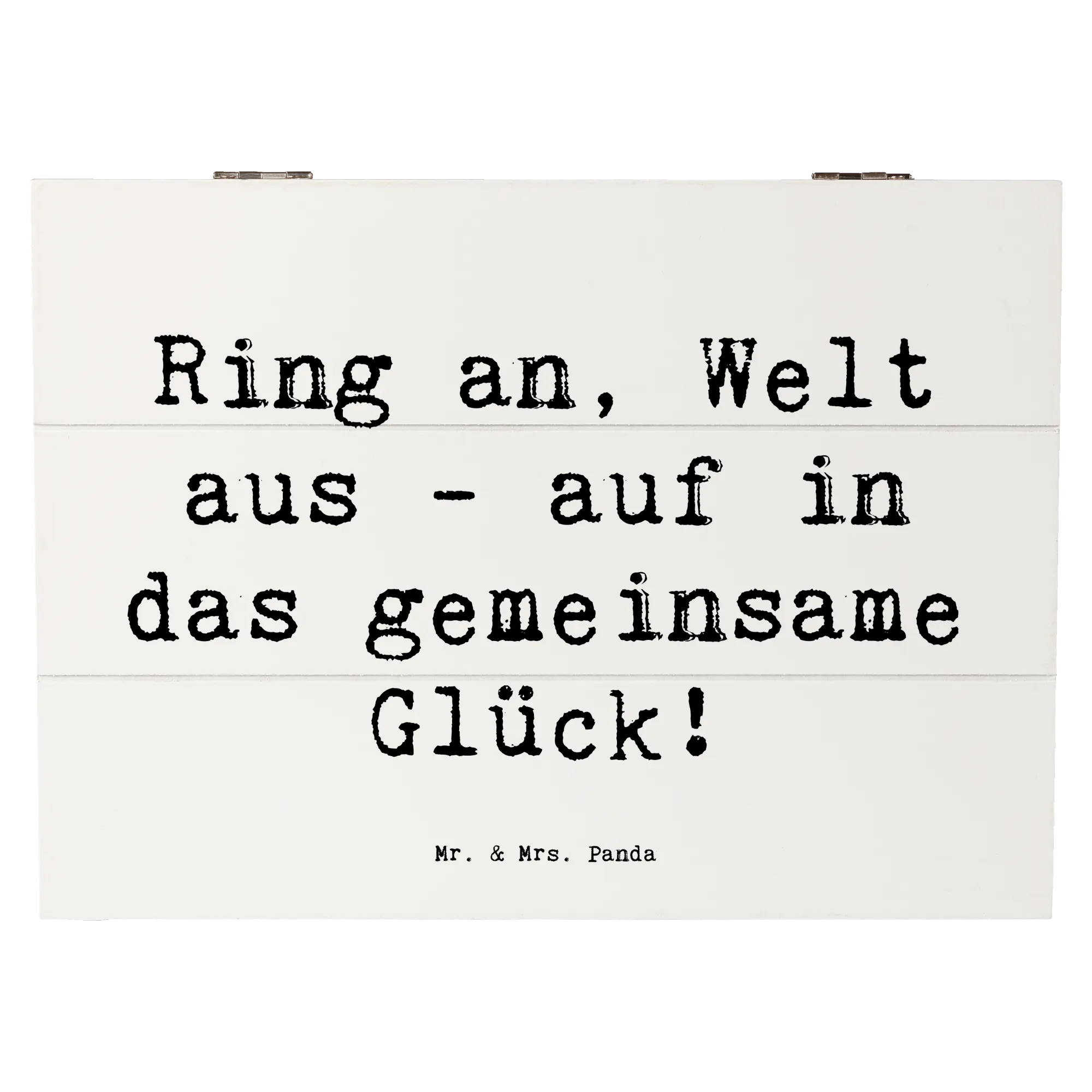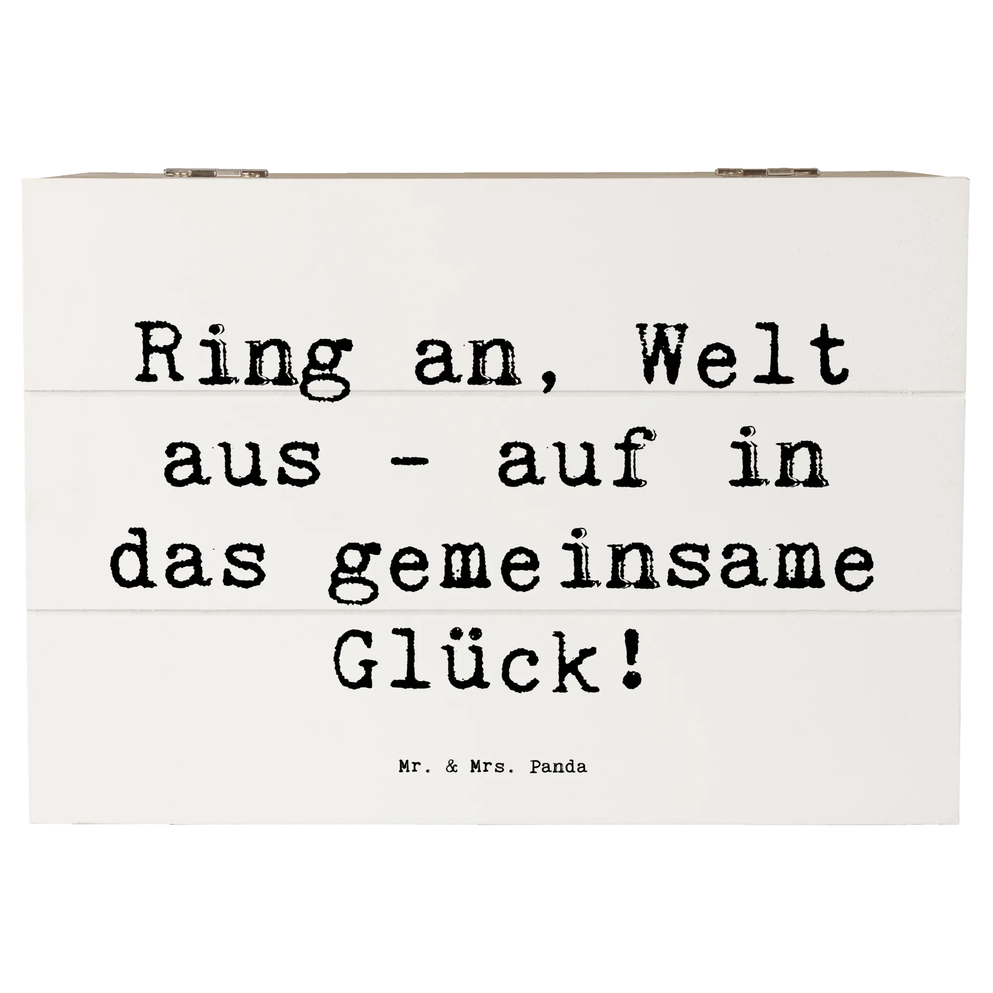 Der liebevoll gestaltete Spruch 'Ring an, Welt aus - auf in das gemeinsame Glück!' macht diese Erinnerungskiste besonders einzigartig und verbindet die Vorfreude auf das gemeinsame Leben.