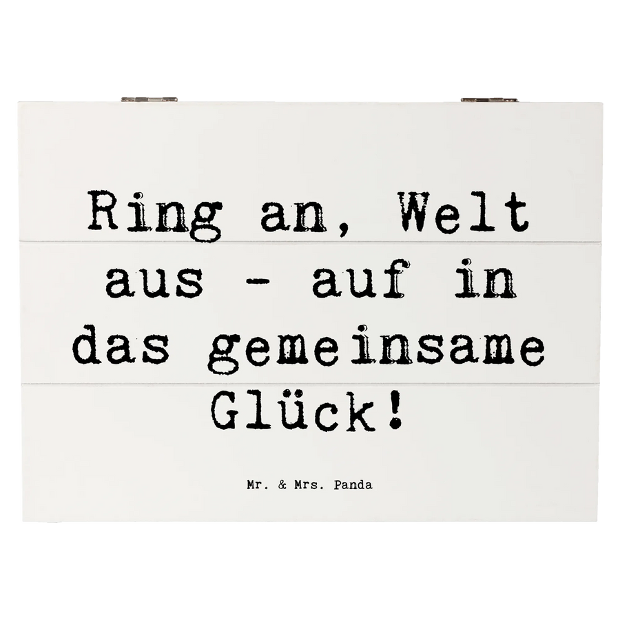 Der liebevoll gestaltete Spruch 'Ring an, Welt aus - auf in das gemeinsame Glück!' macht diese Erinnerungskiste besonders einzigartig und verbindet die Vorfreude auf das gemeinsame Leben.
