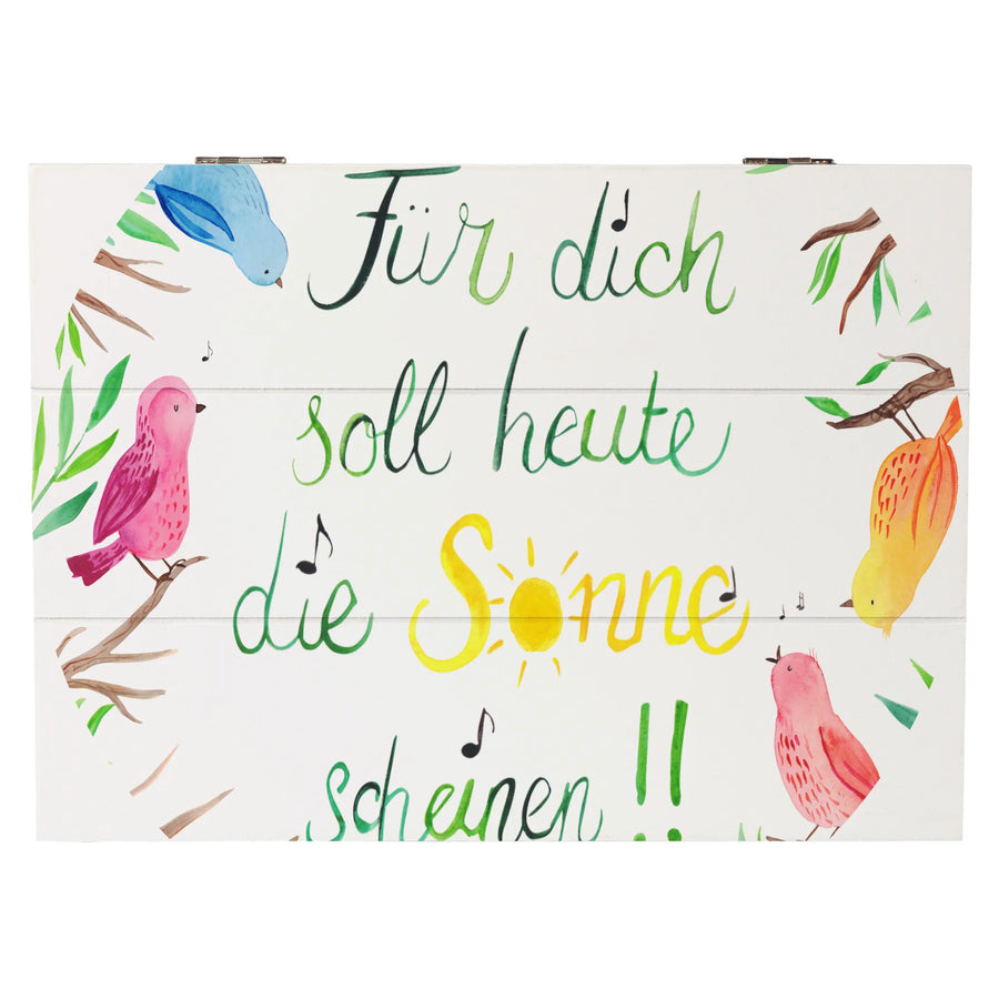 Mit den liebevoll handgezeichneten Vögeln und der strahlenden Sonne lässt sie deine Räume erblühen und versprüht eine positive Botschaft voller Leben. Die Holzkiste misst 25 x 18 cm und ist aus robuster, wasserabweisender Premium Hartfaser gefertigt, die für ihre Langlebigkeit bekannt ist. Damit ist sie auch eine nachhaltige Geschenkbox, die immer wieder verwendet werden kann.