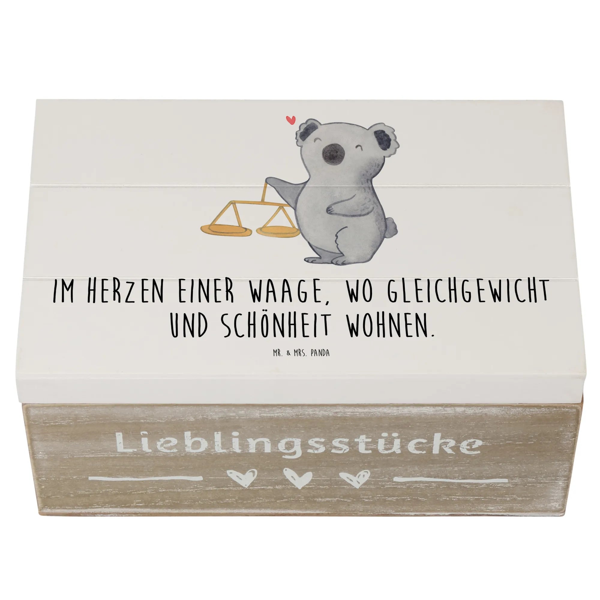 Suchst Du ein Geschenk, das persönlich, hübsch und praktisch zugleich ist? Unsere Holzkiste „Waage“ aus der Sternzeichen-Kollektion von Mr. & Mrs. Panda vereint genau diese Eigenschaften. Das liebevoll von Mrs. Panda handgezeichnete Motiv zeigt einen freundlichen Koala neben einer klassischen Balkenwaage und trägt den schönen Spruch: Im Herzen einer Waage, wo Gleichgewicht und Schönheit wohnen.